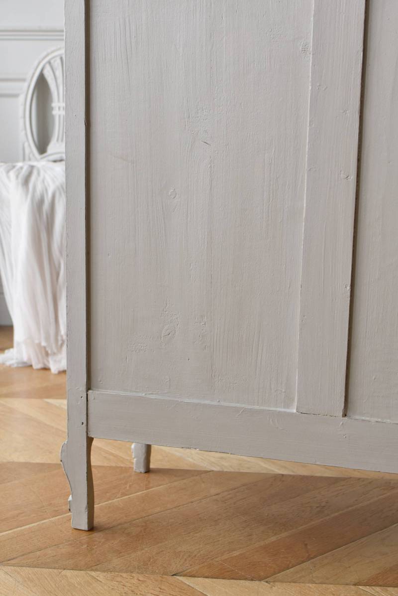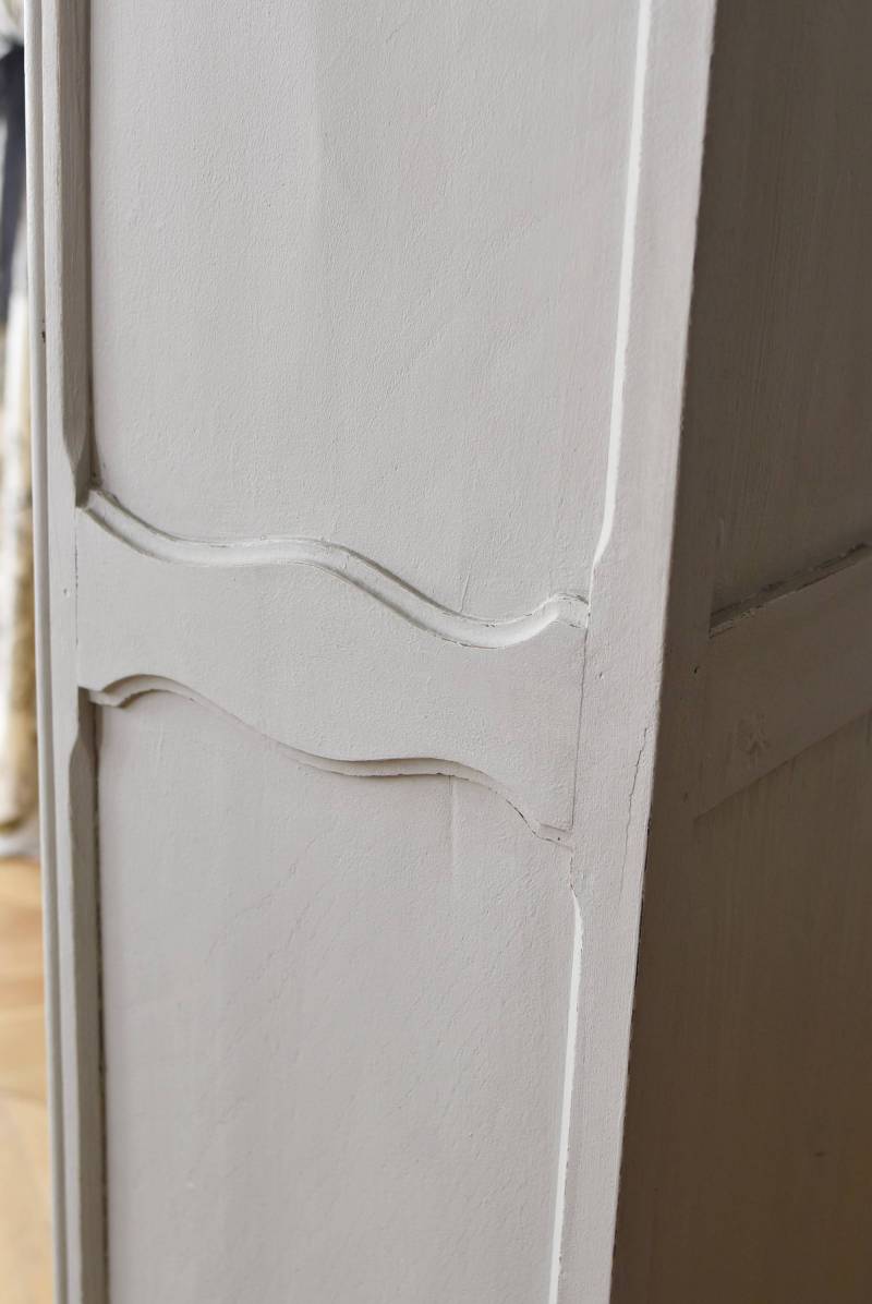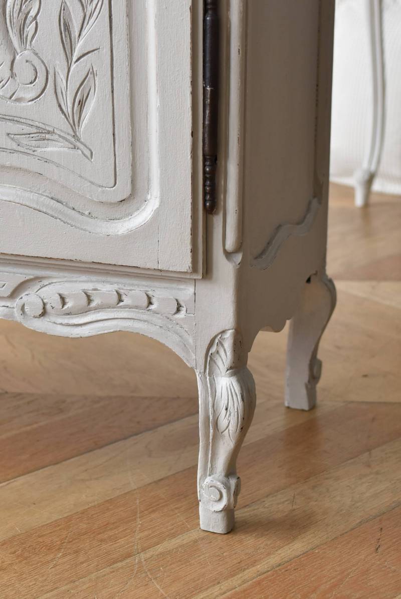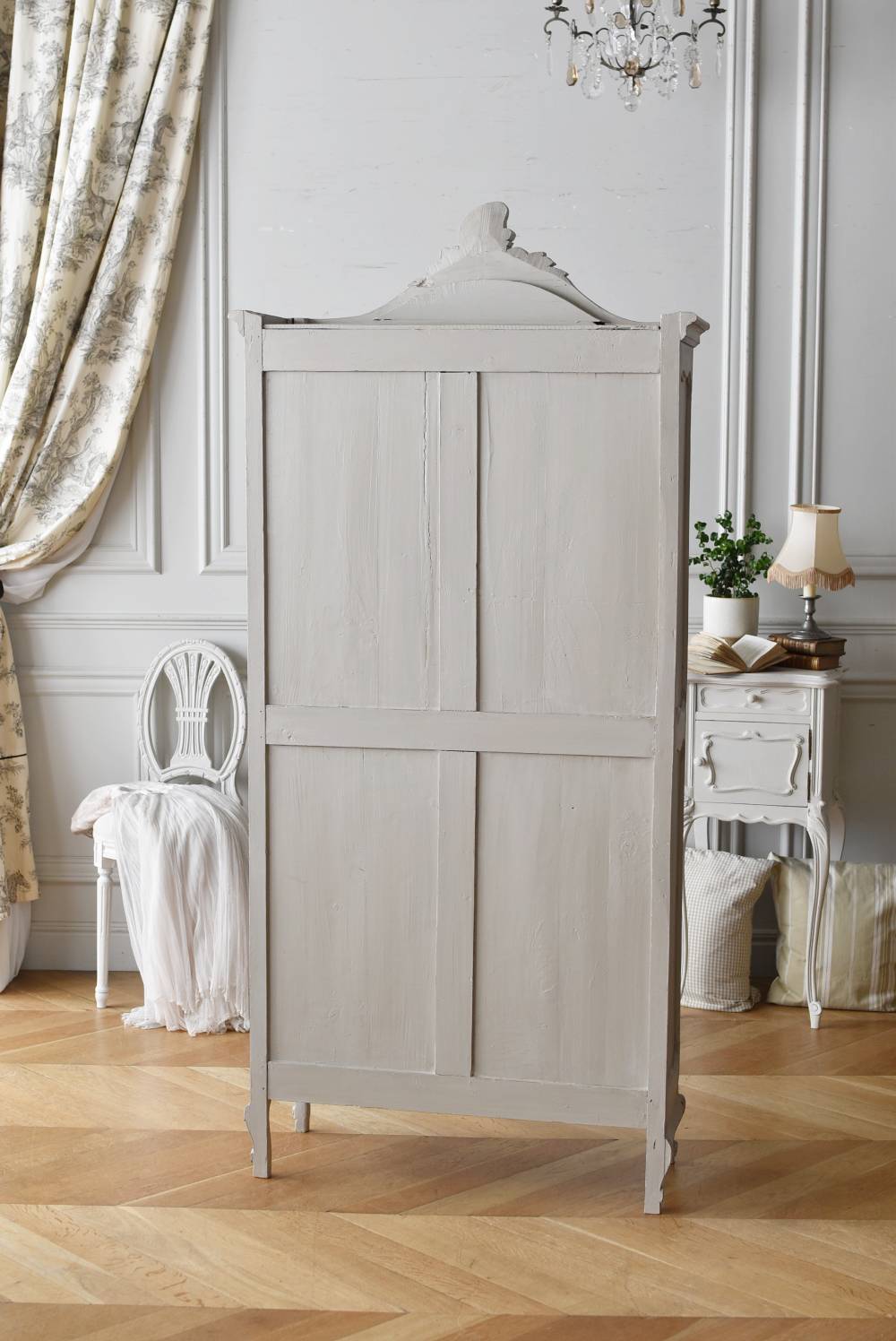 ロカイユや植物モチーフとなった彫り模様が豪華に施されており、しなやかなカーブを描いたトップにも大きな装飾があしらわれ、思わず目を奪われるような存在感があります。先端がくるんと巻かれた脚元まで優美な雰囲気が漂い、広々としたガラス面も相まって程よい抜け感のある佇まいです。