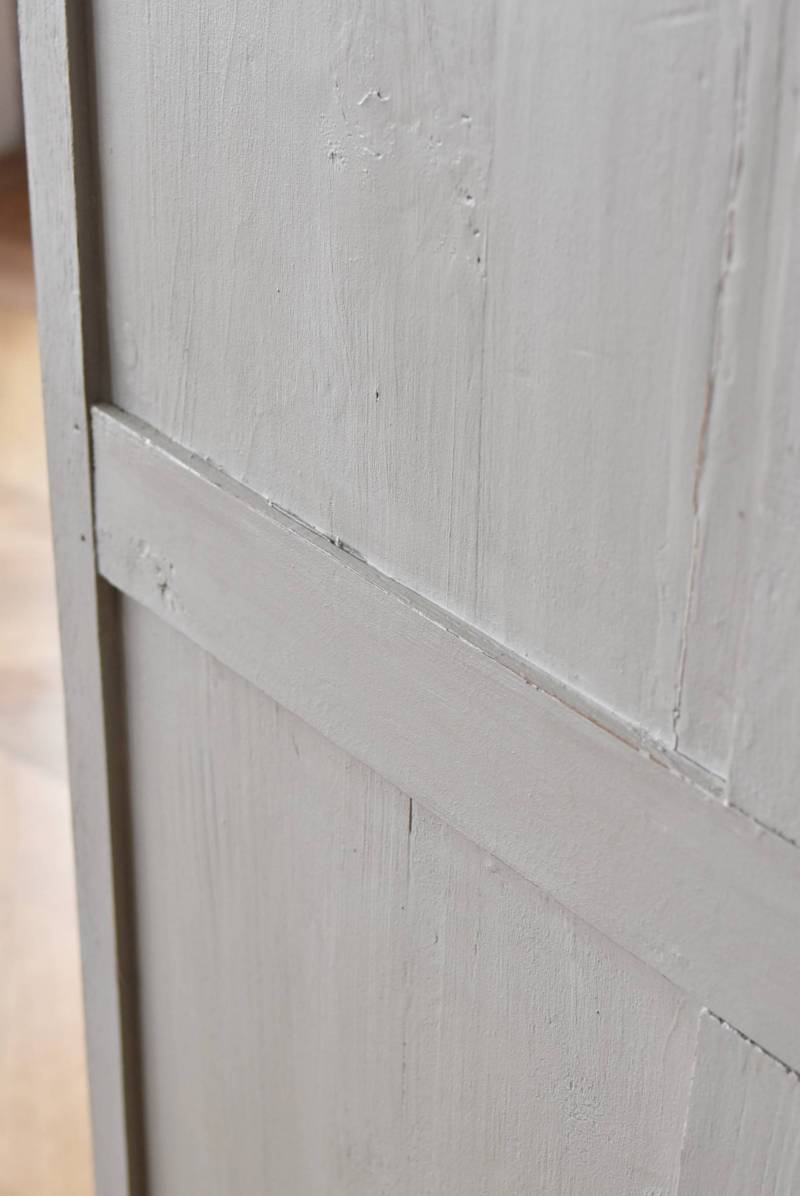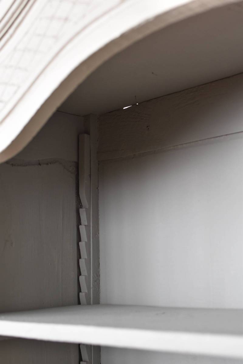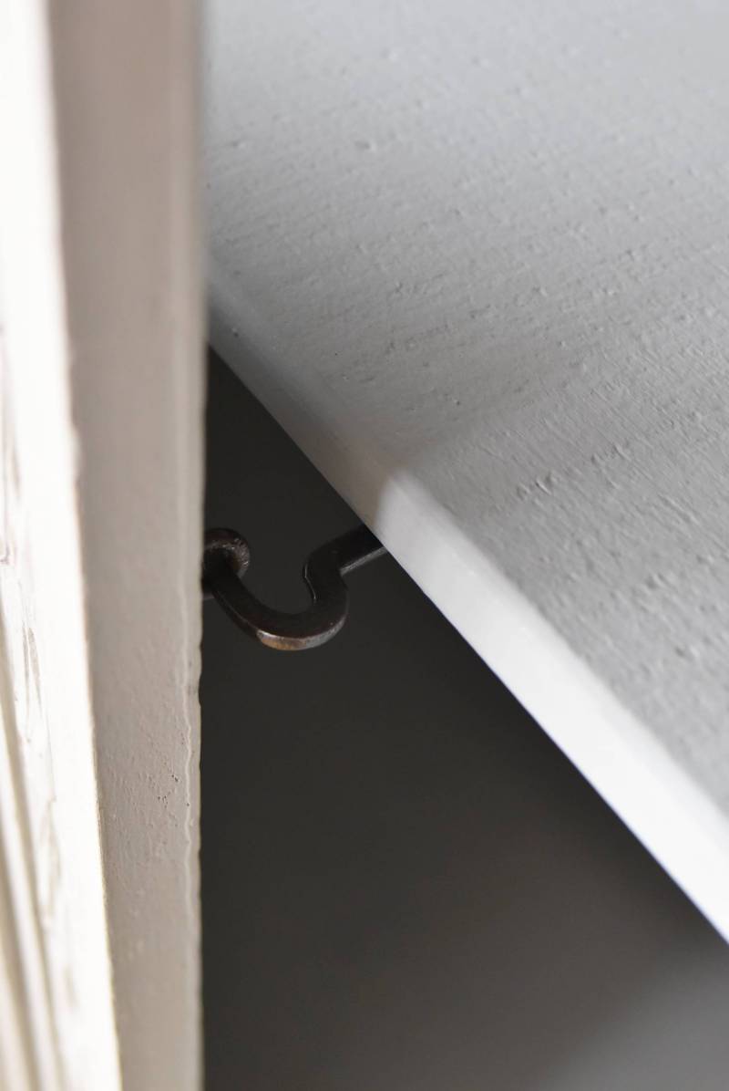 反りによる歪みや扉に若干の隙間が見受けられますがスムーズに開閉出来、鍵は施錠可能です。棚板の高さ調節も出来ます。右側のガラス面のみ古いものが残っており、揺らぎのある幻想的な表情が楽しめます。 W 約84cm