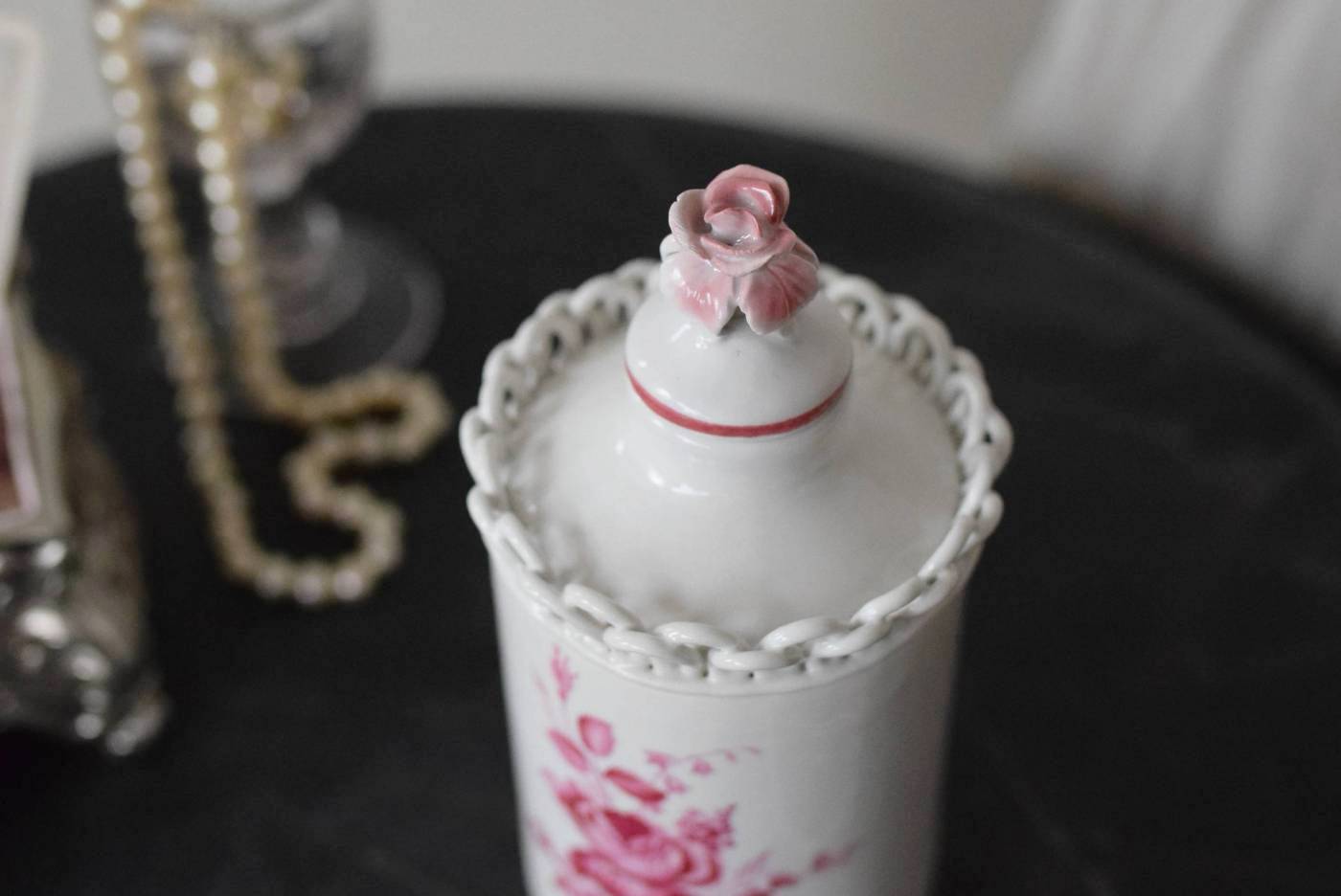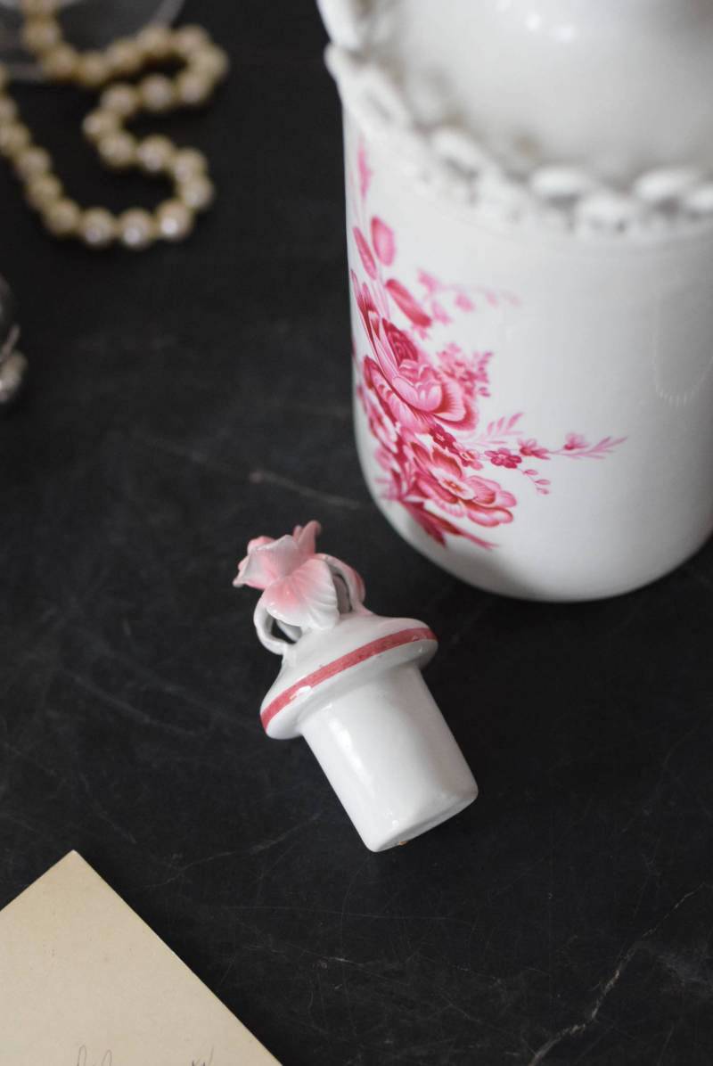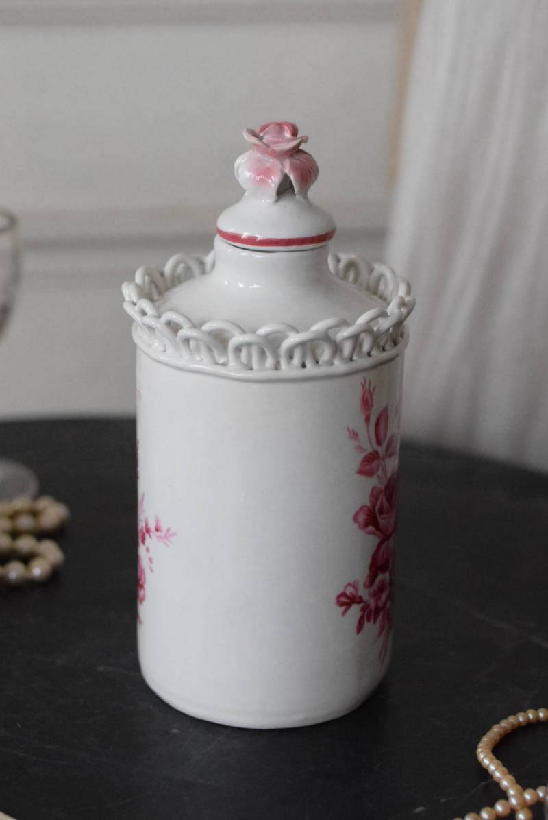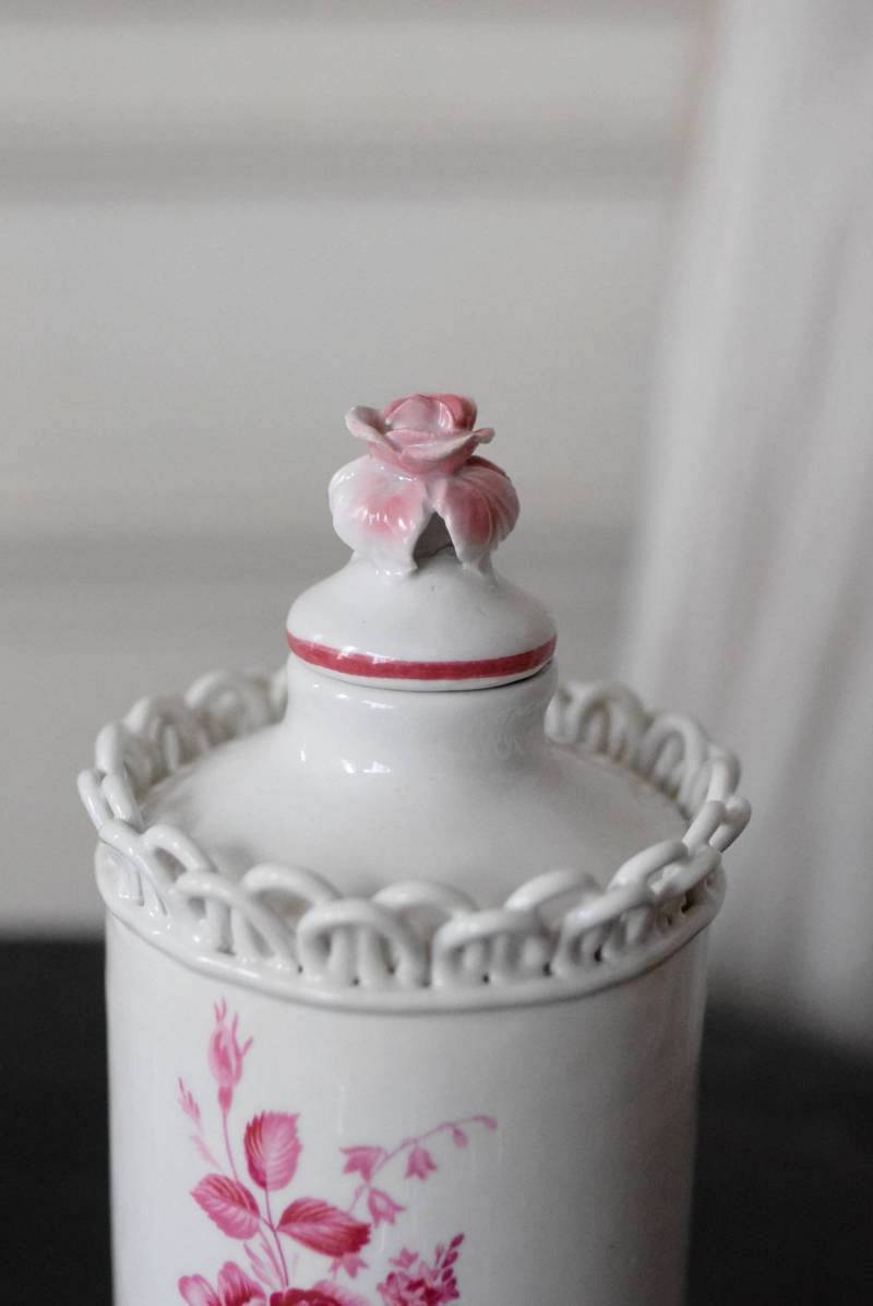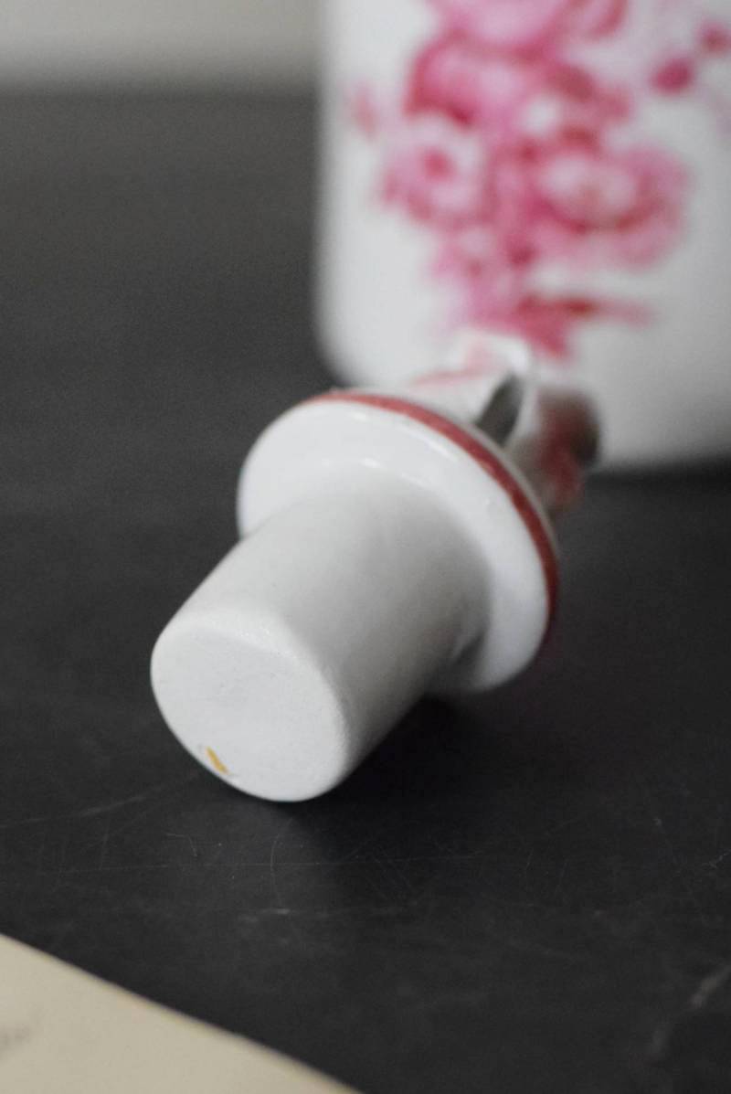 口が狭く小さめの蓋がついており、おそらく香水や化粧水など入れていたものでしょうか?優しい白をベースに、ワインレッド色がアクセントとなり、華やかで優雅なデザインです。側面には美しい花々が描かれ、蓋の持ち手部分は、花びらそのもののような繊細で可愛らしい姿。さらにその周りを彩る、ループ編みのようなデザインも印象的です。
