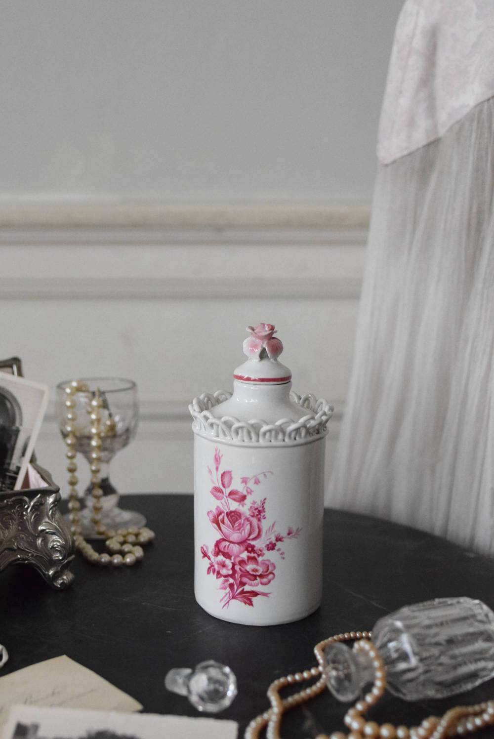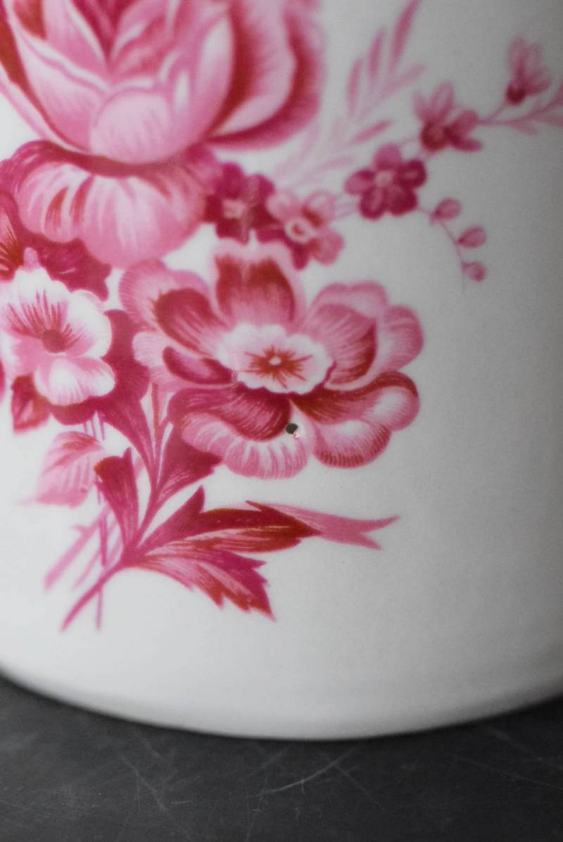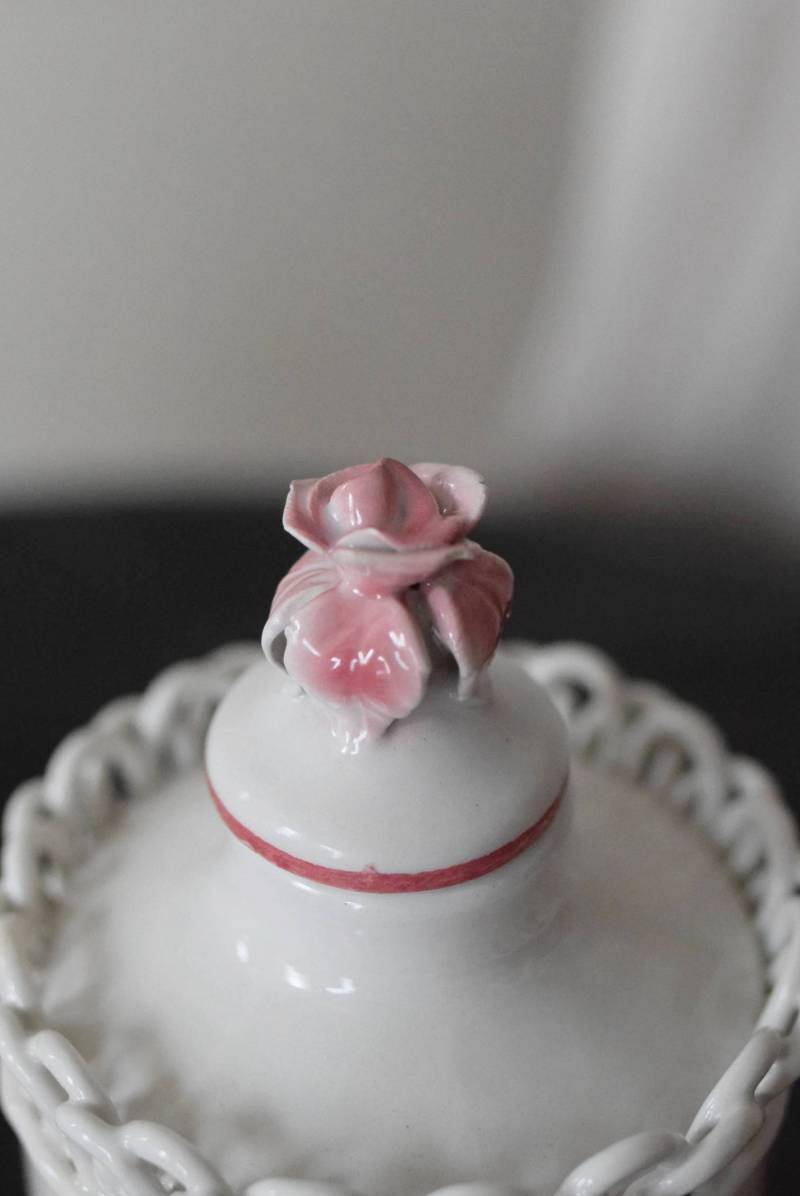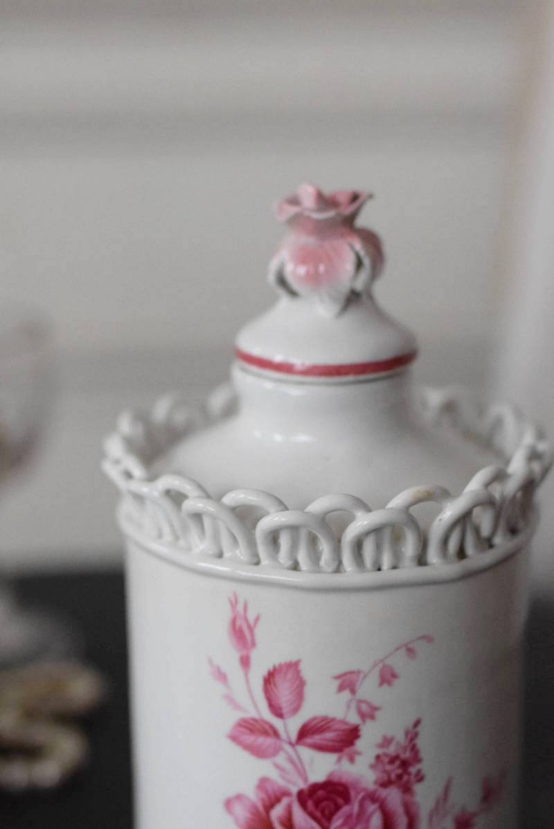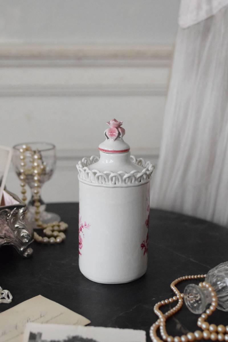 口が狭く小さめの蓋がついており、おそらく香水や化粧水など入れていたものでしょうか?優しい白をベースに、ワインレッド色がアクセントとなり、華やかで優雅なデザインです。側面には美しい花々が描かれ、蓋の持ち手部分は、花びらそのもののような繊細で可愛らしい姿。さらにその周りを彩る、ループ編みのようなデザインも印象的です。