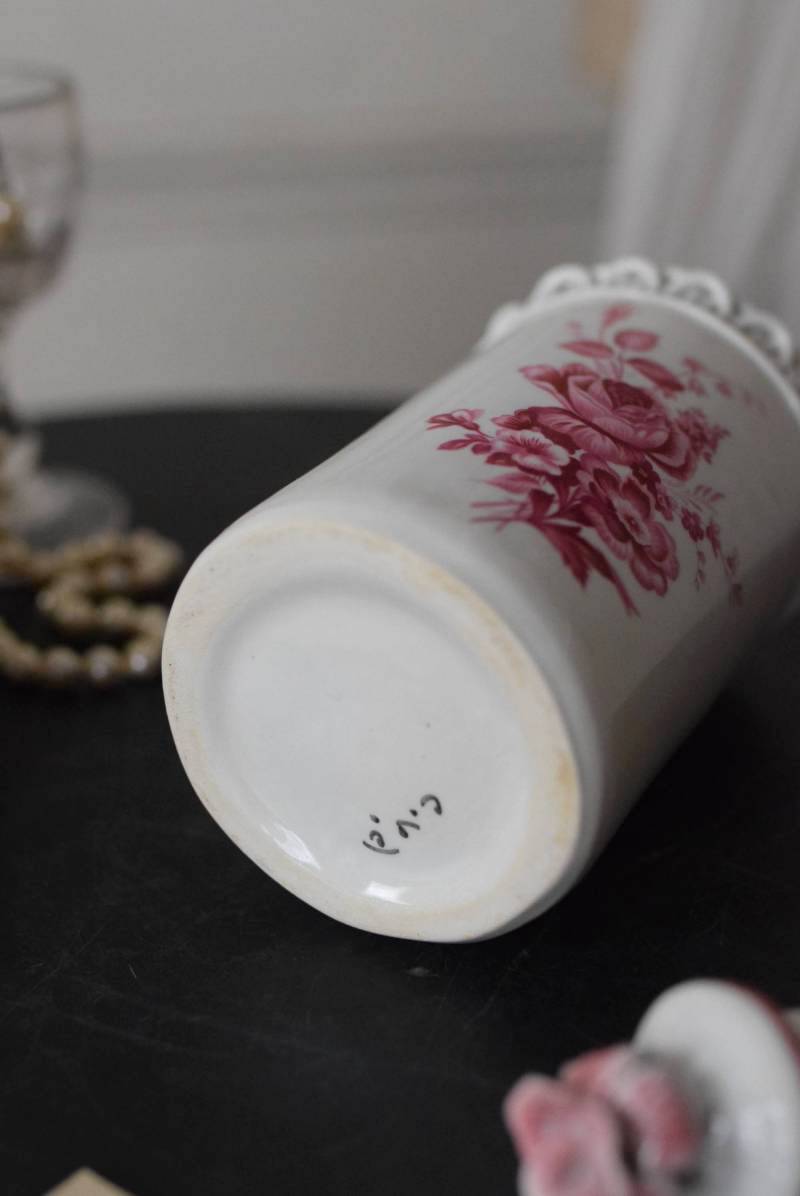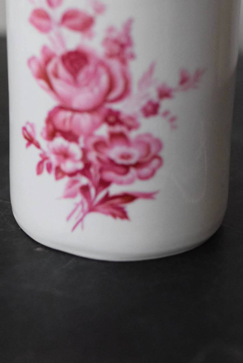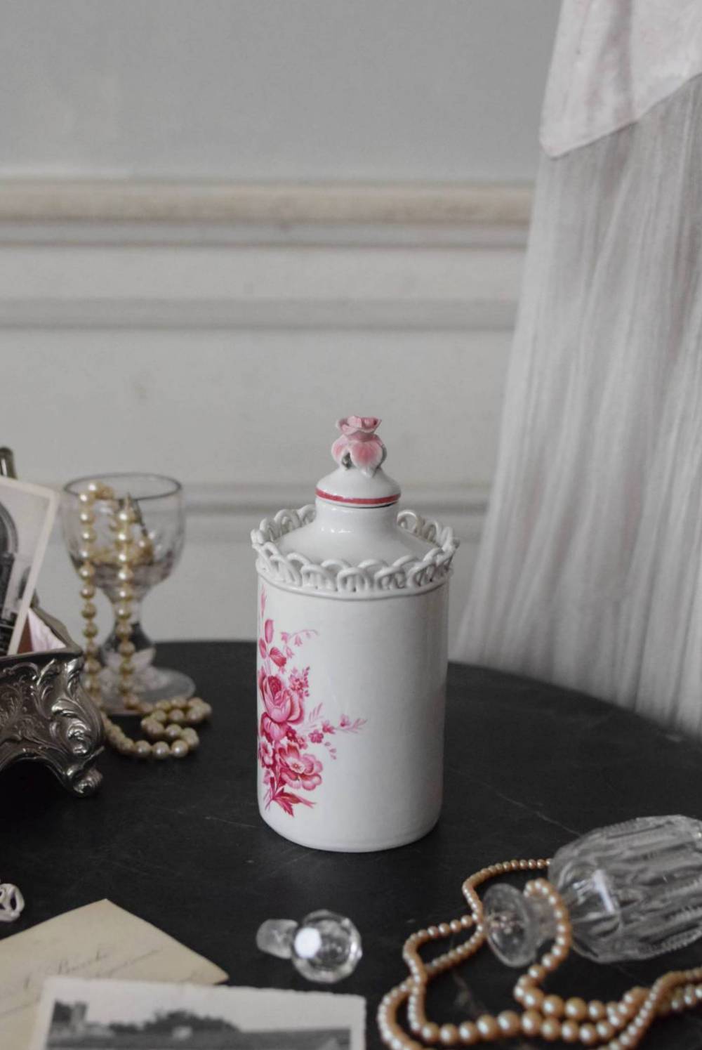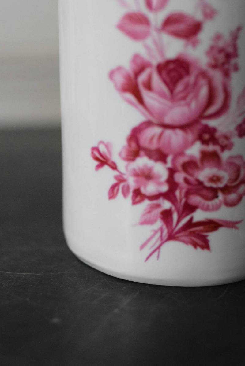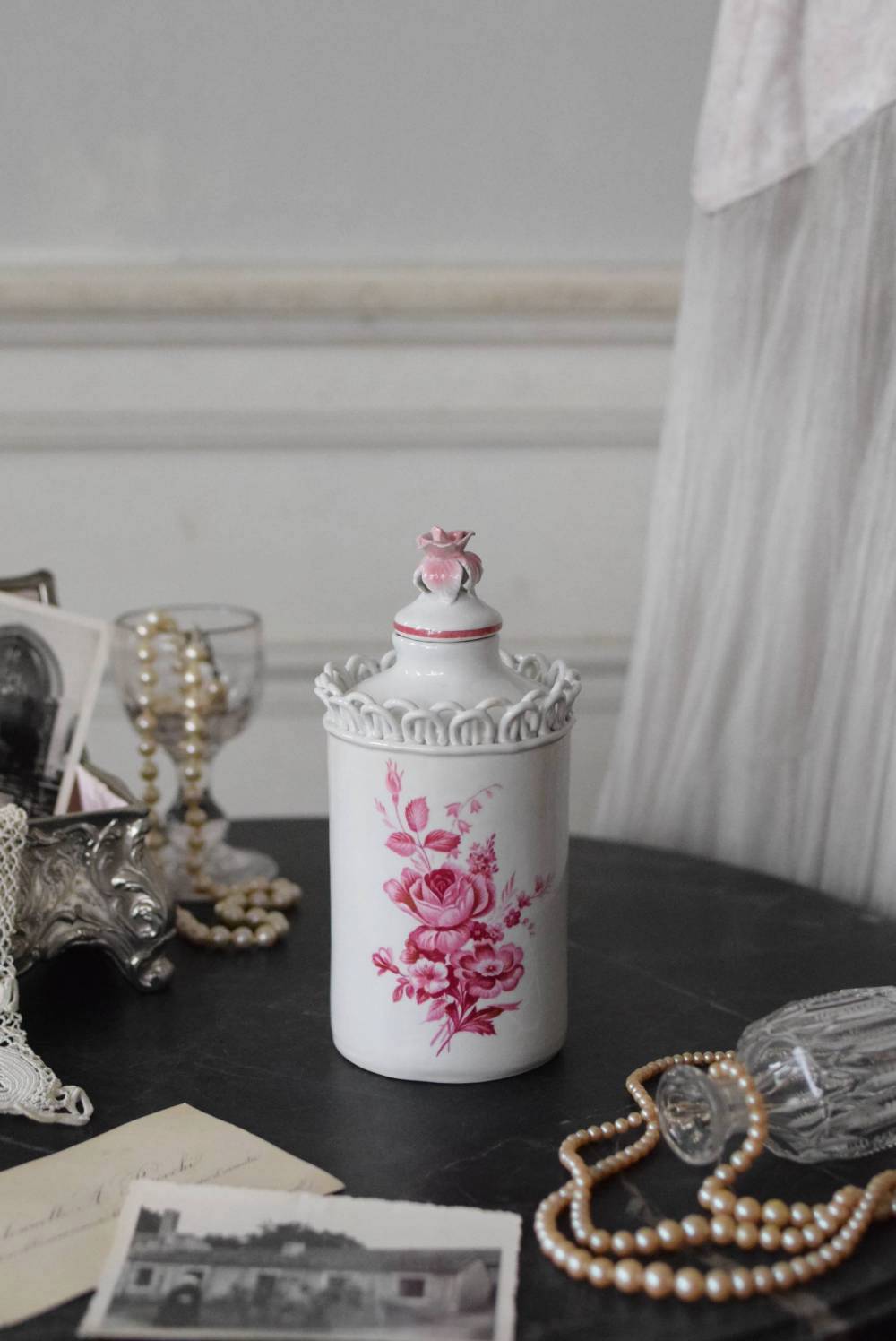 口が狭く小さめの蓋がついており、おそらく香水や化粧水など入れていたものでしょうか?優しい白をベースに、ワインレッド色がアクセントとなり、華やかで優雅なデザインです。側面には美しい花々が描かれ、蓋の持ち手部分は、花びらそのもののような繊細で可愛らしい姿。さらにその周りを彩る、ループ編みのようなデザインも印象的です。