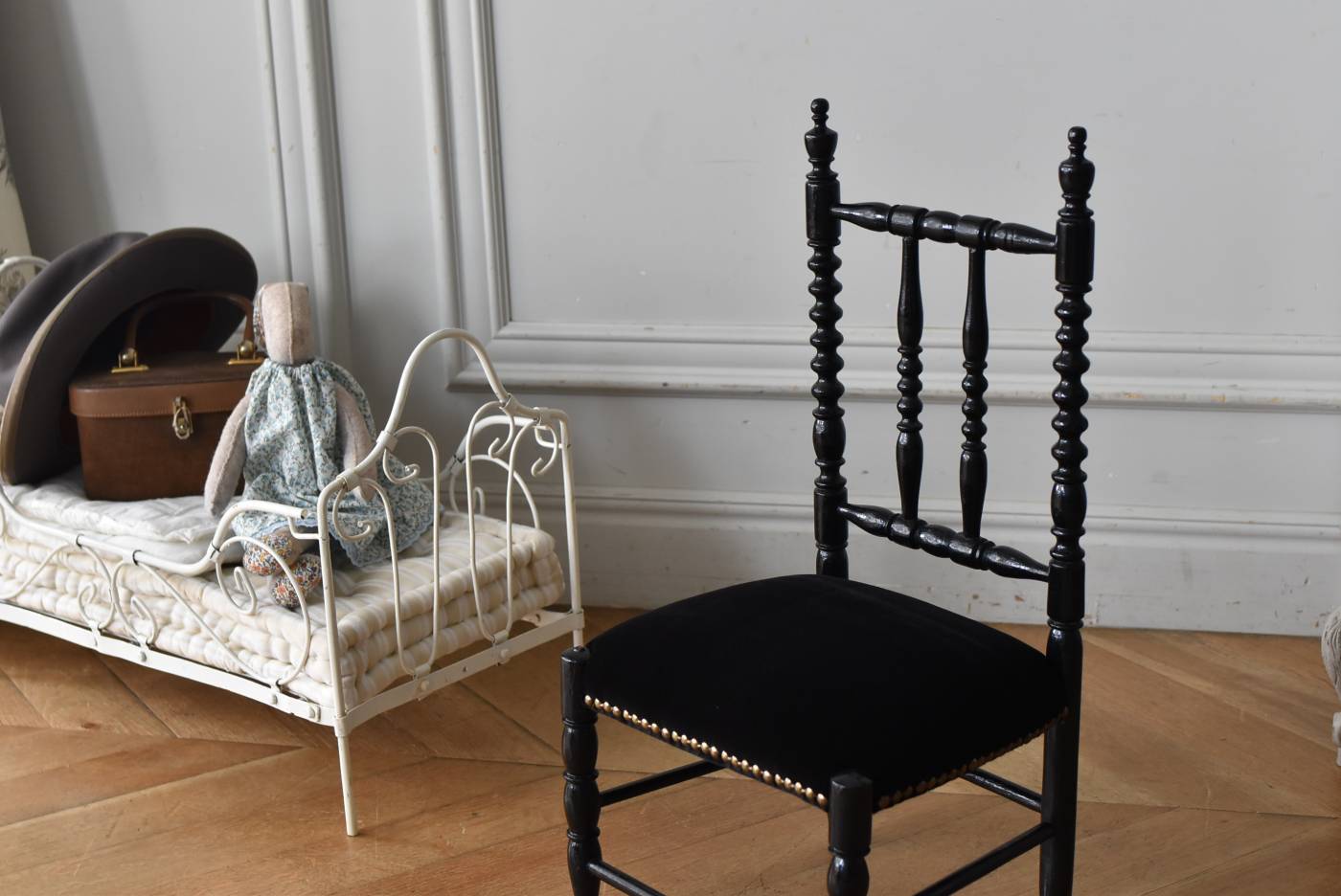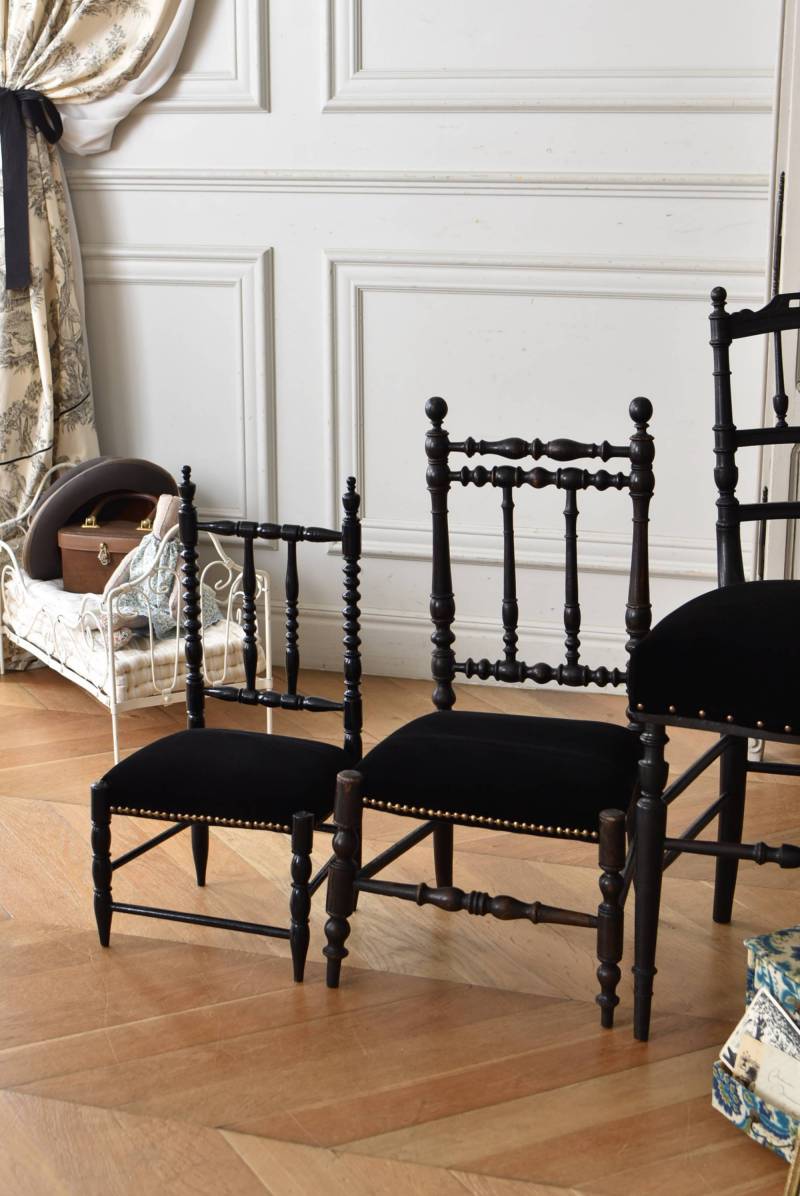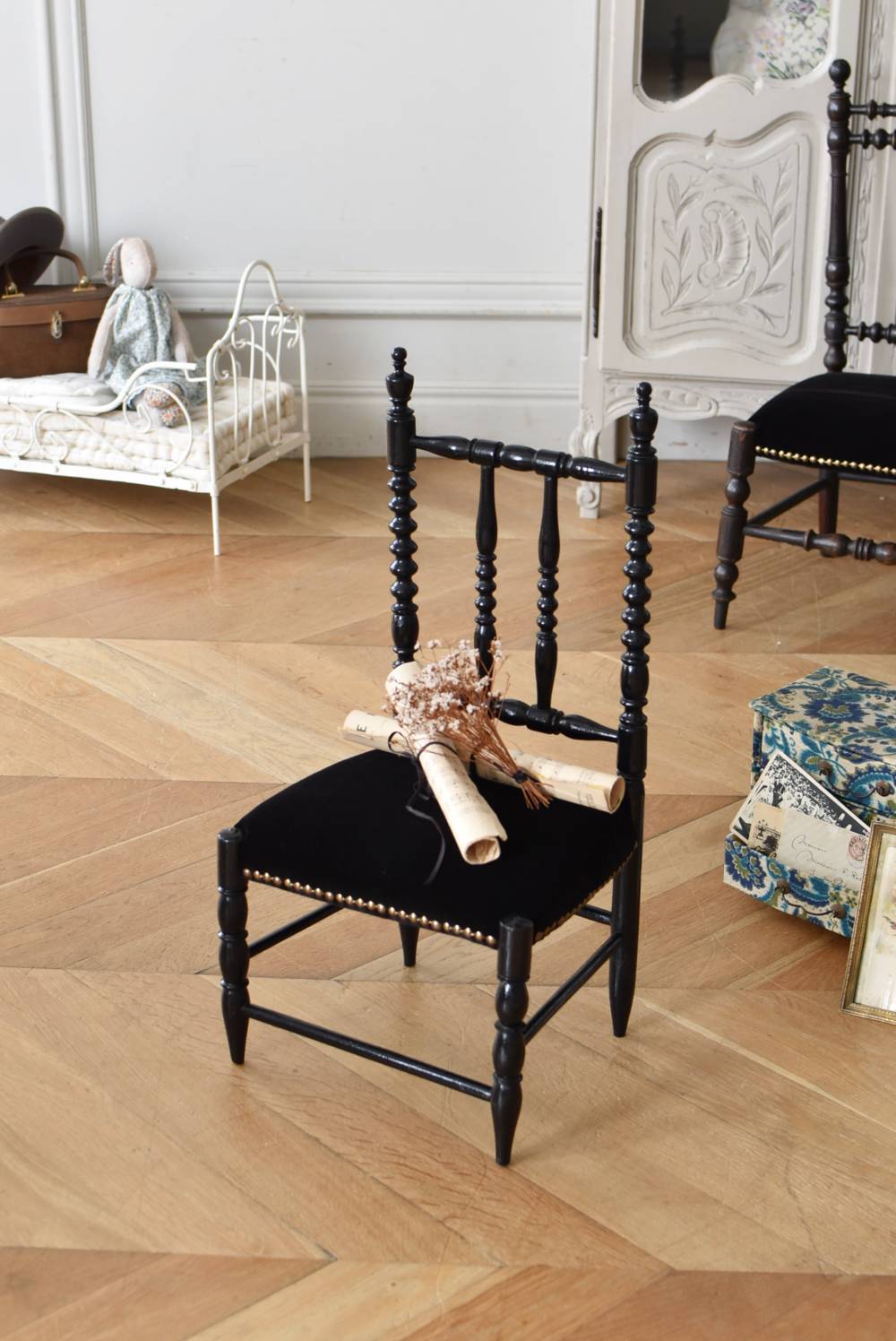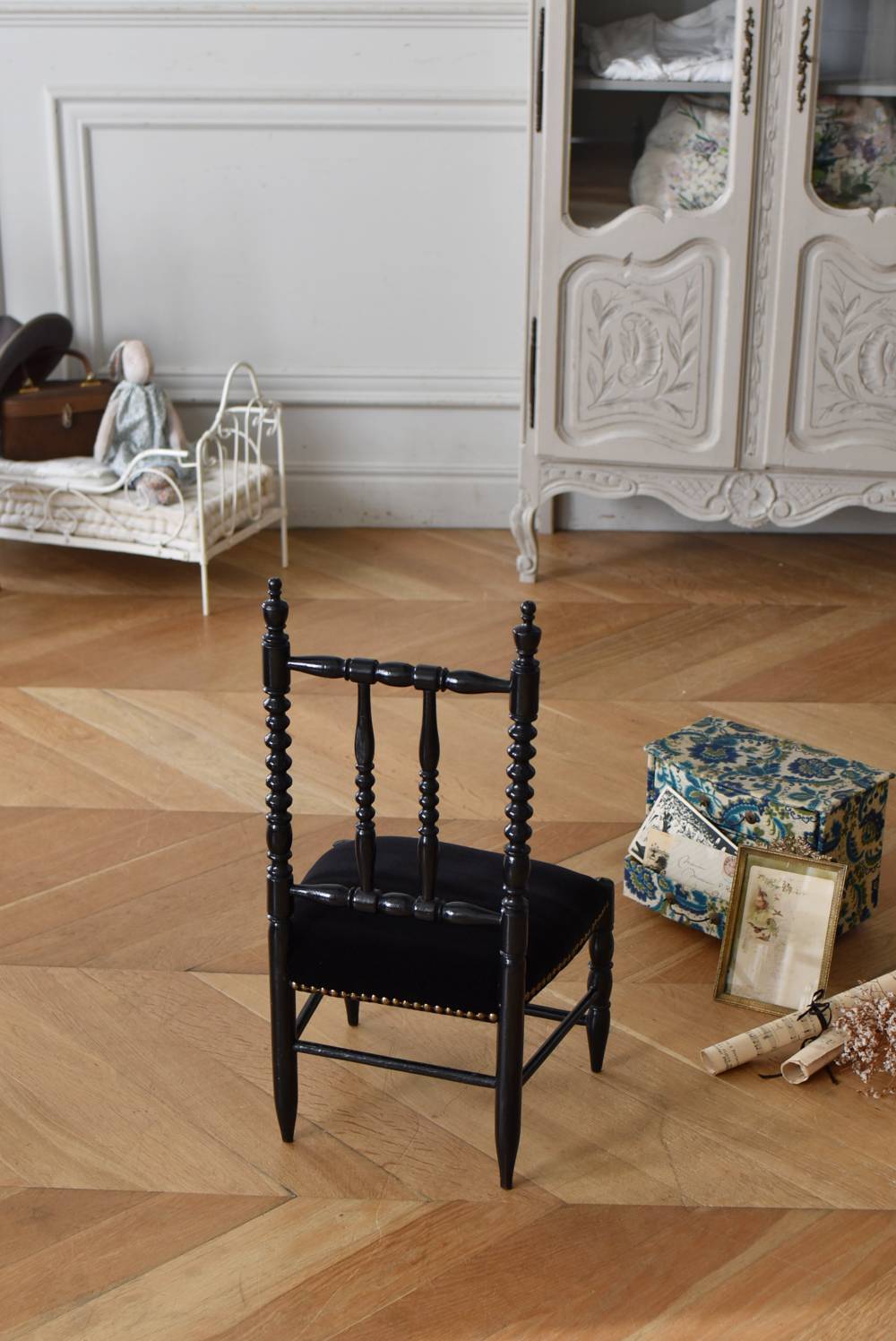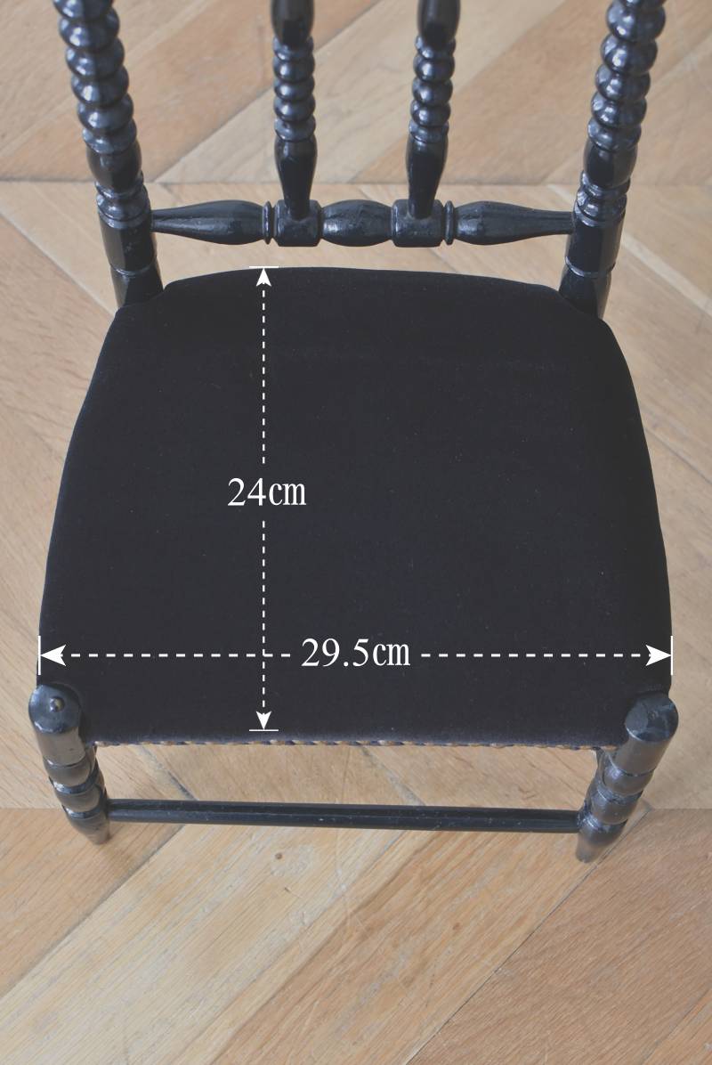 フランスのアンティークチャイルドチェア。 背もたれサイドのボビンを重ねたかのようなポコポコと立体感のあるラインが特徴的で、直線的なラインが組み合わされたスタイリッシュなデザインです。脚先がキュッと細くなったシルエットが凛とした姿で、艶やかなブラックカラーが高貴な印象をもたらしてくれます。 フレームは一度バラして組み直しを行なっています。手触りの良いファブリックは新しく張り替え、中もウレタンに交換しています。比較的小ぶりなサイズなので卓上においてディスプレイしてもバランスが良く、丁寧な作りに思わず眺めていたくなりそうです。 W 約30.5cm D 約26cm H 約59.5cm 座面までH 約25cm