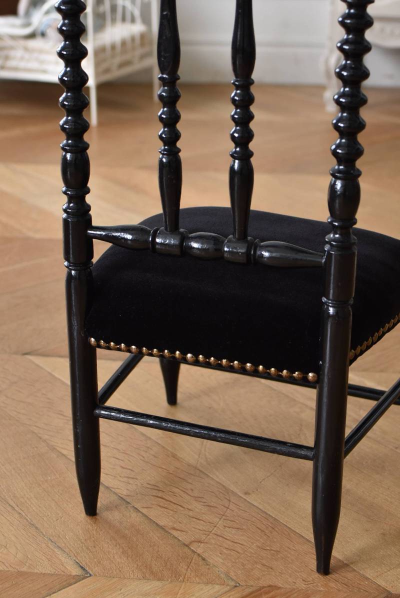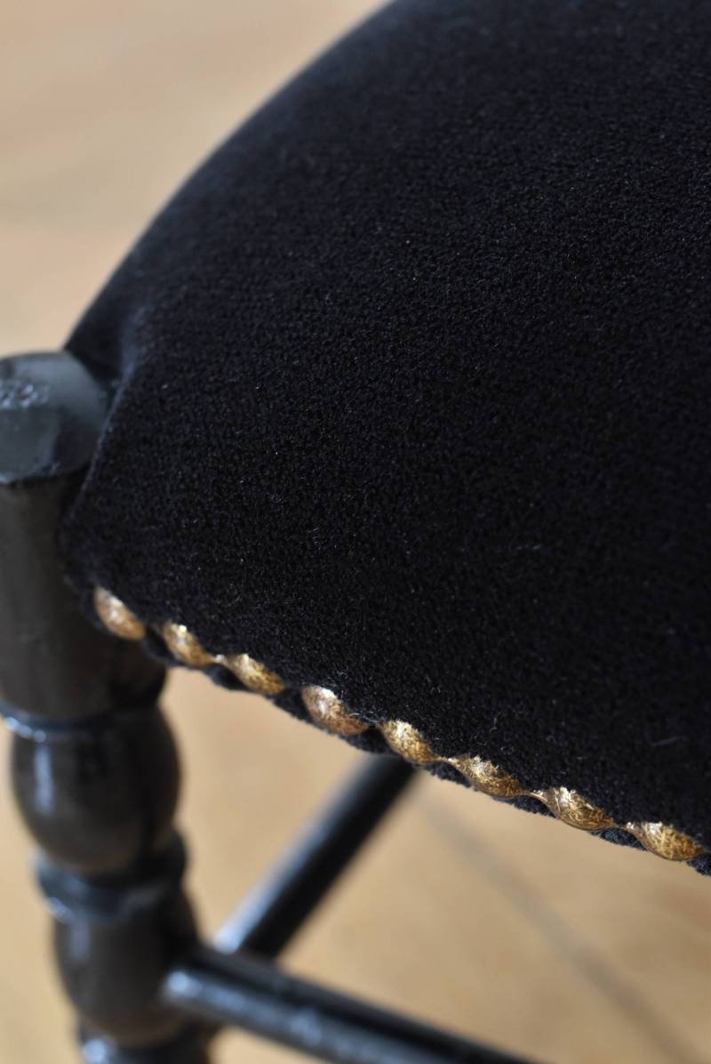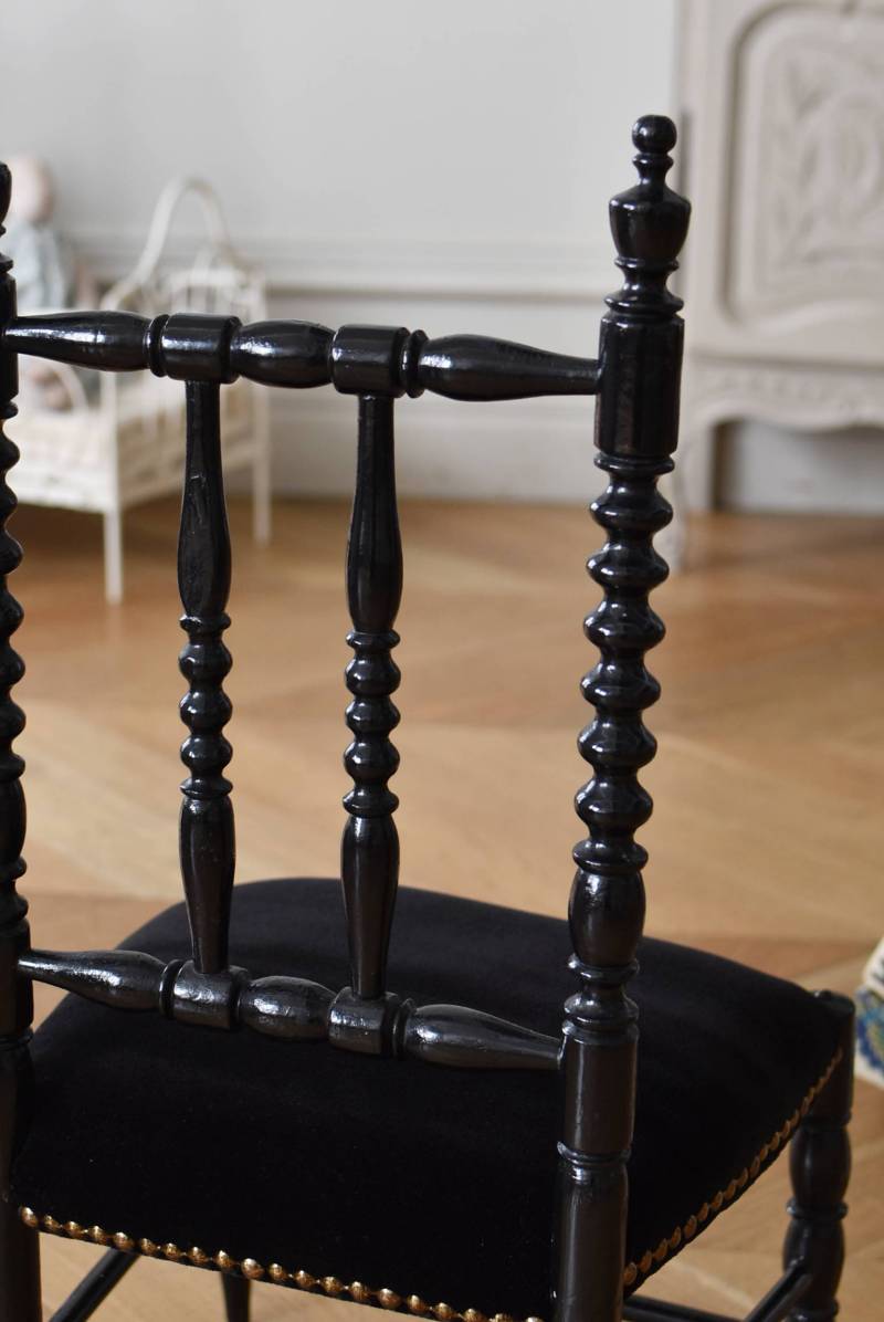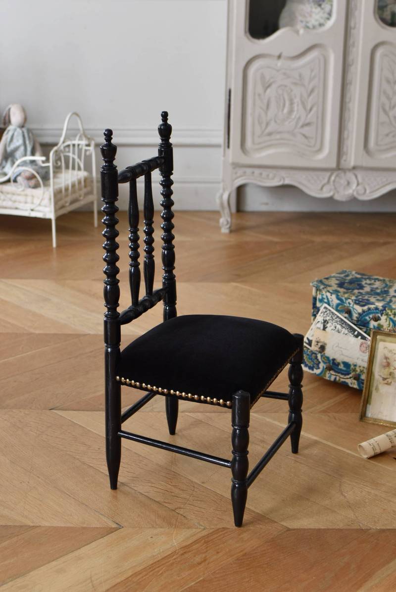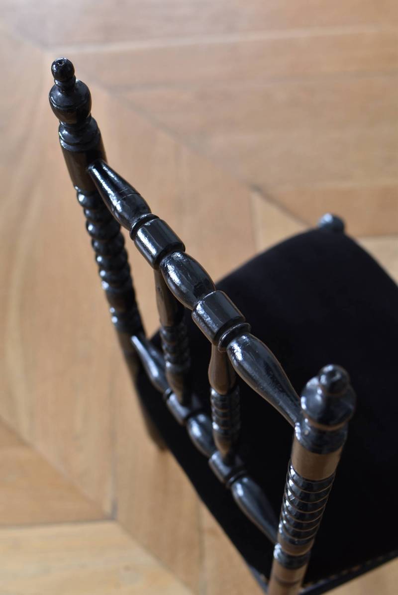 フランスのアンティークチャイルドチェア。 背もたれサイドのボビンを重ねたかのようなポコポコと立体感のあるラインが特徴的で、直線的なラインが組み合わされたスタイリッシュなデザインです。脚先がキュッと細くなったシルエットが凛とした姿で、艶やかなブラックカラーが高貴な印象をもたらしてくれます。 フレームは一度バラして組み直しを行なっています。手触りの良いファブリックは新しく張り替え、中もウレタンに交換しています。比較的小ぶりなサイズなので卓上においてディスプレイしてもバランスが良く、丁寧な作りに思わず眺めていたくなりそうです。 W 約30.5cm D 約26cm H 約59.5cm 座面までH 約25cm