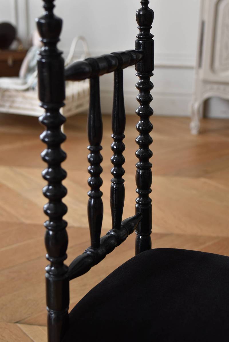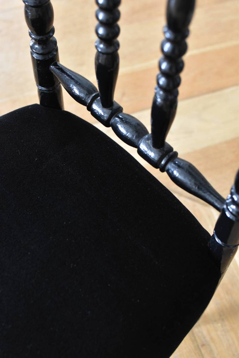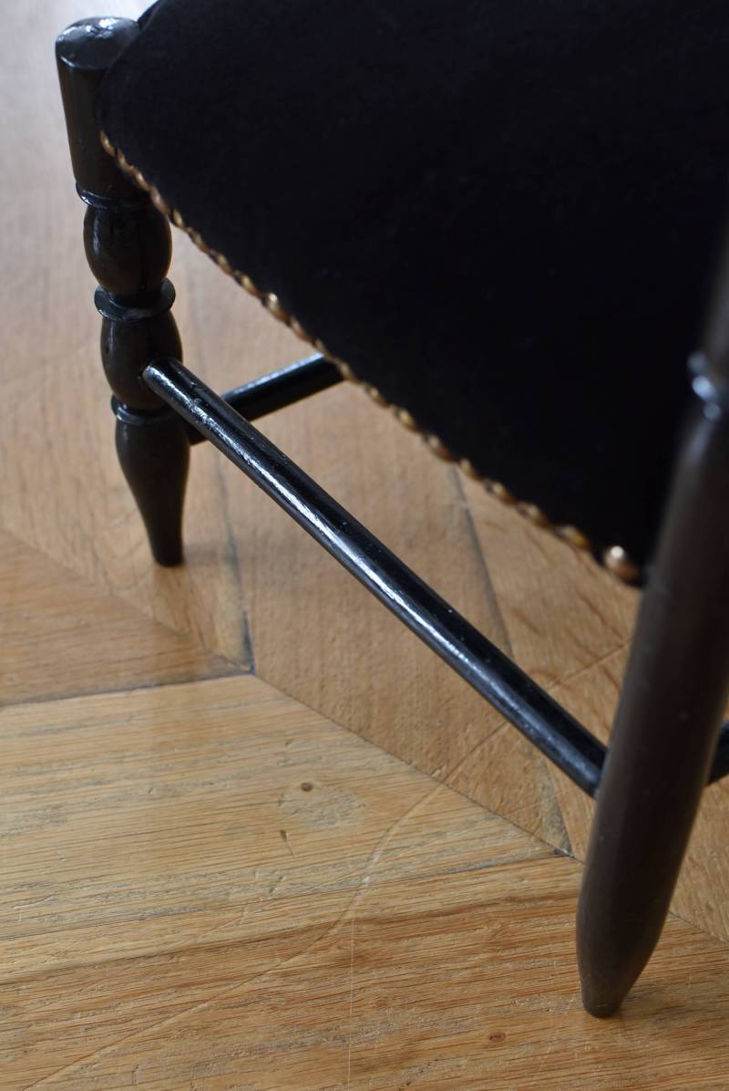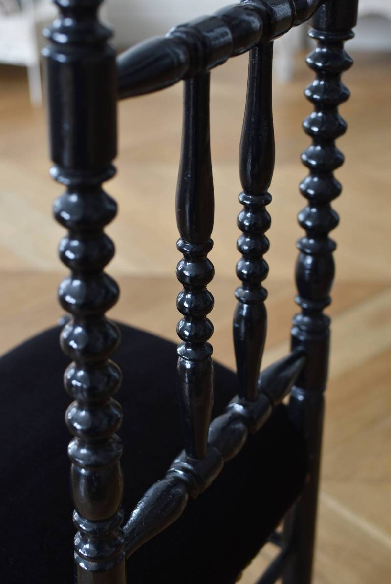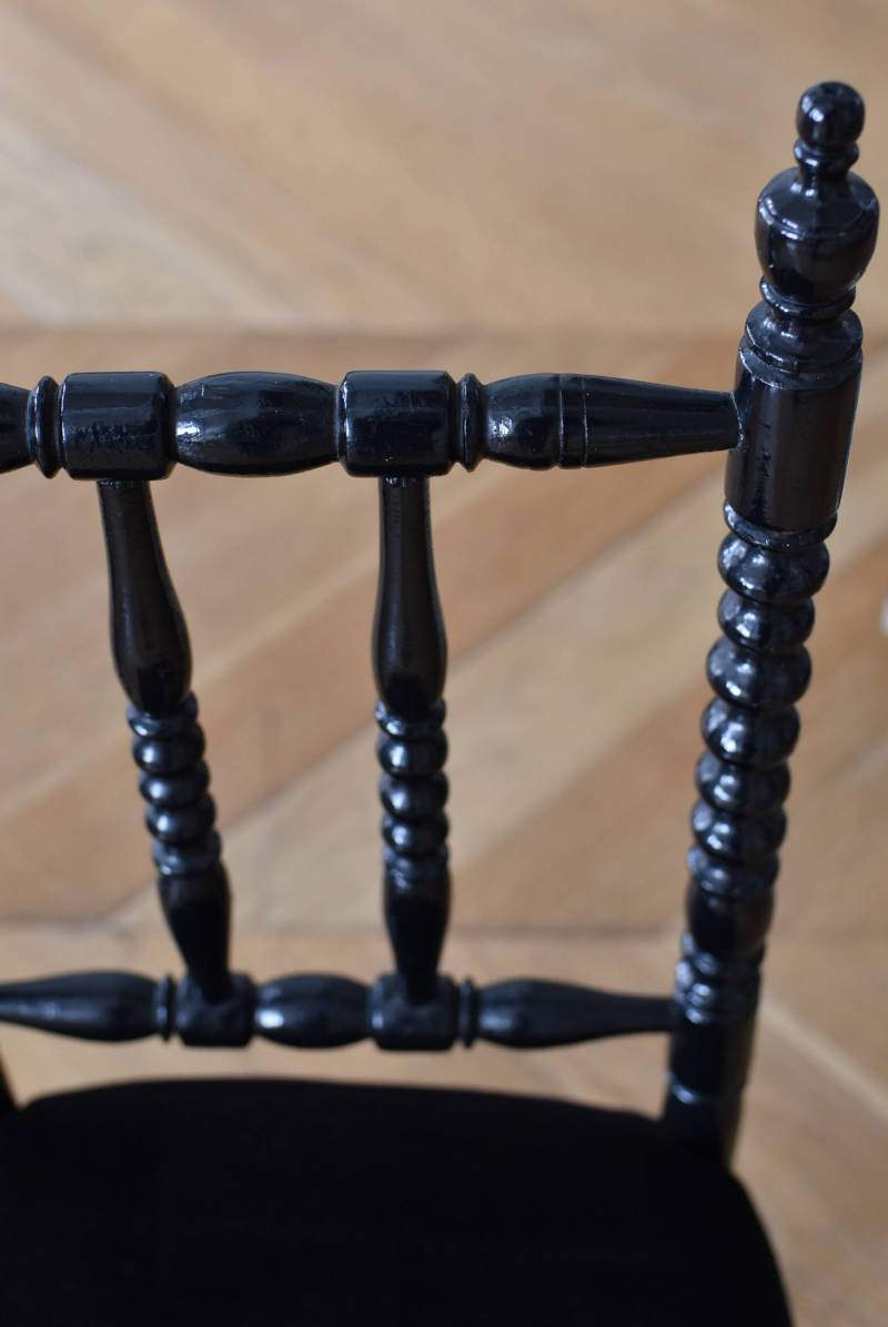 フランスのアンティークチャイルドチェア。 背もたれサイドのボビンを重ねたかのようなポコポコと立体感のあるラインが特徴的で、直線的なラインが組み合わされたスタイリッシュなデザインです。脚先がキュッと細くなったシルエットが凛とした姿で、艶やかなブラックカラーが高貴な印象をもたらしてくれます。 フレームは一度バラして組み直しを行なっています。手触りの良いファブリックは新しく張り替え、中もウレタンに交換しています。比較的小ぶりなサイズなので卓上においてディスプレイしてもバランスが良く、丁寧な作りに思わず眺めていたくなりそうです。 W 約30.5cm D 約26cm H 約59.5cm 座面までH 約25cm