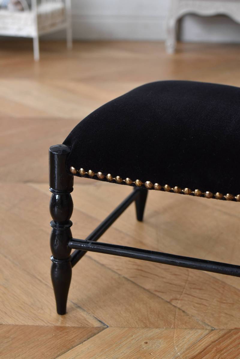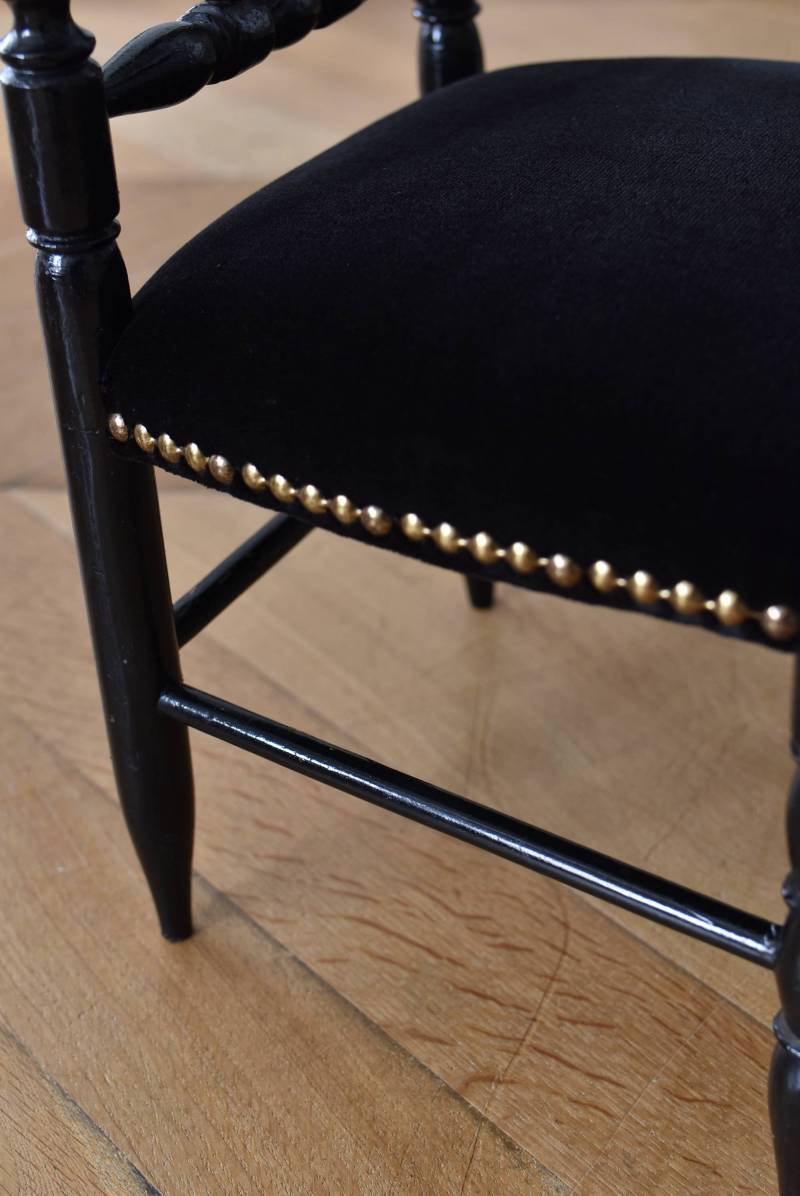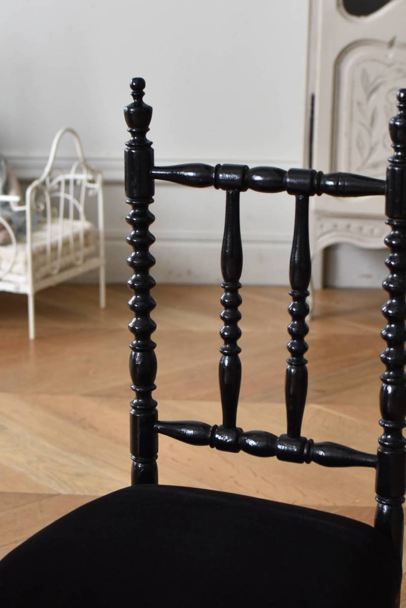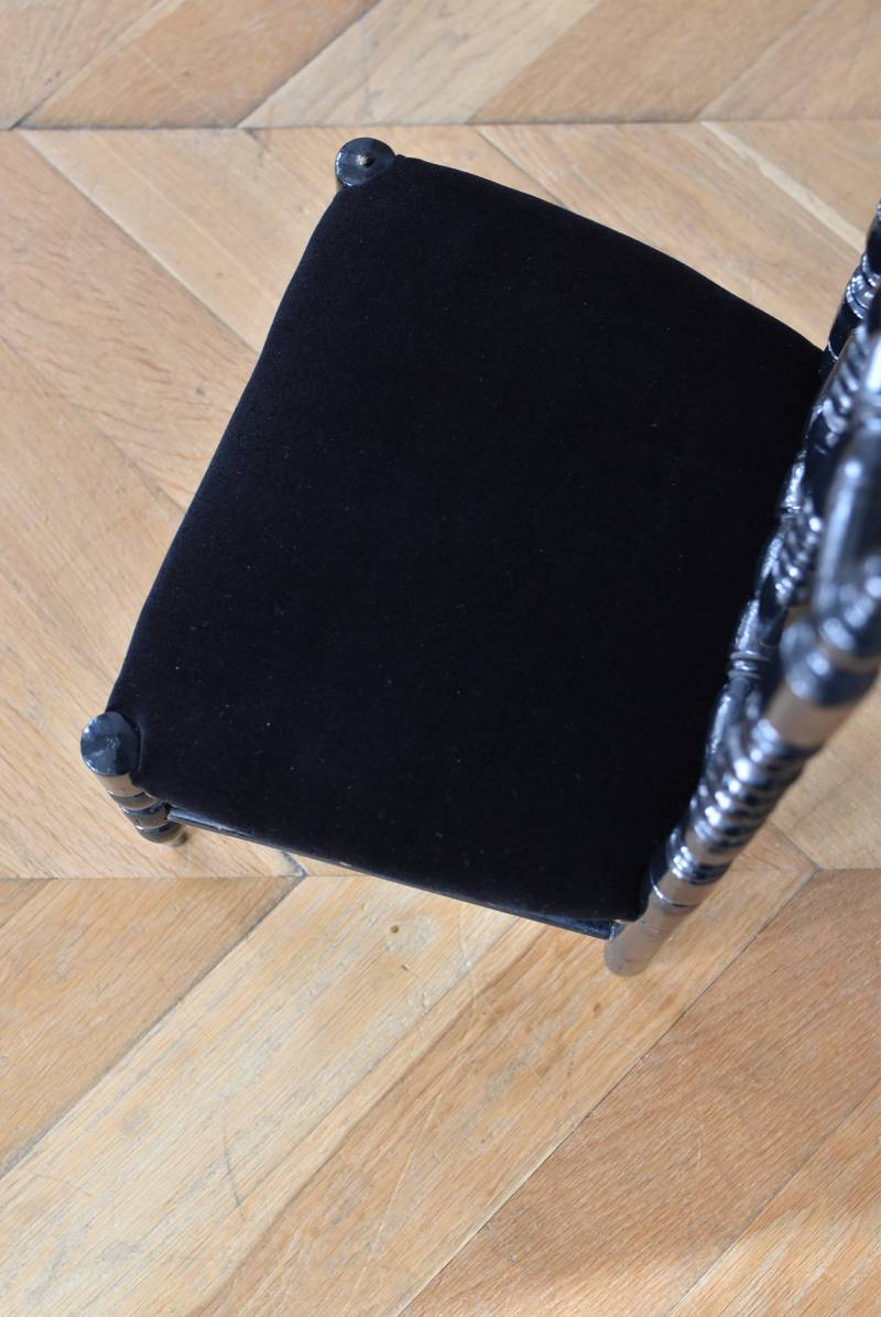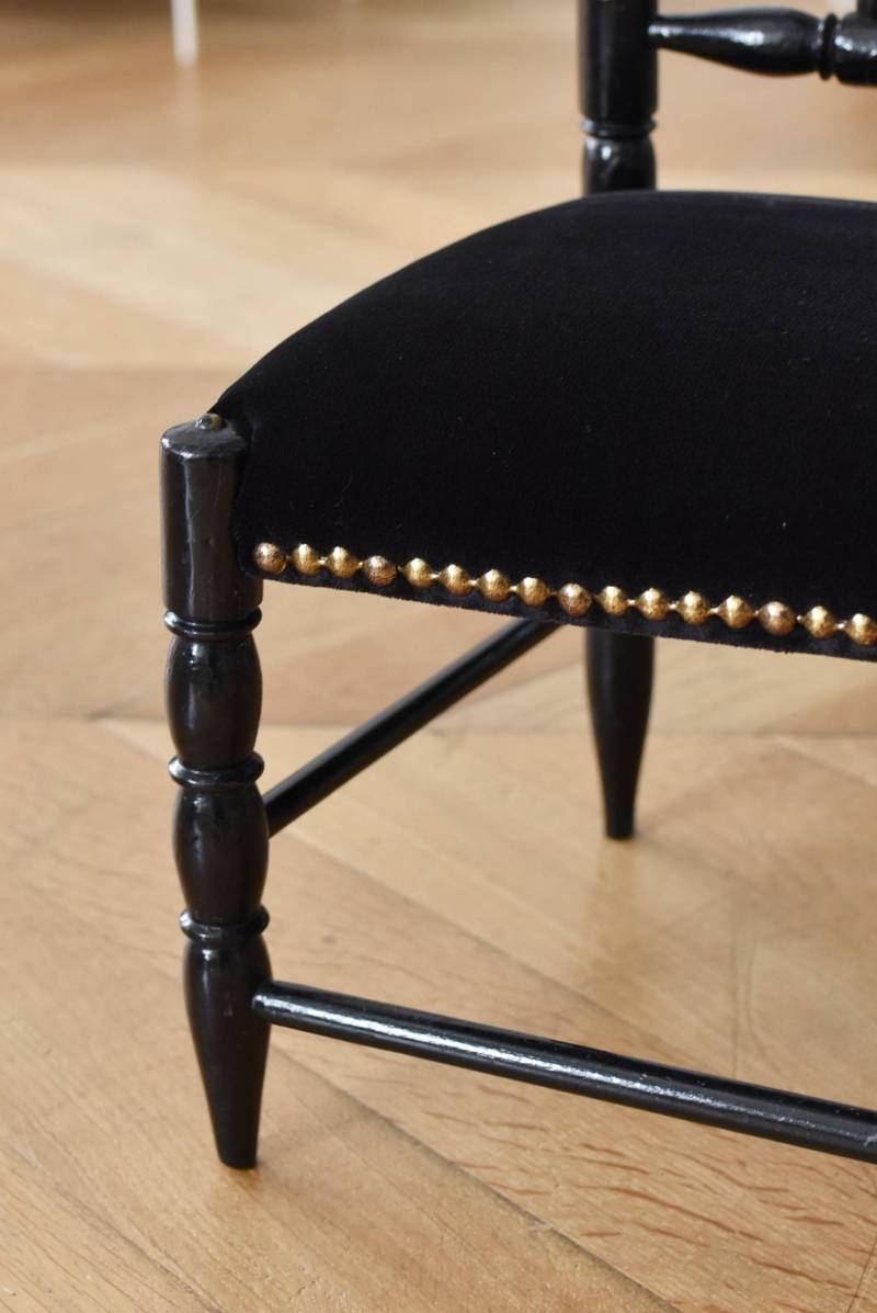 フランスのアンティークチャイルドチェア。 背もたれサイドのボビンを重ねたかのようなポコポコと立体感のあるラインが特徴的で、直線的なラインが組み合わされたスタイリッシュなデザインです。脚先がキュッと細くなったシルエットが凛とした姿で、艶やかなブラックカラーが高貴な印象をもたらしてくれます。 フレームは一度バラして組み直しを行なっています。手触りの良いファブリックは新しく張り替え、中もウレタンに交換しています。比較的小ぶりなサイズなので卓上においてディスプレイしてもバランスが良く、丁寧な作りに思わず眺めていたくなりそうです。 W 約30.5cm D 約26cm H 約59.5cm 座面までH 約25cm