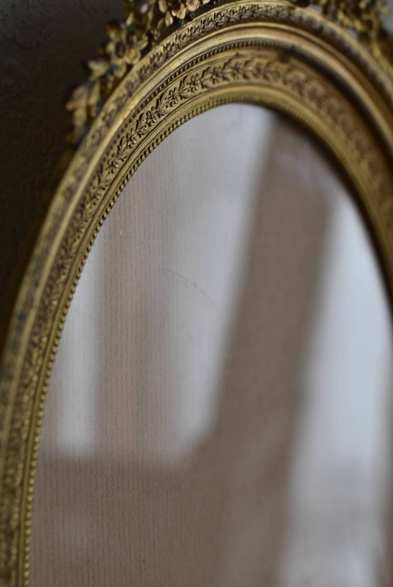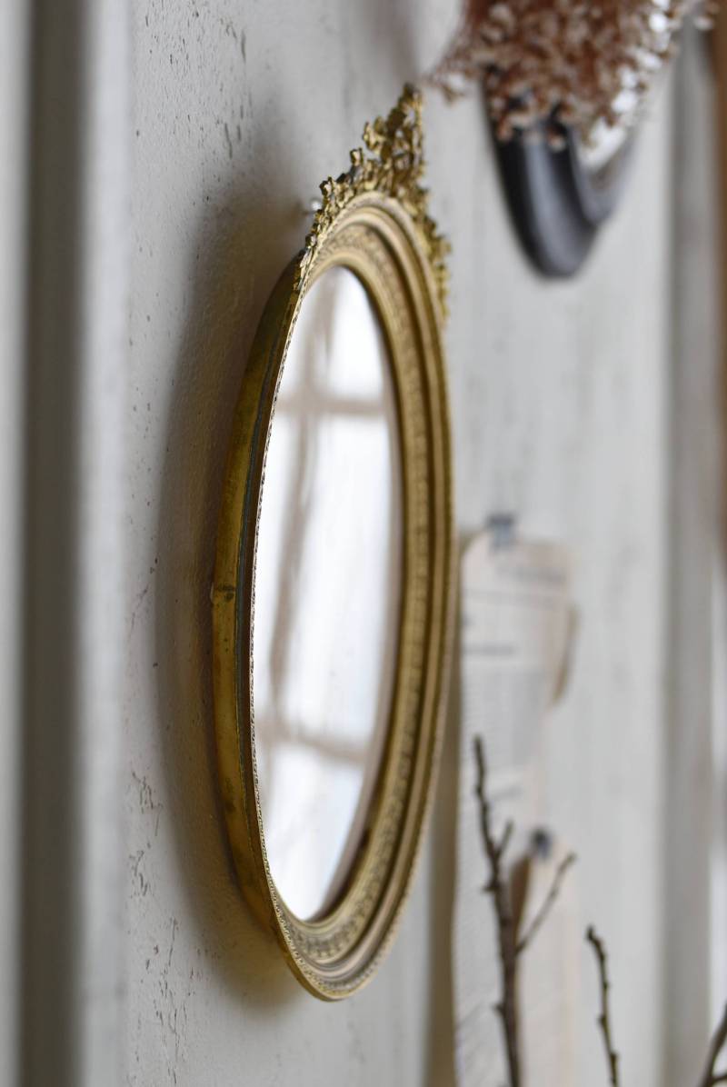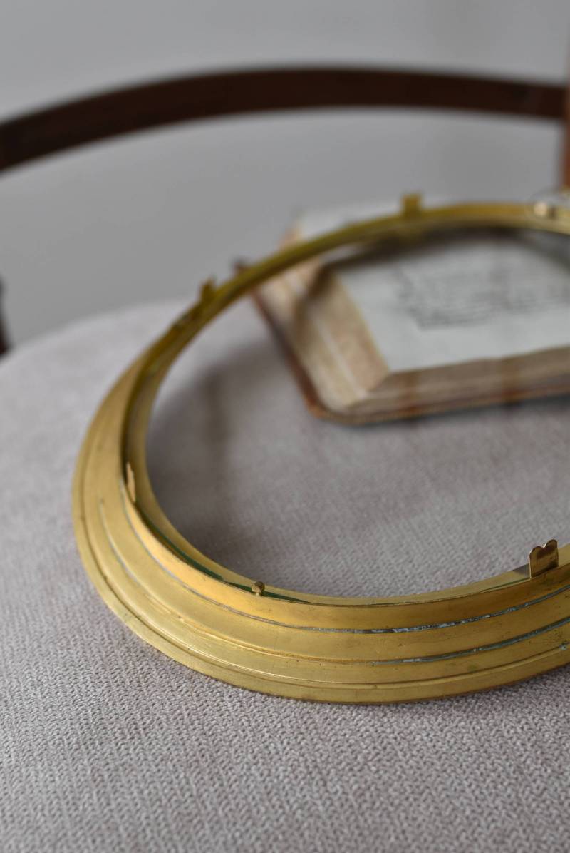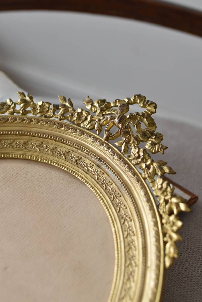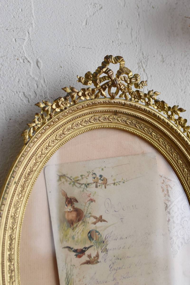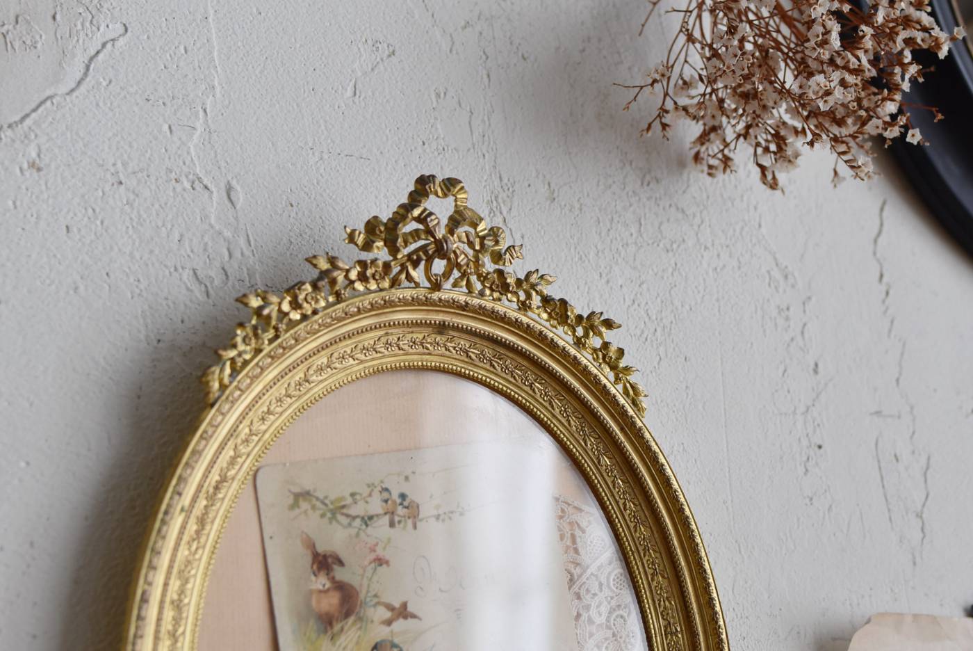 フランスのオーバルフレーム。 波打つような大きなリボンから広がるようにお花が連なったデザインがトップに施され、真鍮ならではの明るいゴールドカラーが可憐な雰囲気をもたらしてくれます。立体感のある形状となったフレーム部分にもパールモチーフなどの繊細な連続模様で囲まれており、壁面を華やかに彩ってくれそうです。 古いものですので装飾部にヒビなどが見受けられますが、さほど目立ちにくいかと思います。裏面の爪を立てるとお好みの写真やペーパーなどを収める事ができます。 W 約19.5cm D 約3cm H 約28cm ガラス面積 W約15cm×H約20cm 重量 約0.5kg