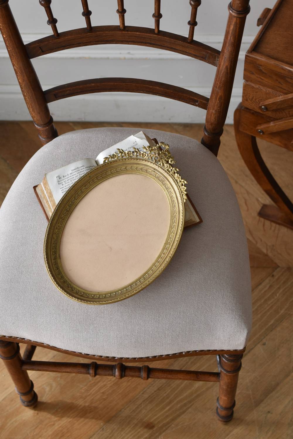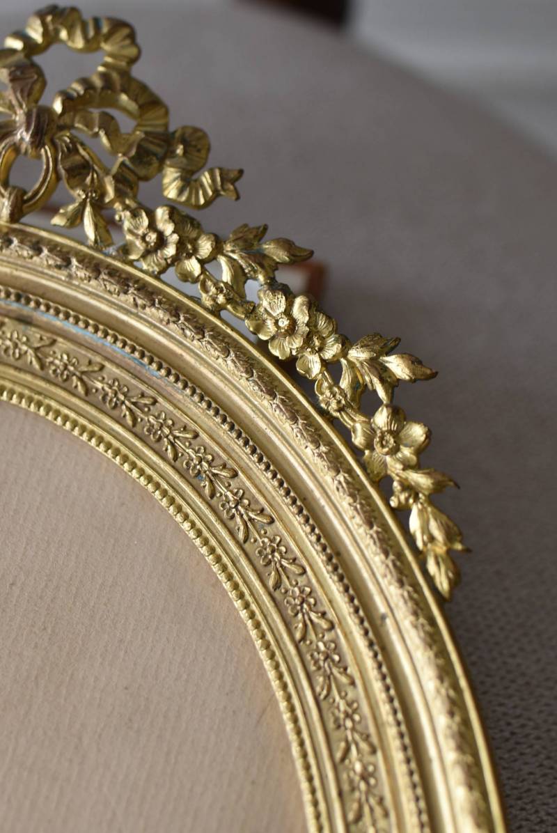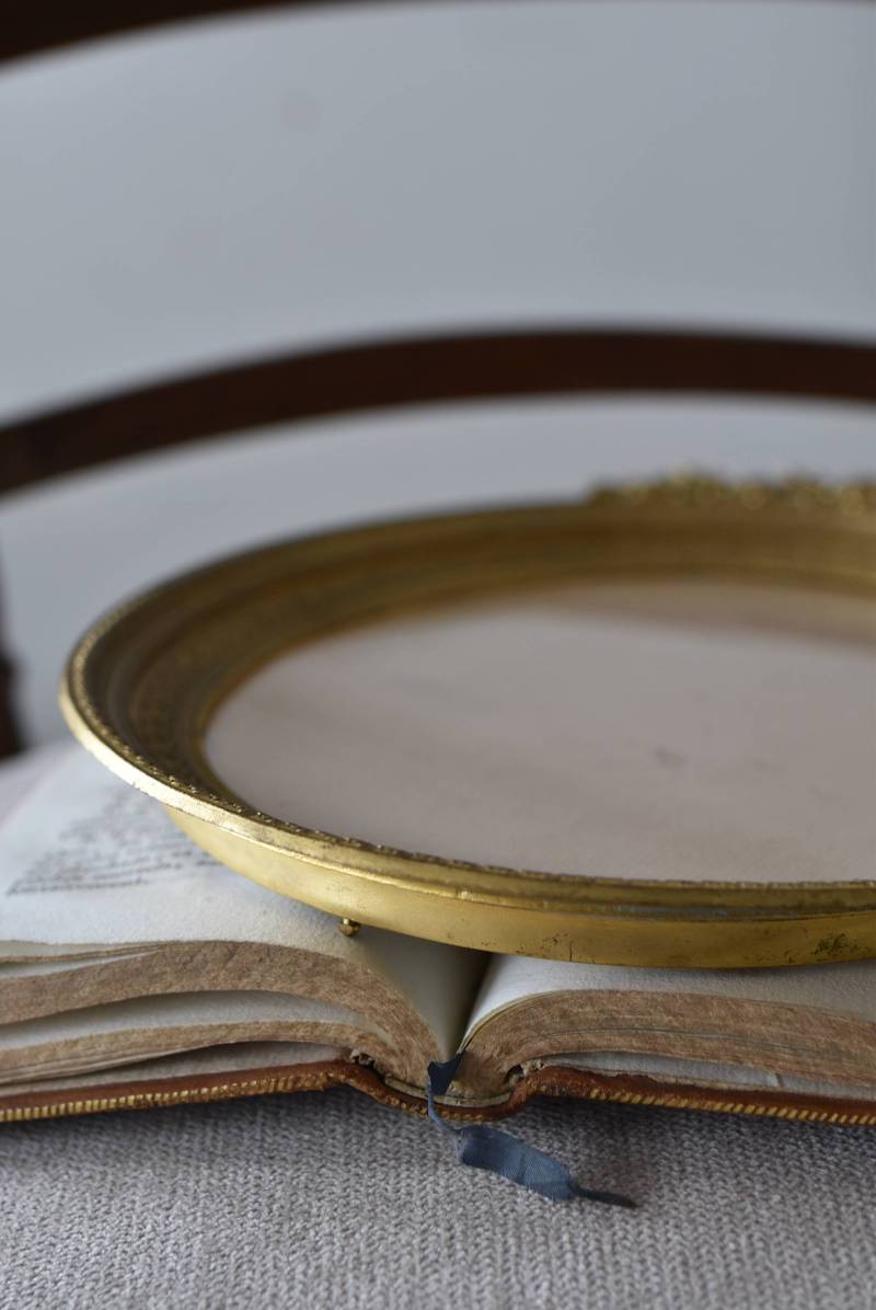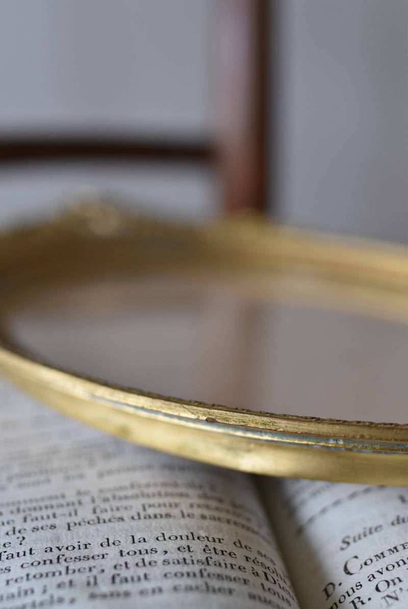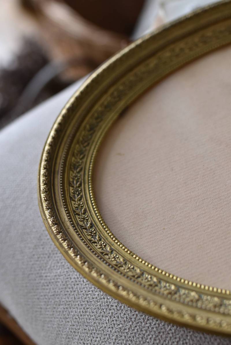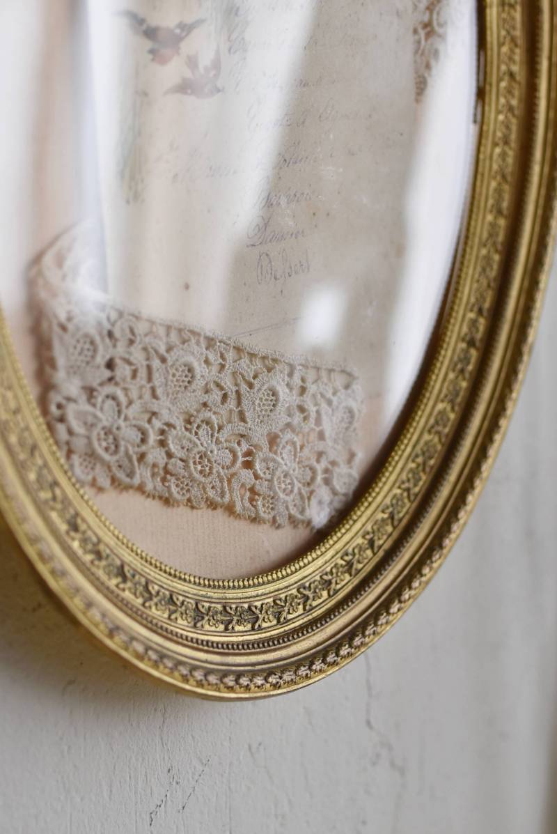 フランスのオーバルフレーム。 波打つような大きなリボンから広がるようにお花が連なったデザインがトップに施され、真鍮ならではの明るいゴールドカラーが可憐な雰囲気をもたらしてくれます。立体感のある形状となったフレーム部分にもパールモチーフなどの繊細な連続模様で囲まれており、壁面を華やかに彩ってくれそうです。 古いものですので装飾部にヒビなどが見受けられますが、さほど目立ちにくいかと思います。裏面の爪を立てるとお好みの写真やペーパーなどを収める事ができます。 W 約19.5cm D 約3cm H 約28cm ガラス面積 W約15cm×H約20cm 重量 約0.5kg