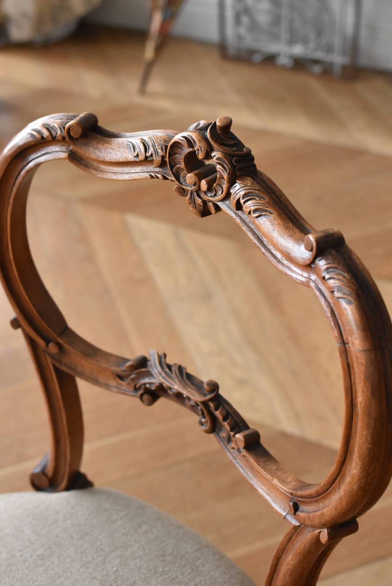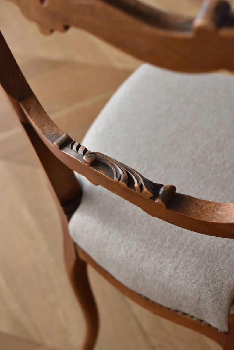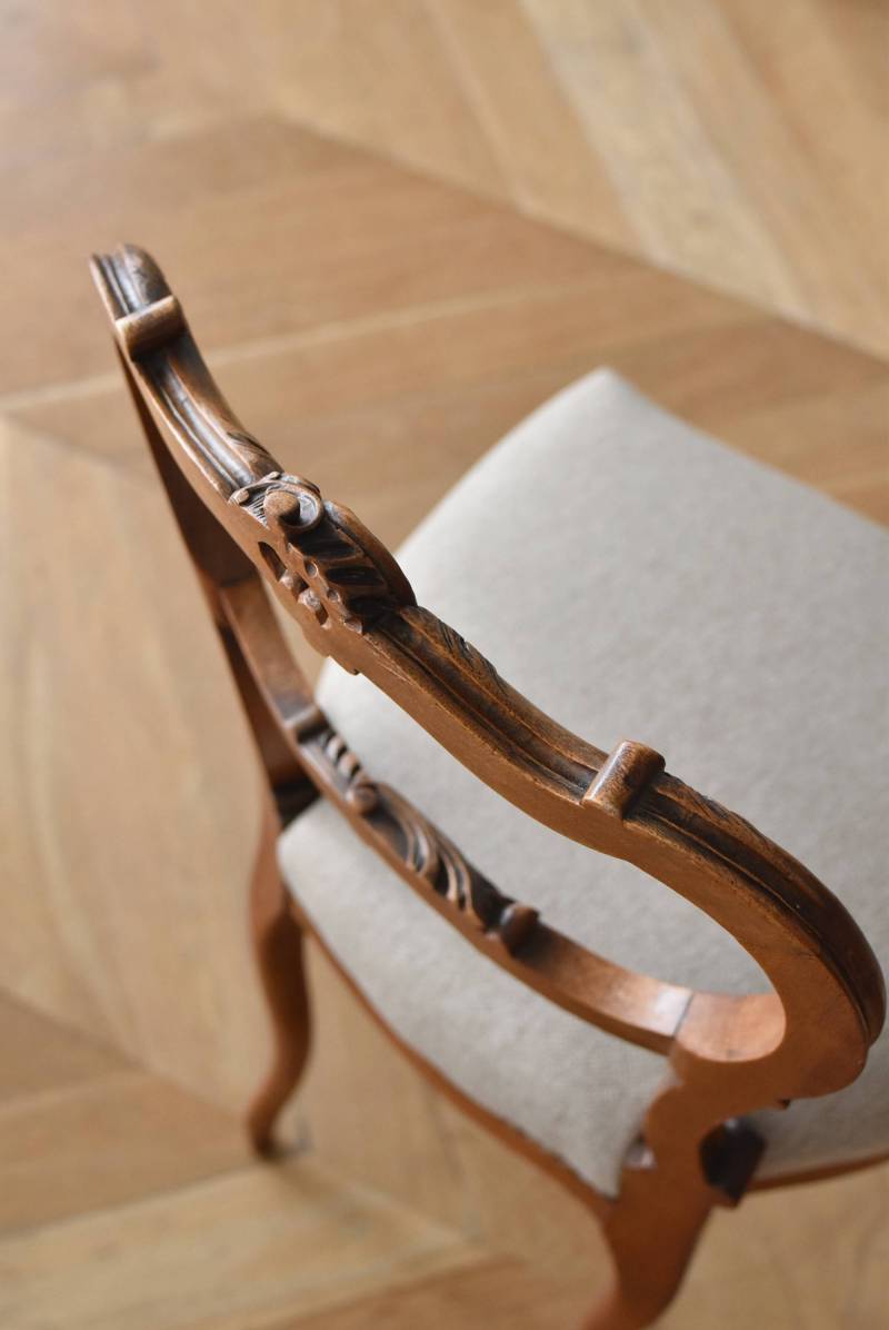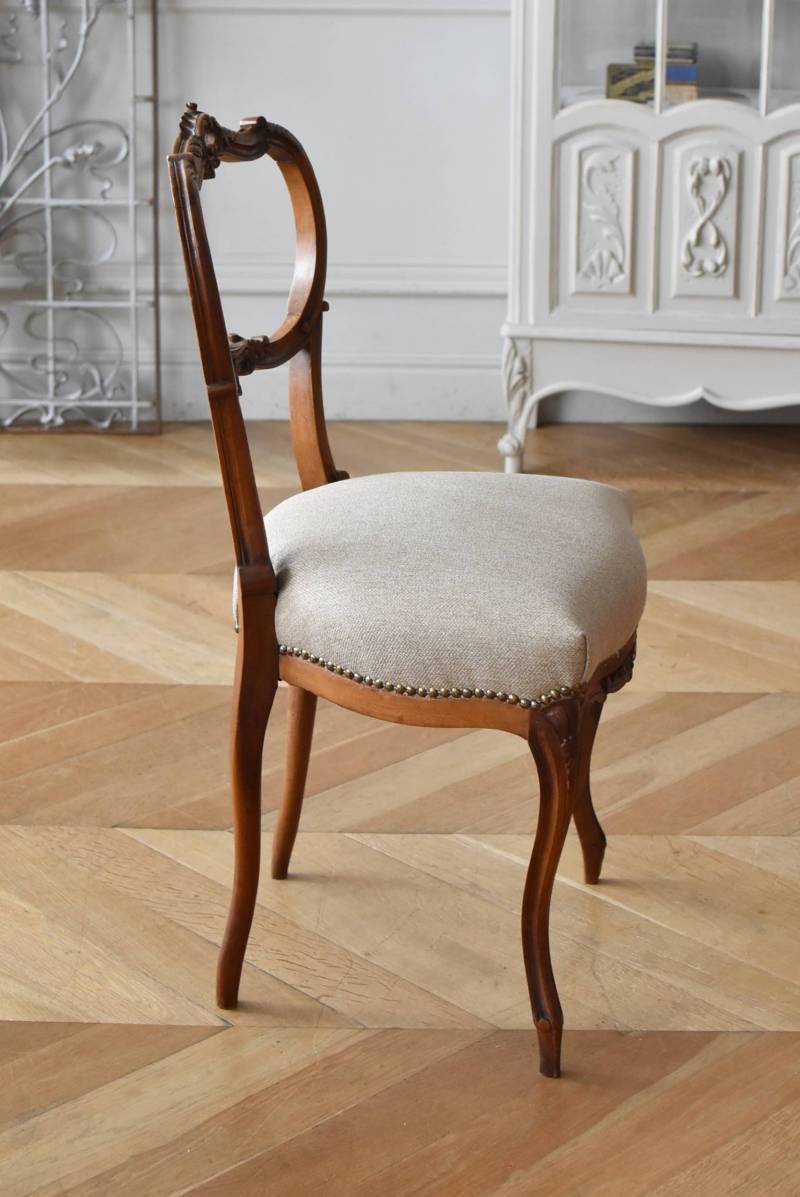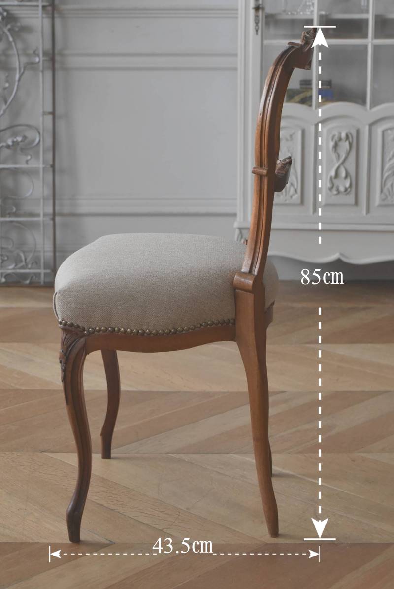 フランスのアンティークチェア。 ふっくらとした丸みのあるシルエットにロカイユや植物をモチーフとした精巧なレリーフが随所に楽しめ、アートのような美しさを感じさせてくれます。先端がくるんとまかれたリズミカルなデザインも随所に施され、なだらかに流れるような曲線が描かれた品格のある佇まいです。 フレームは一度パーツ毎にバラしてから、しっかりと組み直しを行っています。座面内側はウレタンに交換し、ファブリックも新しく張り替えており、沈み込みすぎない座り心地です。 W 約44.5cm D 約43.5cm H 約85cm 座面までH 約45cm