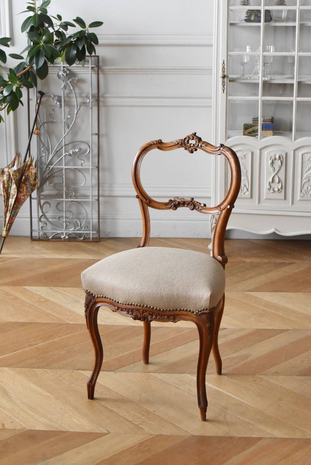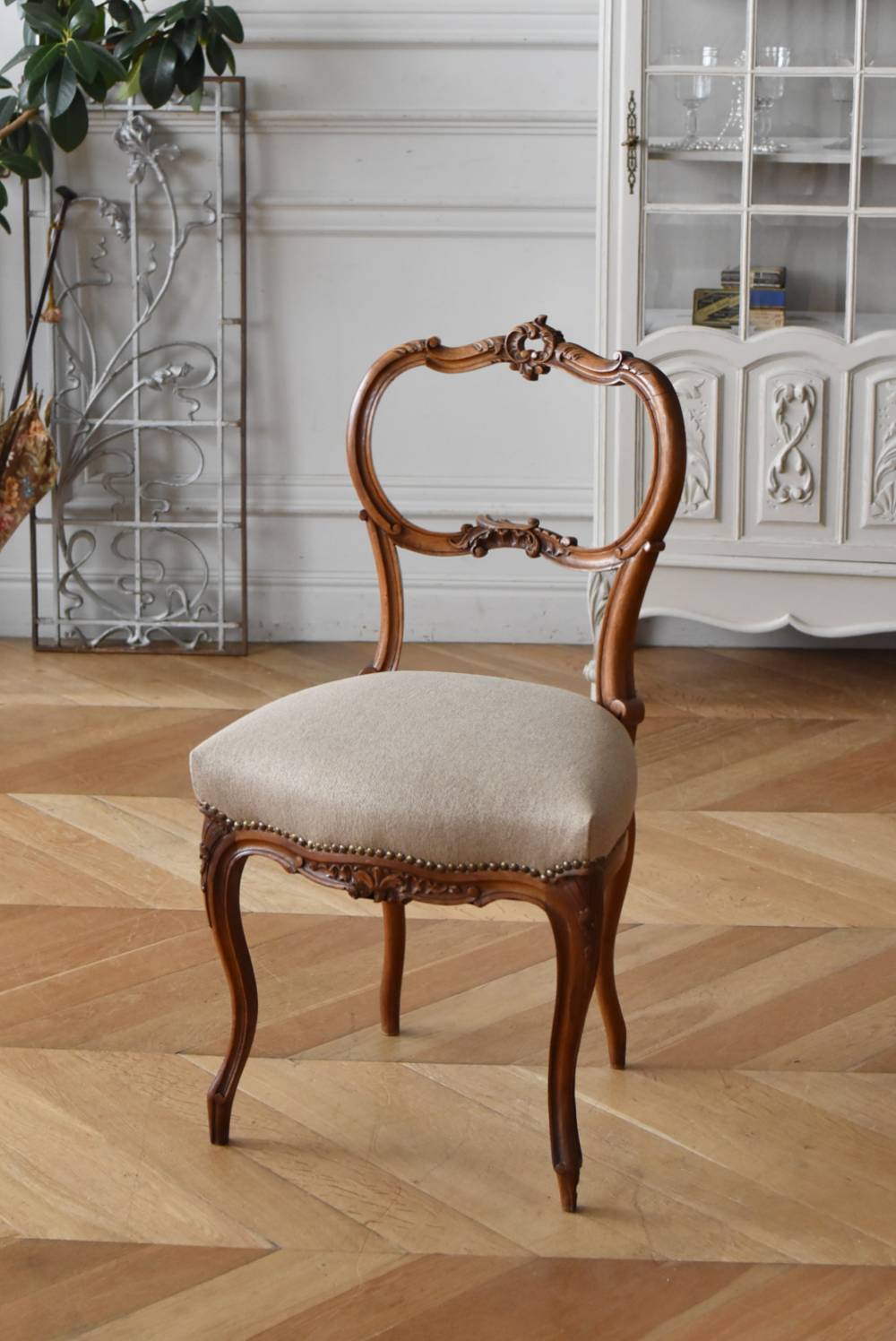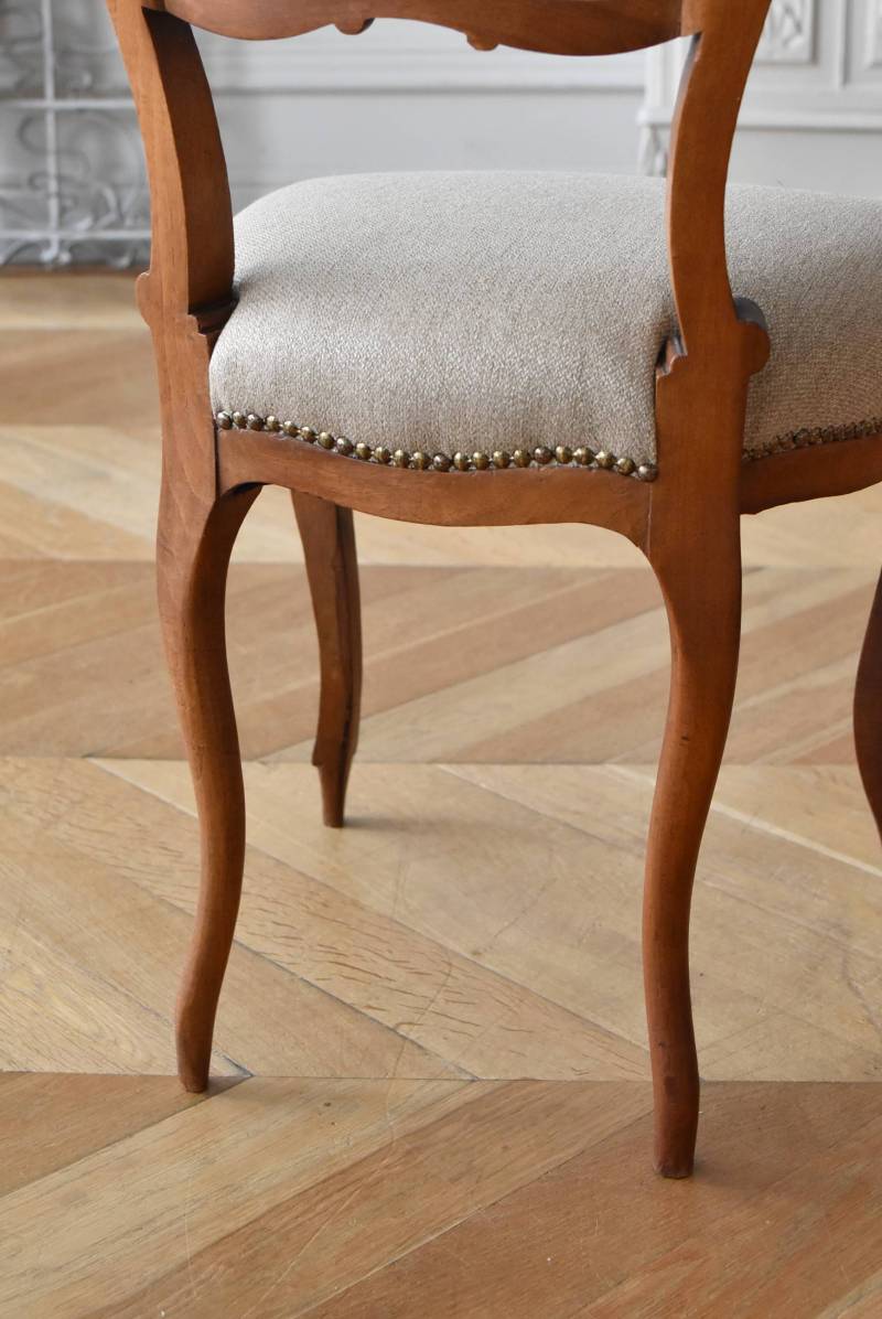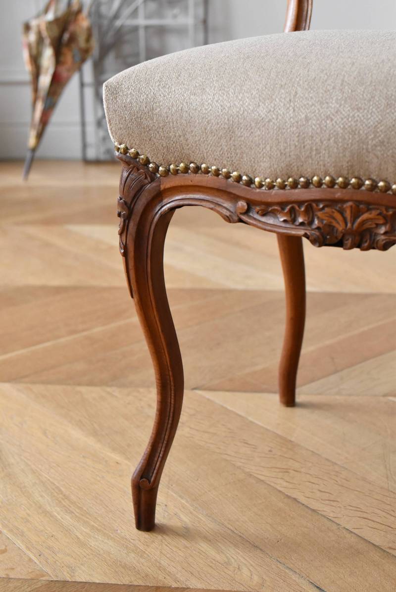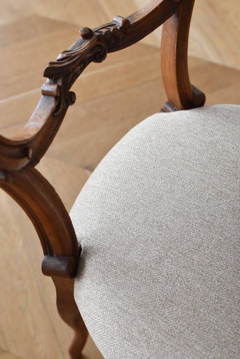 フランスのアンティークチェア。 ふっくらとした丸みのあるシルエットにロカイユや植物をモチーフとした精巧なレリーフが随所に楽しめ、アートのような美しさを感じさせてくれます。先端がくるんとまかれたリズミカルなデザインも随所に施され、なだらかに流れるような曲線が描かれた品格のある佇まいです。 フレームは一度パーツ毎にバラしてから、しっかりと組み直しを行っています。座面内側はウレタンに交換し、ファブリックも新しく張り替えており、沈み込みすぎない座り心地です。 W 約44.5cm D 約43.5cm H 約85cm 座面までH 約45cm