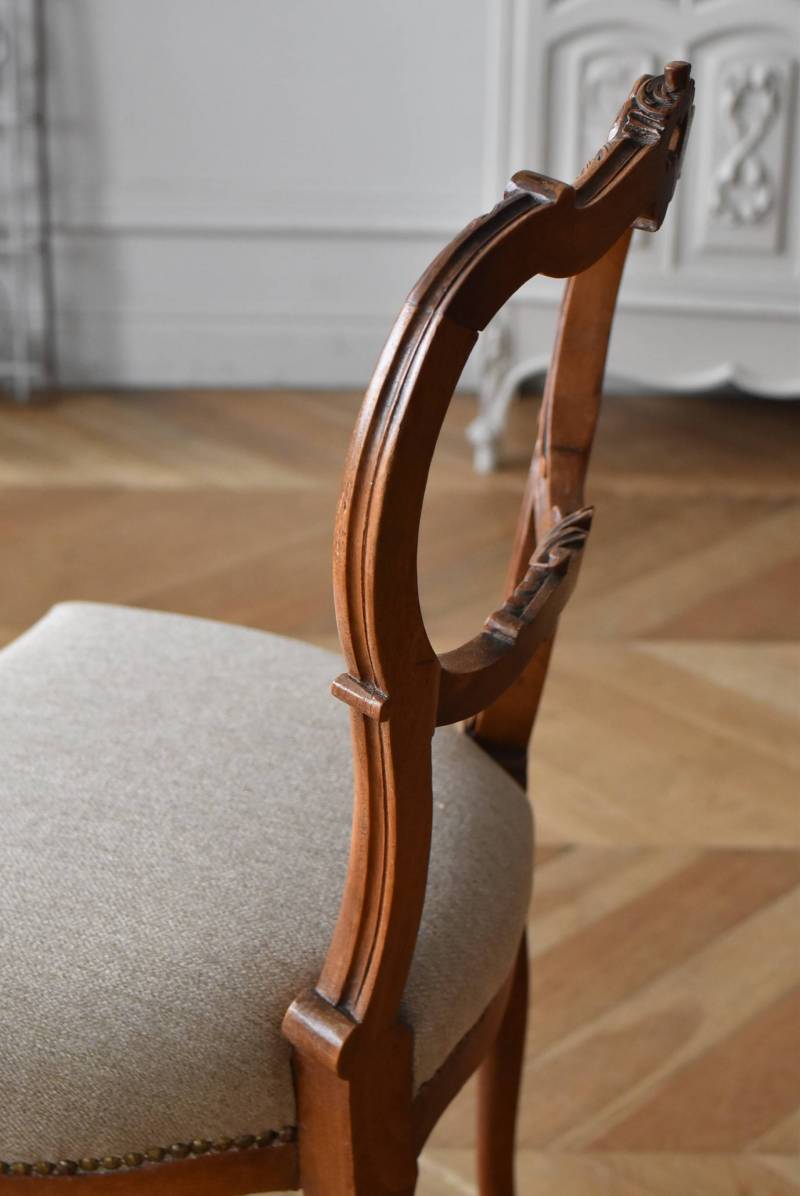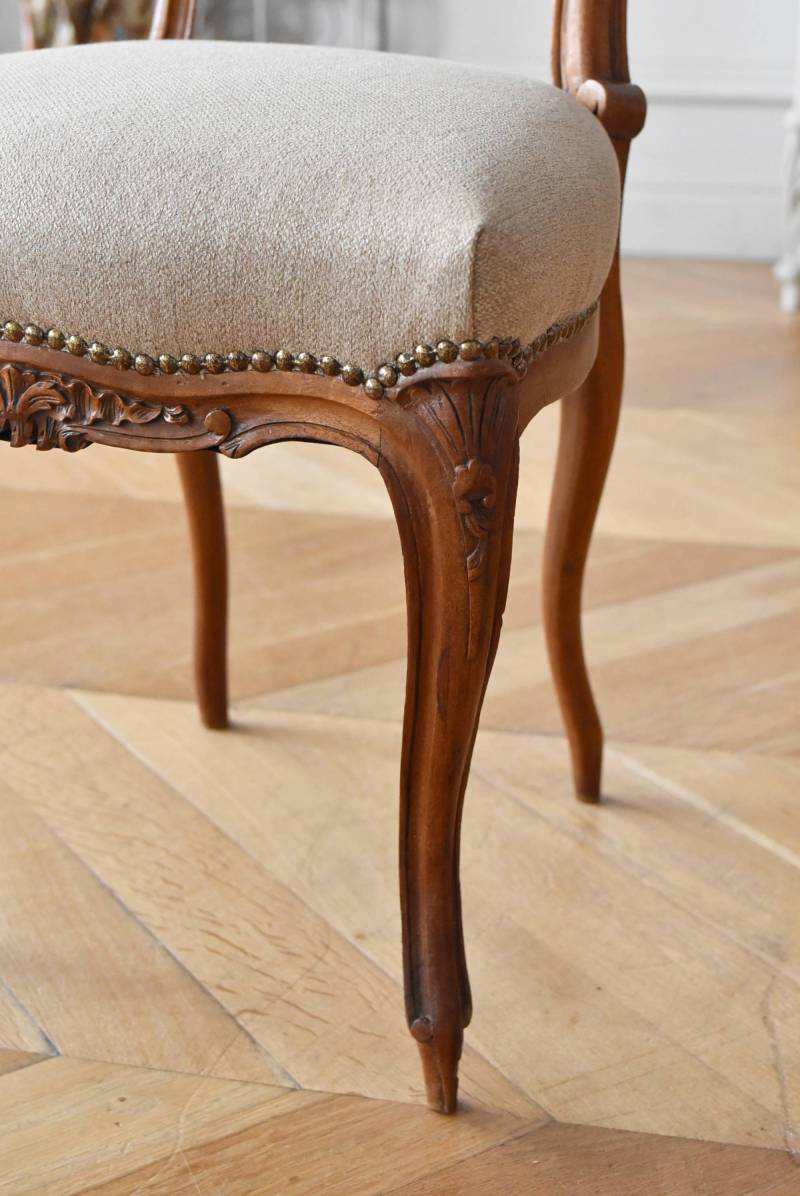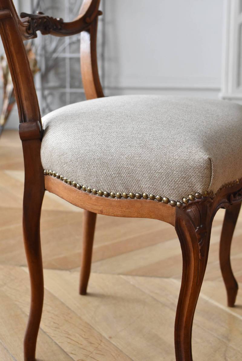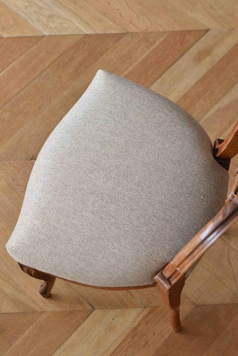 フランスのアンティークチェア。 ふっくらとした丸みのあるシルエットにロカイユや植物をモチーフとした精巧なレリーフが随所に楽しめ、アートのような美しさを感じさせてくれます。先端がくるんとまかれたリズミカルなデザインも随所に施され、なだらかに流れるような曲線が描かれた品格のある佇まいです。 フレームは一度パーツ毎にバラしてから、しっかりと組み直しを行っています。座面内側はウレタンに交換し、ファブリックも新しく張り替えており、沈み込みすぎない座り心地です。 W 約44.5cm D 約43.5cm H 約85cm 座面までH 約45cm