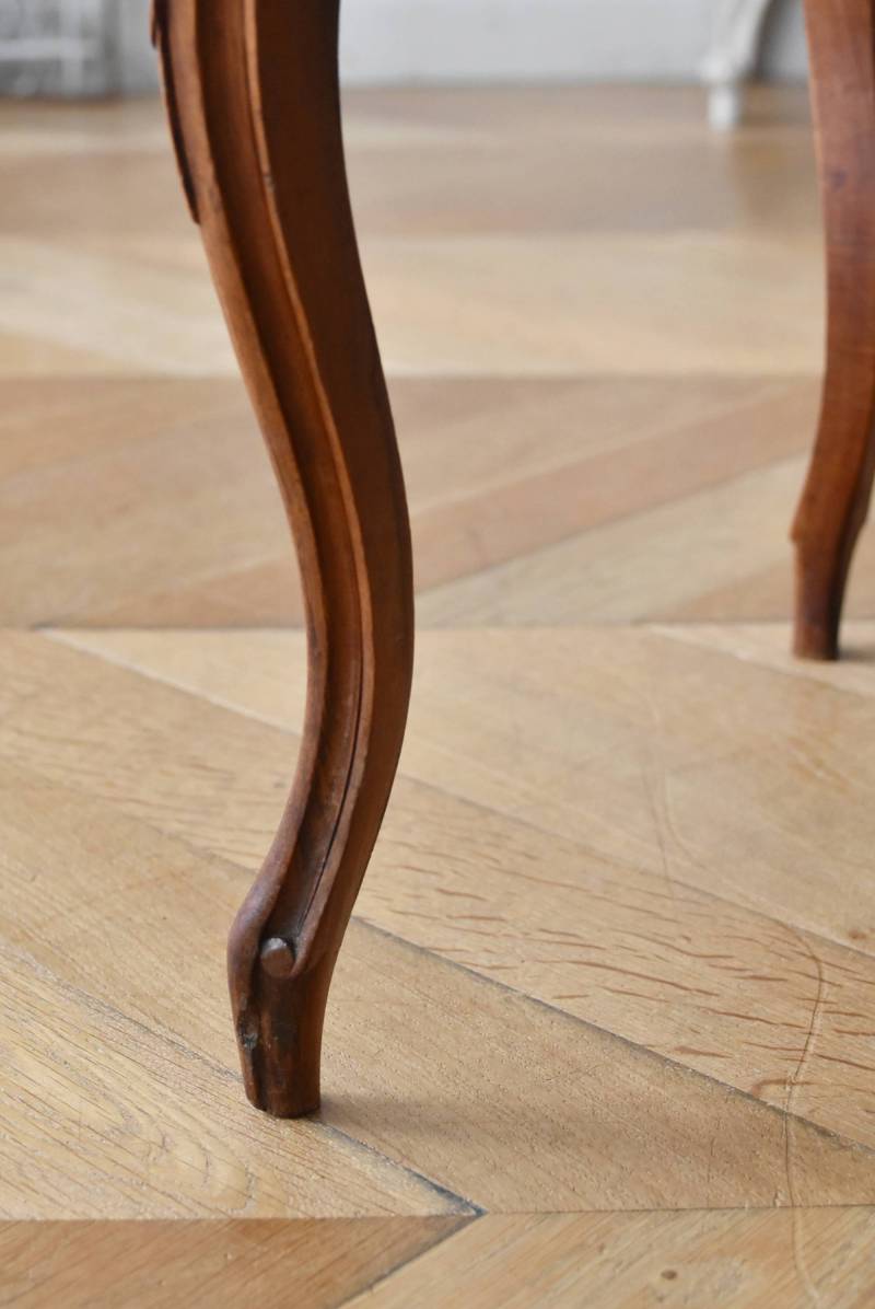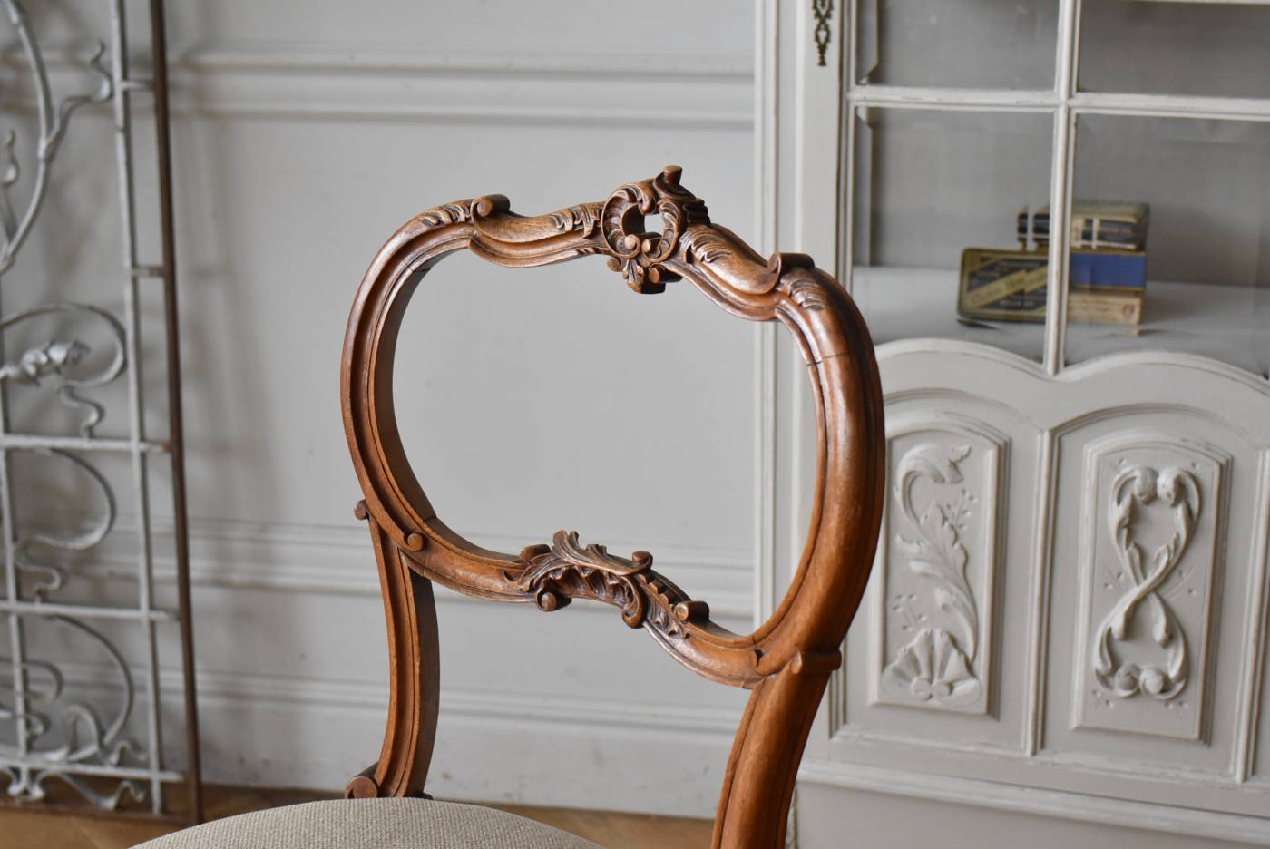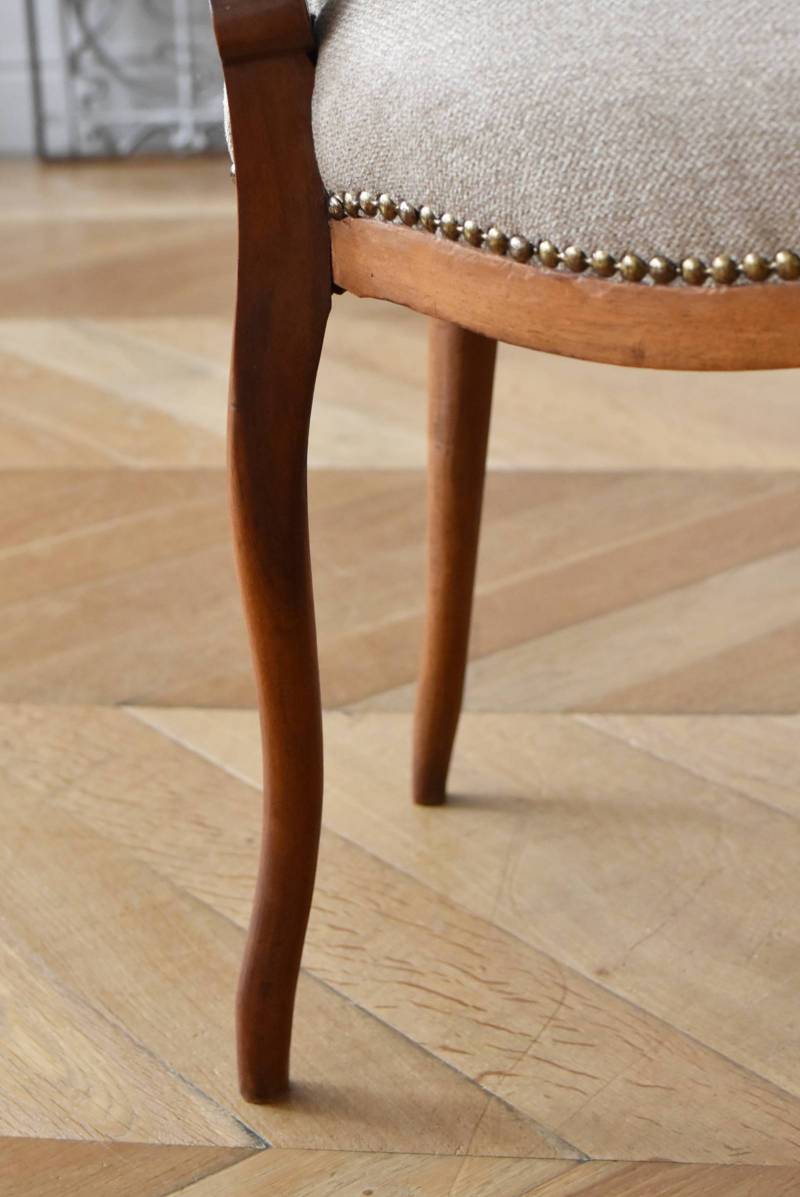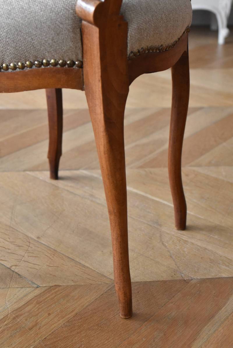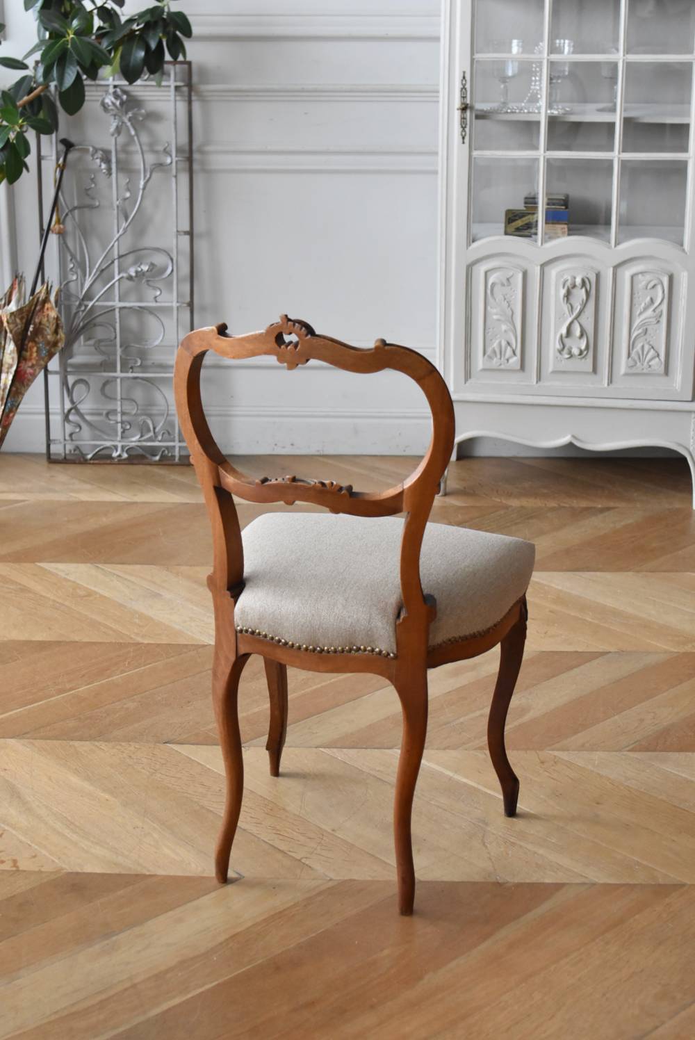 フランスのアンティークチェア。 ふっくらとした丸みのあるシルエットにロカイユや植物をモチーフとした精巧なレリーフが随所に楽しめ、アートのような美しさを感じさせてくれます。先端がくるんとまかれたリズミカルなデザインも随所に施され、なだらかに流れるような曲線が描かれた品格のある佇まいです。 フレームは一度パーツ毎にバラしてから、しっかりと組み直しを行っています。座面内側はウレタンに交換し、ファブリックも新しく張り替えており、沈み込みすぎない座り心地です。 W 約44.5cm D 約43.5cm H 約85cm 座面までH 約45cm