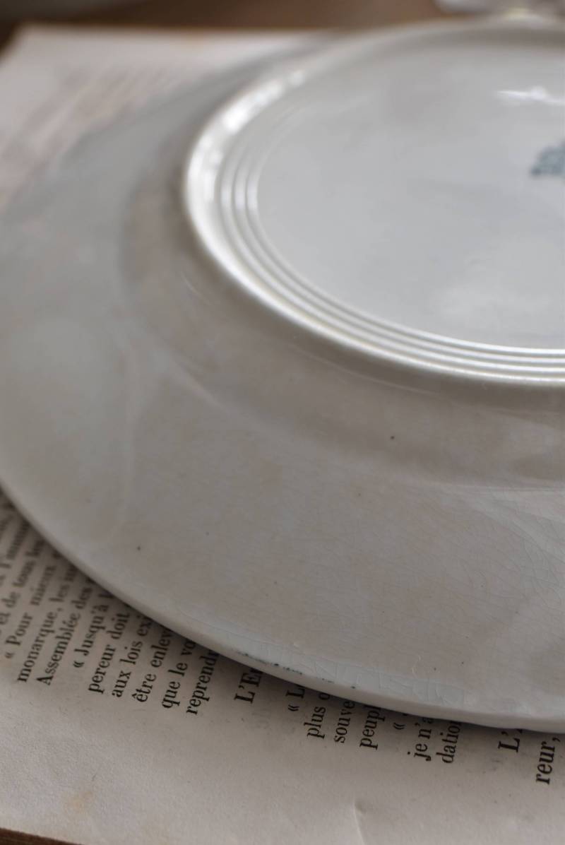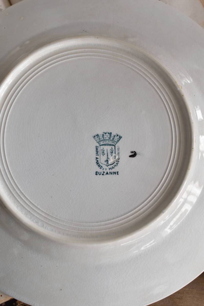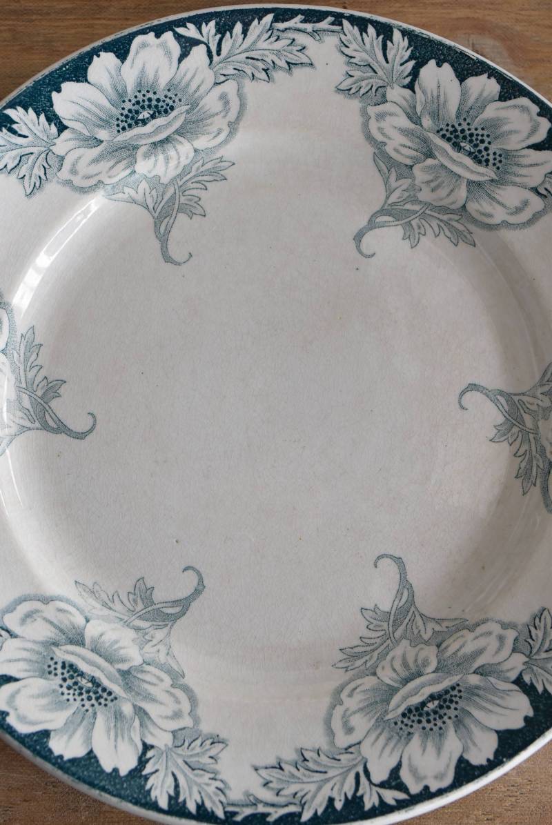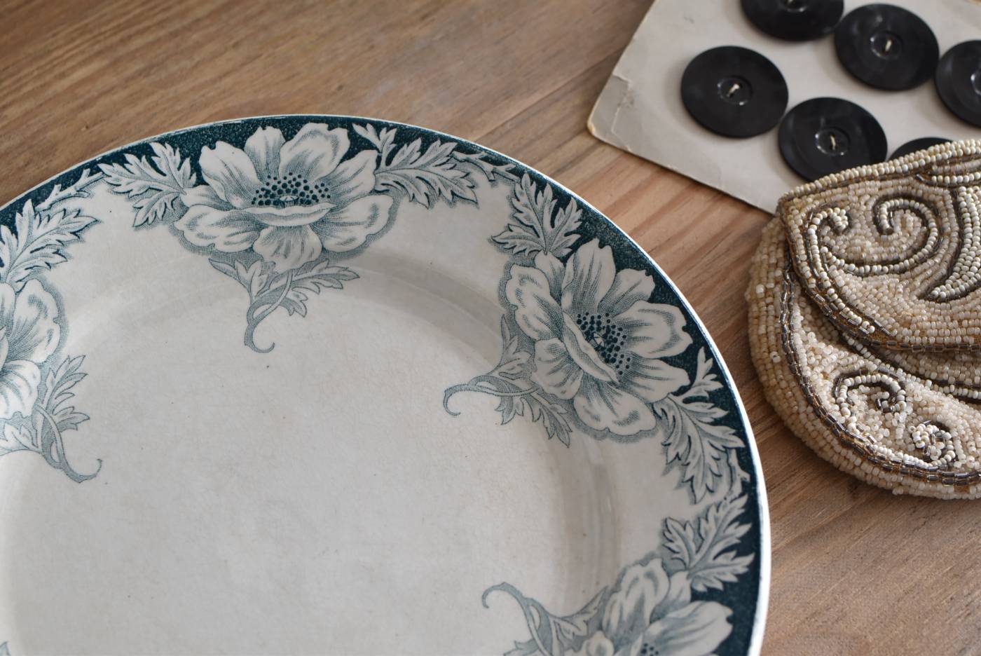 すっきりとしたラウンド型になったフランス・St.Amandのアンティークプレート。 大胆にあしらわれた6つのお花模様がバランス良く配置されたSUZANNEシリーズ、外側に向かって広がる姿から端正な美しさが伝わってきます。躍動感のある葉っぱは繊細さも兼ね備わっており、グリーンがかった落ち着いた色合いとなったシックな印象のあるデザインです。 それぞれでの販売となりますが、同じシリーズの皿やコンポート、ソーシエールがあります。(SUZANNEシリーズ )しっかりと幅のあるリム部分は少し高さのある作りとなっており、卓上を豪華に彩ってくれます。 直径 約21.5cm H 約2.5cm