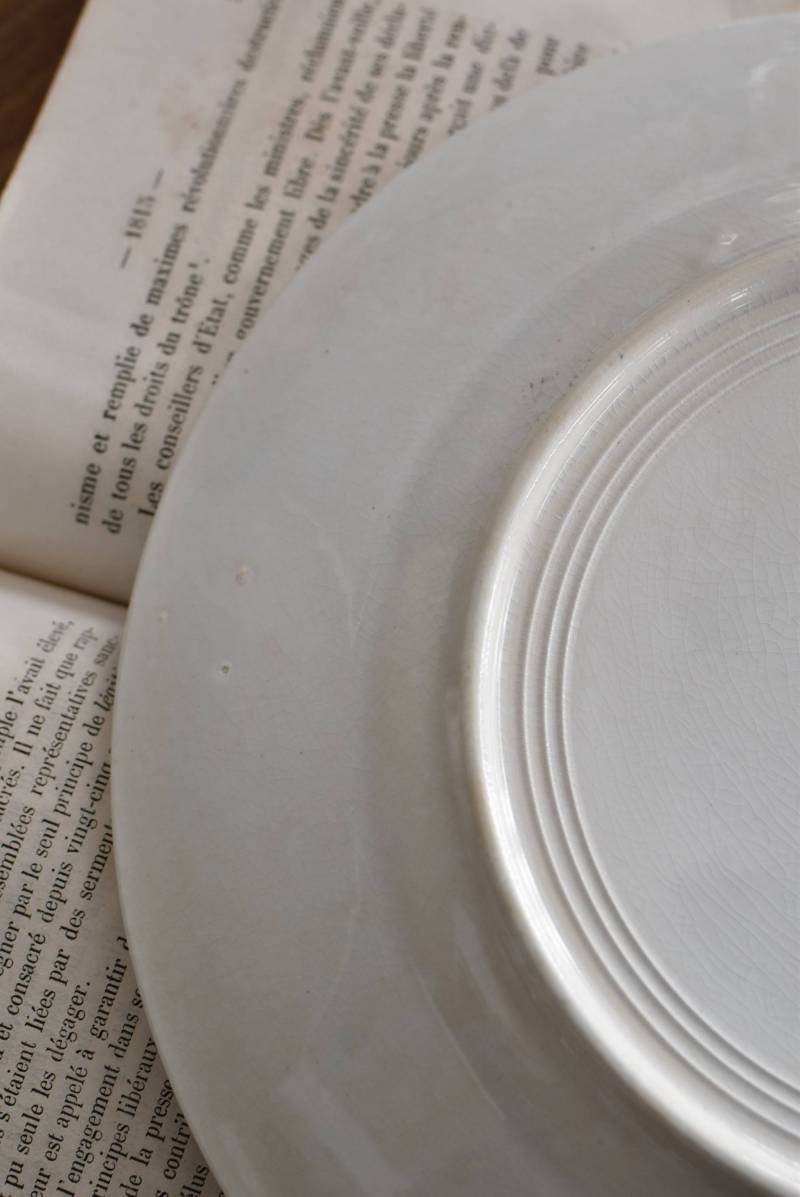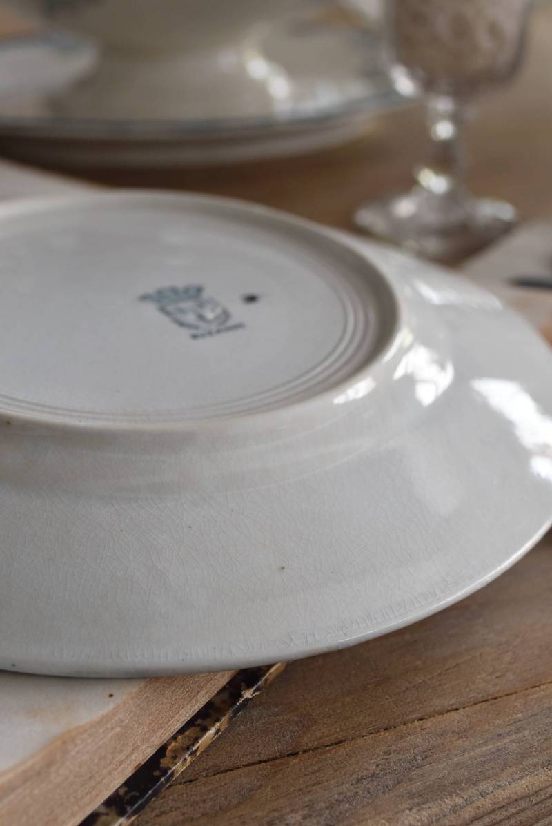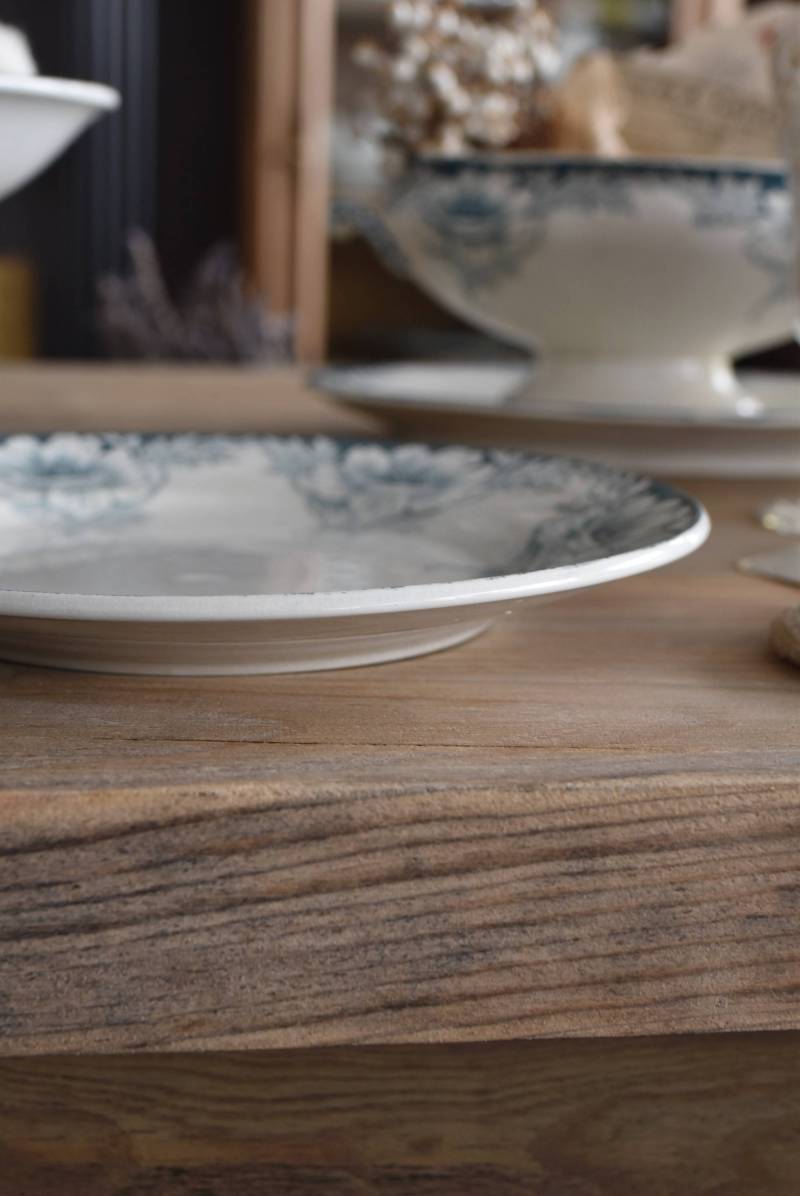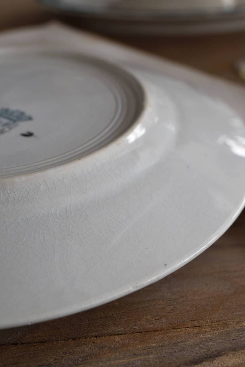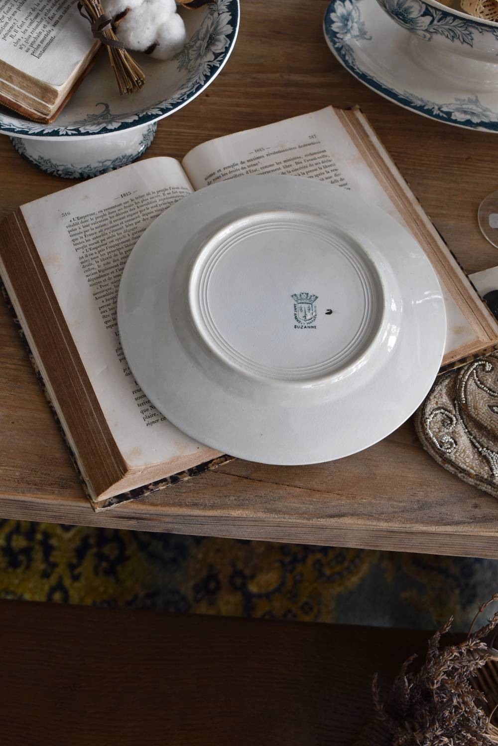 すっきりとしたラウンド型になったフランス・St.Amandのアンティークプレート。 大胆にあしらわれた6つのお花模様がバランス良く配置されたSUZANNEシリーズ、外側に向かって広がる姿から端正な美しさが伝わってきます。躍動感のある葉っぱは繊細さも兼ね備わっており、グリーンがかった落ち着いた色合いとなったシックな印象のあるデザインです。 それぞれでの販売となりますが、同じシリーズの皿やコンポート、ソーシエールがあります。(SUZANNEシリーズ )しっかりと幅のあるリム部分は少し高さのある作りとなっており、卓上を豪華に彩ってくれます。 直径 約21.5cm H 約2.5cm