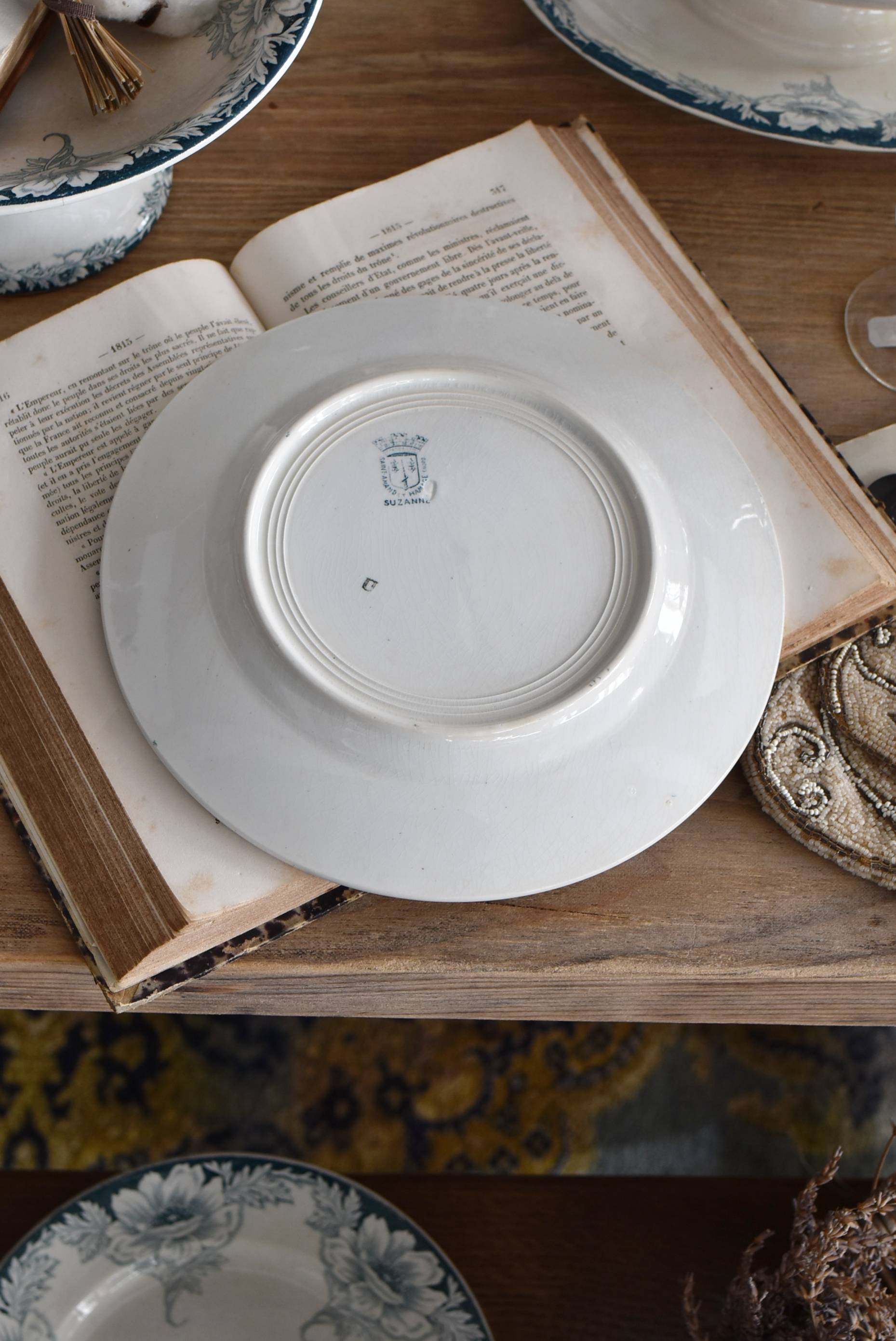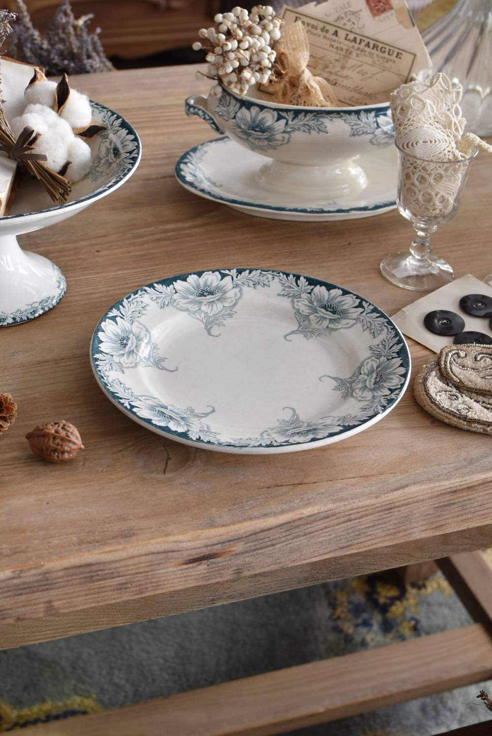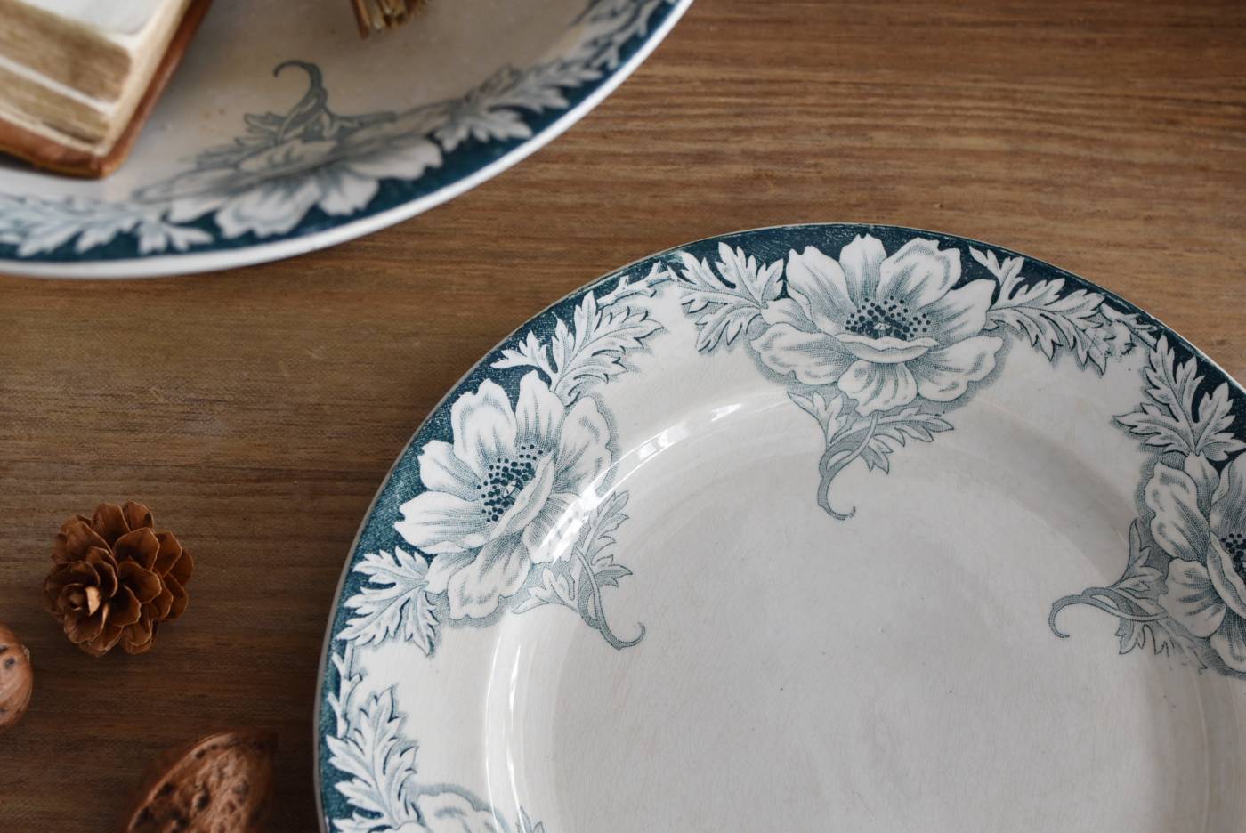 すっきりとしたラウンド型になったフランス・St.Amandのアンティークプレート。 大胆にあしらわれた6つのお花模様がバランス良く配置されたSUZANNEシリーズ、外側に向かって広がる姿から端正な美しさが伝わってきます。躍動感のある葉っぱは繊細さも兼ね備わっており、グリーンがかった落ち着いた色合いとなったシックな印象のあるデザインです。 底面が少し丸みがある為、若干のガタつきがあります。それぞれでの販売となりますが、同じシリーズの皿やコンポート、ソーシエールがあります。(SUZANNEシリーズ)しっかりと幅のあるリム部分は少し高さのある作りとなっており、卓上を豪華に彩ってくれます。 直径 約21.5cm H 約2.5cm