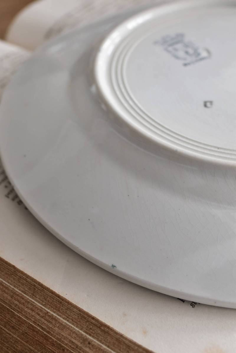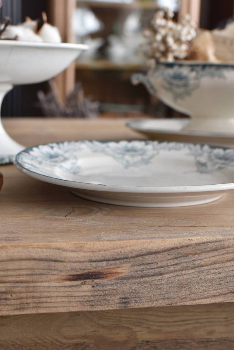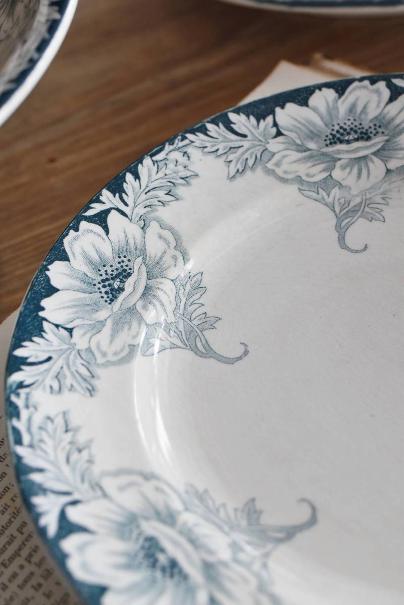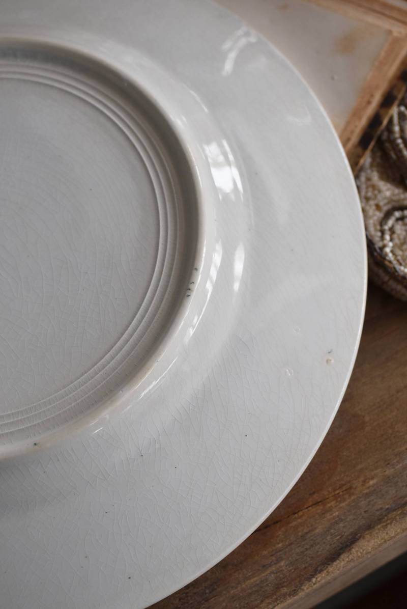 すっきりとしたラウンド型になったフランス・St.Amandのアンティークプレート。 大胆にあしらわれた6つのお花模様がバランス良く配置されたSUZANNEシリーズ、外側に向かって広がる姿から端正な美しさが伝わってきます。躍動感のある葉っぱは繊細さも兼ね備わっており、グリーンがかった落ち着いた色合いとなったシックな印象のあるデザインです。 底面が少し丸みがある為、若干のガタつきがあります。それぞれでの販売となりますが、同じシリーズの皿やコンポート、ソーシエールがあります。(SUZANNEシリーズ)しっかりと幅のあるリム部分は少し高さのある作りとなっており、卓上を豪華に彩ってくれます。 直径 約21.5cm H 約2.5cm