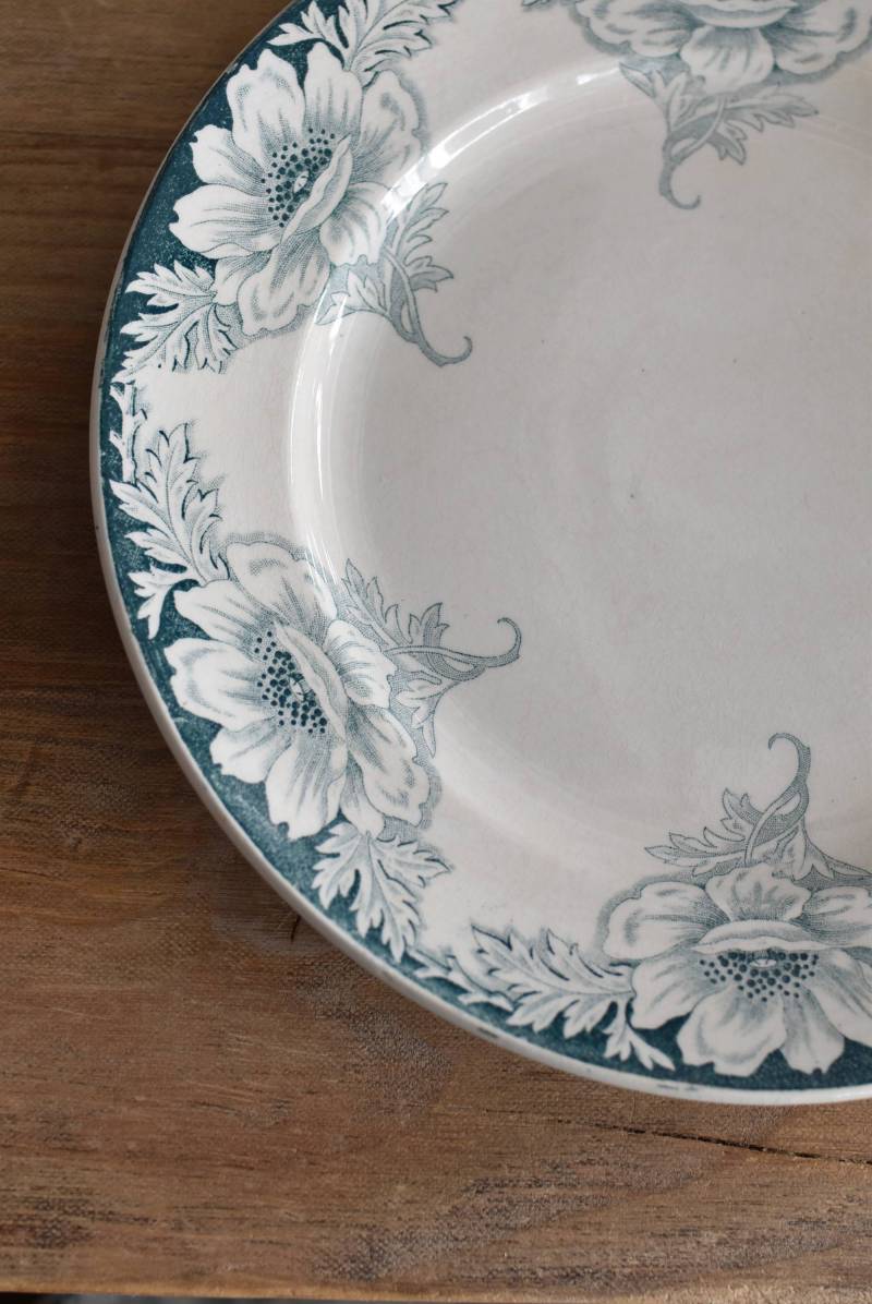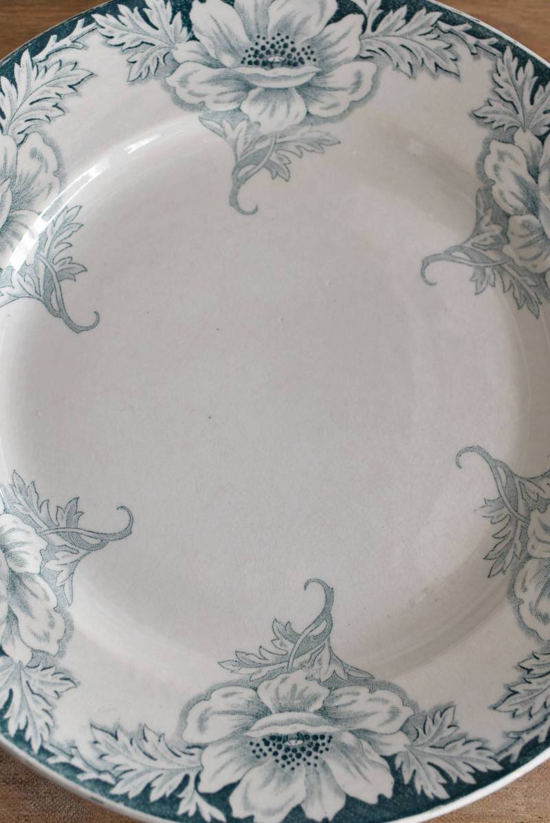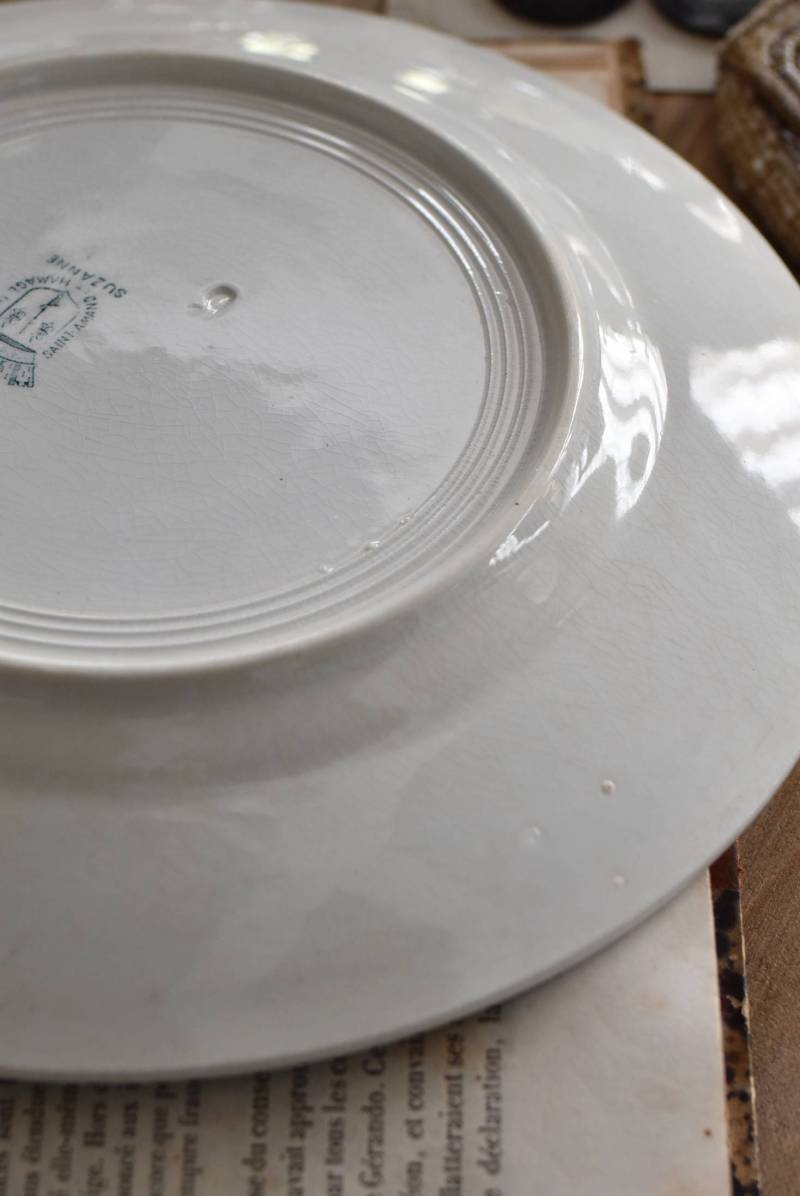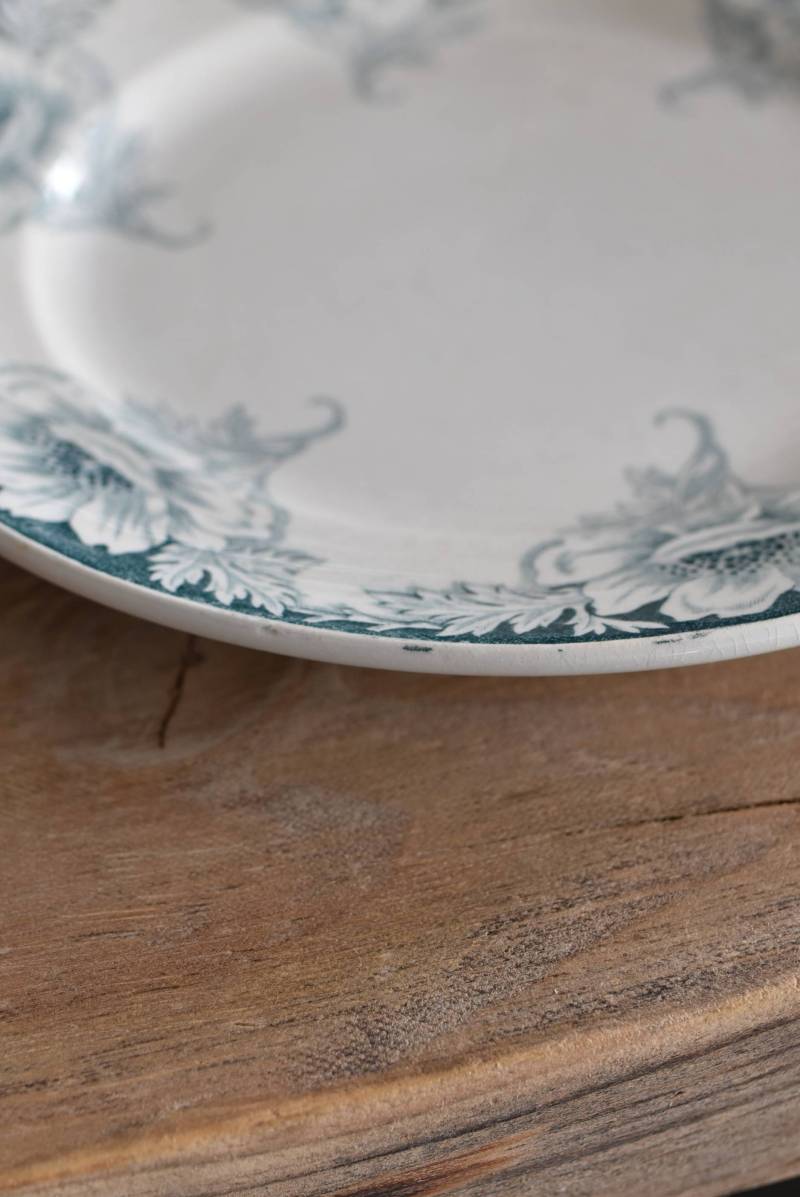 すっきりとしたラウンド型になったフランス・St.Amandのアンティークプレート。 大胆にあしらわれた6つのお花模様がバランス良く配置されたSUZANNEシリーズ、外側に向かって広がる姿から端正な美しさが伝わってきます。躍動感のある葉っぱは繊細さも兼ね備わっており、グリーンがかった落ち着いた色合いとなったシックな印象のあるデザインです。 それぞれでの販売となりますが、同じシリーズの皿やコンポート、ソーシエールがあります。(SUZANNEシリーズ)しっかりと幅のあるリム部分は少し高さのある作りとなっており、卓上を豪華に彩ってくれます。 直径 約21.5cm H 約2.5cm