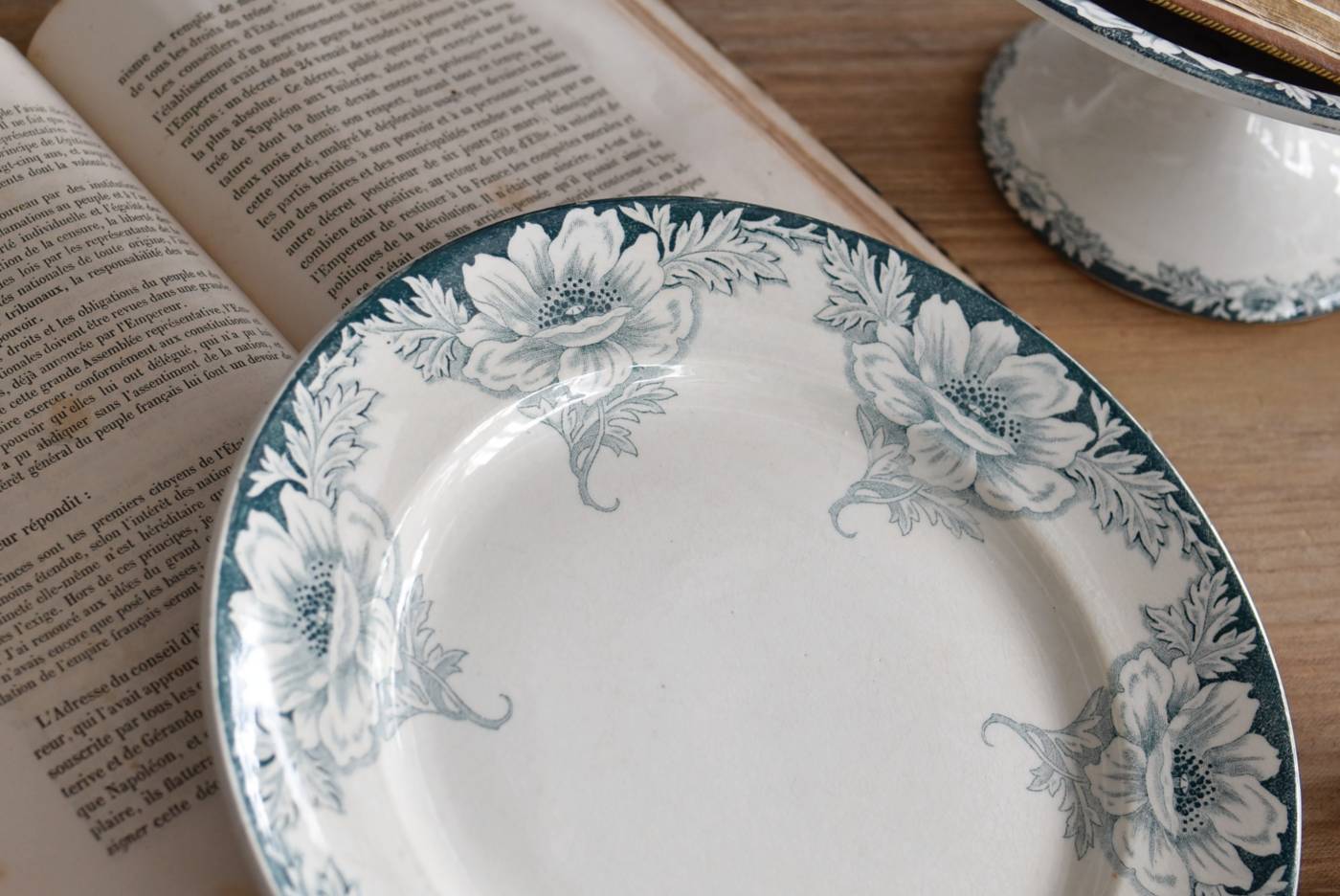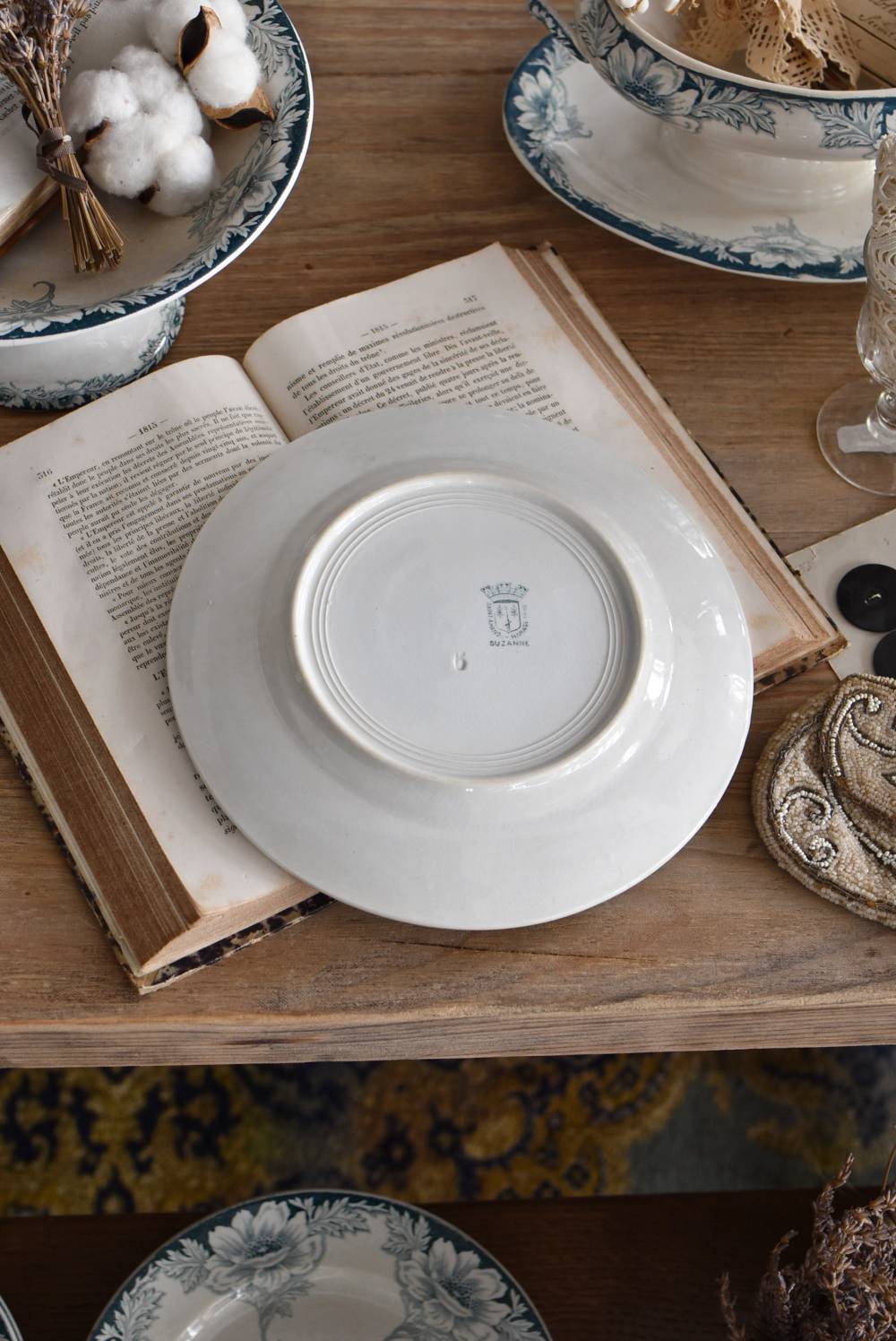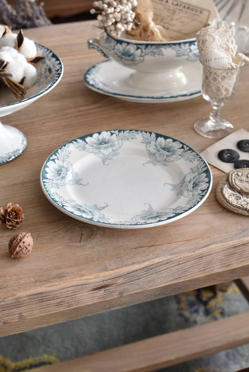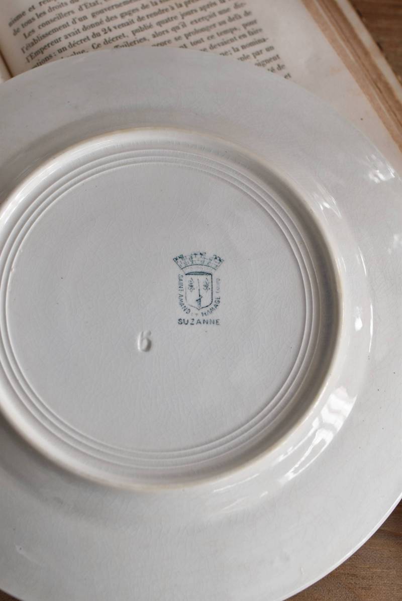 すっきりとしたラウンド型になったフランス・St.Amandのアンティークプレート。 大胆にあしらわれた6つのお花模様がバランス良く配置されたSUZANNEシリーズ、外側に向かって広がる姿から端正な美しさが伝わってきます。躍動感のある葉っぱは繊細さも兼ね備わっており、グリーンがかった落ち着いた色合いとなったシックな印象のあるデザインです。 それぞれでの販売となりますが、同じシリーズの皿やコンポート、ソーシエールがあります。(SUZANNEシリーズ)しっかりと幅のあるリム部分は少し高さのある作りとなっており、卓上を豪華に彩ってくれます。 直径 約21.5cm H 約2.5cm