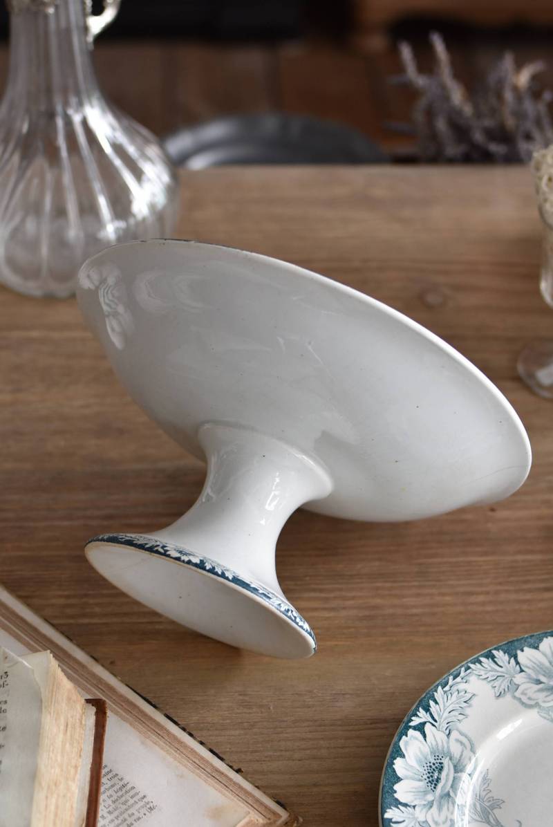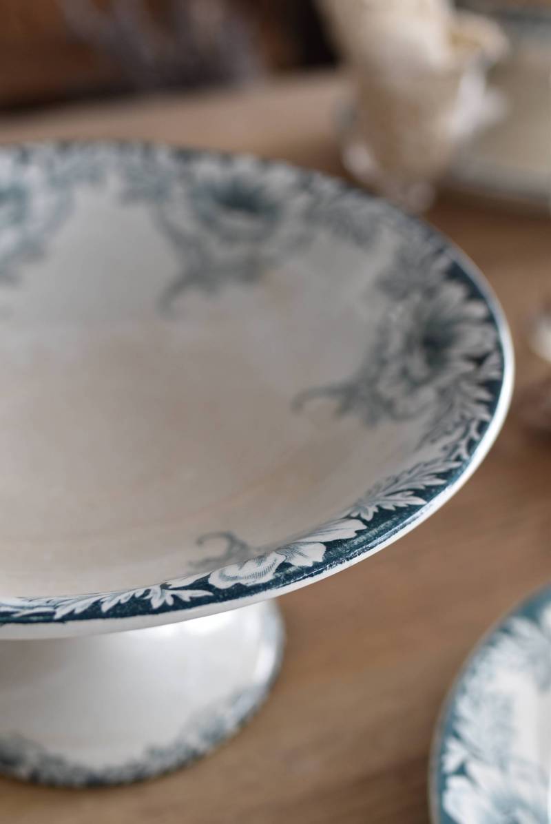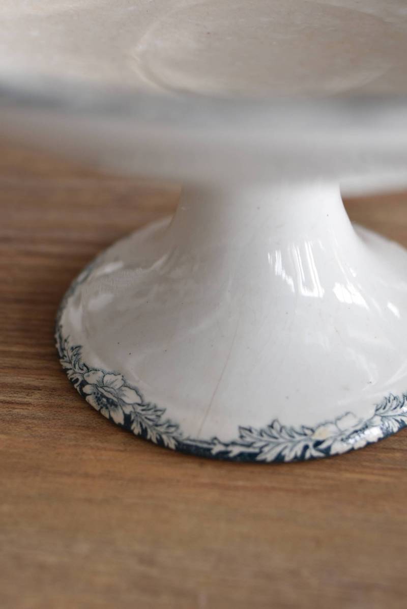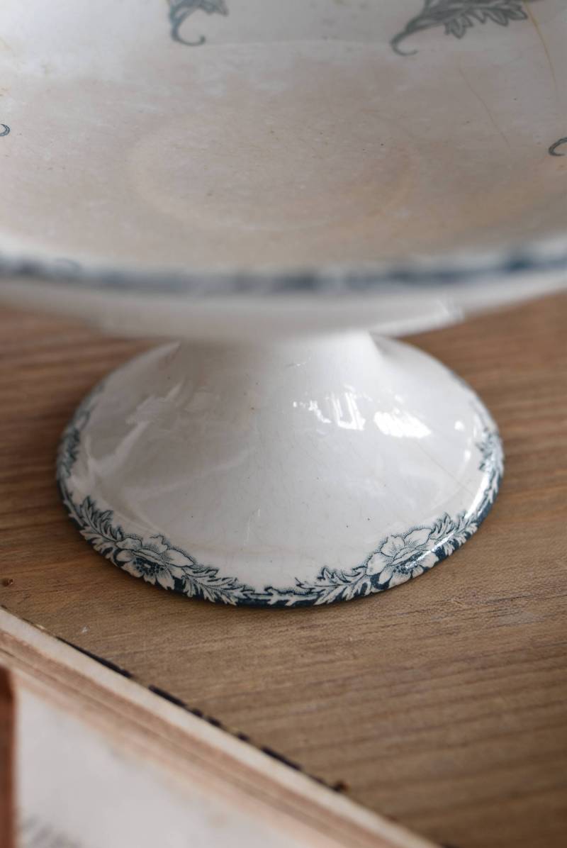 フランス・St.Amandのアンティークコンポート。 大胆にあしらわれた6つのお花模様がバランス良く配置されたSUZANNEシリーズ、外側に向かって広がる姿から端正な美しさが伝わってきます。滑らかな形状となった土台周りにも細やかな模様が施されており、自然モチーフならではの優雅さが漂うデザインです。 それぞれでの販売となりますが、同じシリーズの皿やコンポート、ソーシエールがあります。(SUZANNEシリーズ)深みのあるグリーンがかった深みのある色合いも上品で、甘すぎないシックなディスプレイが楽しめます。 直径 約22.5cm H 約11.5cm 土台直径 約11cm