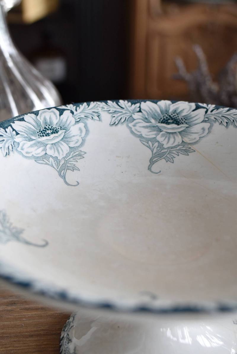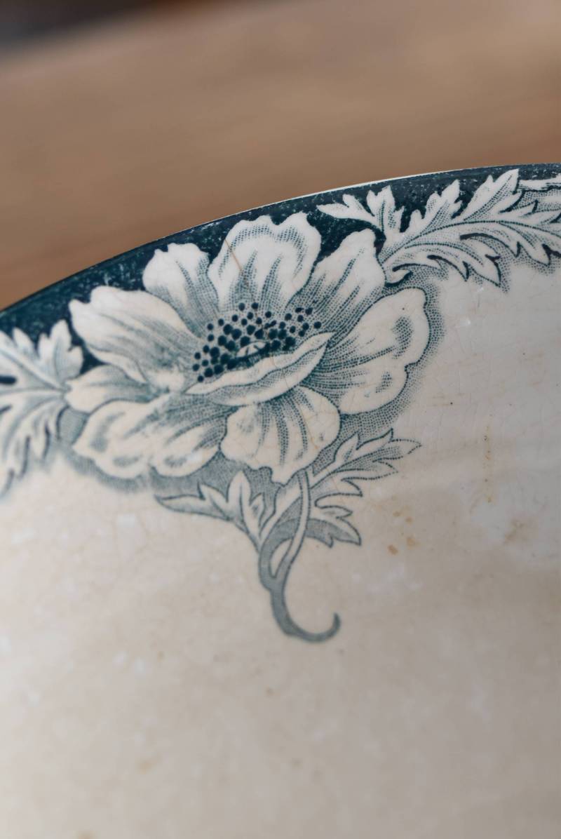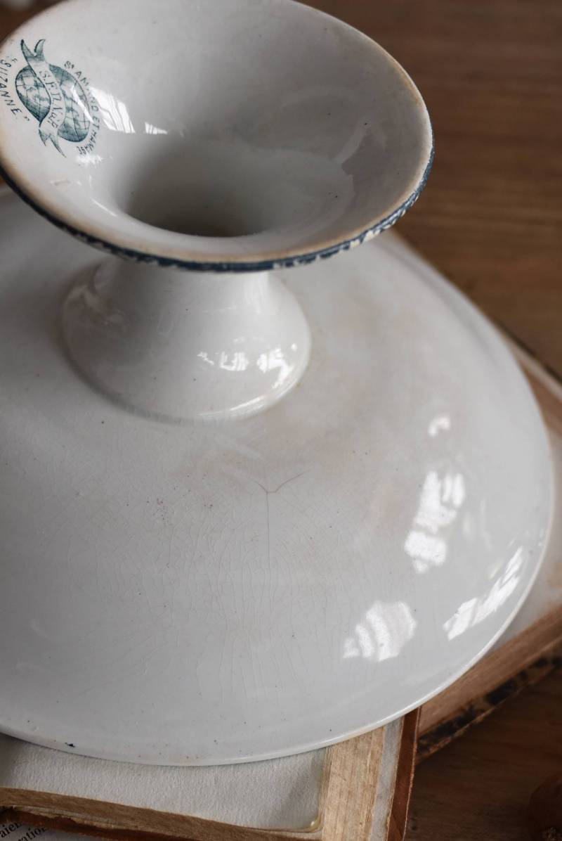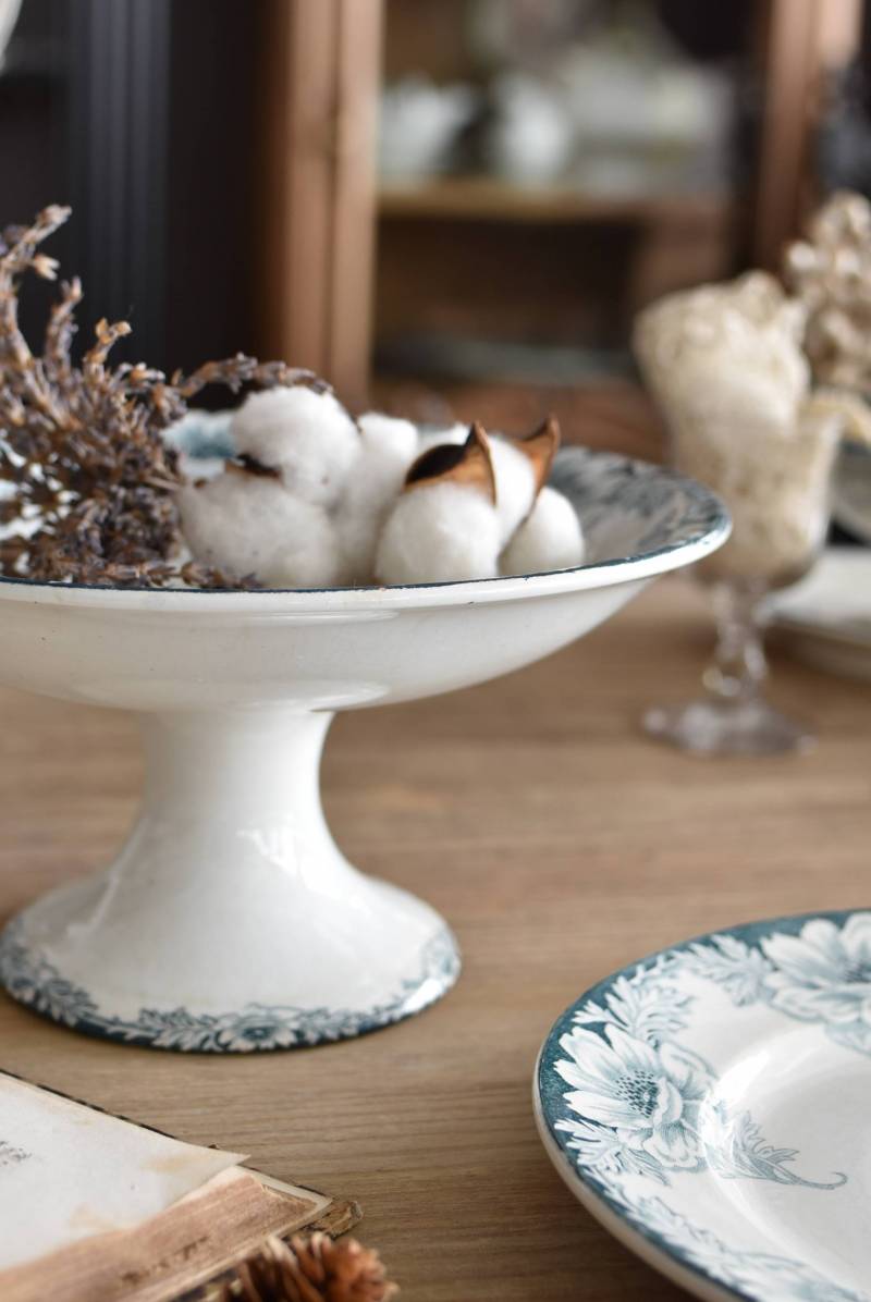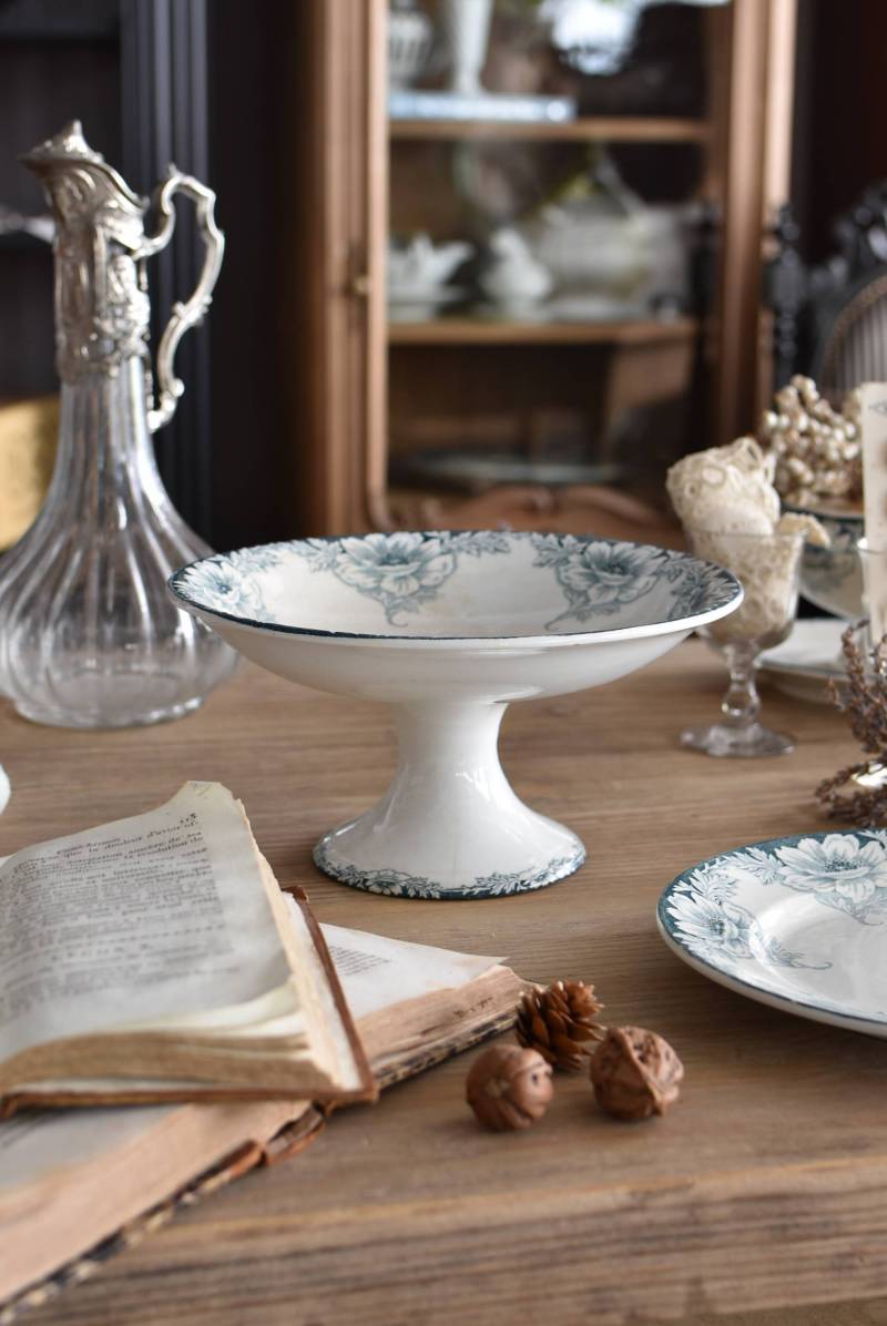 フランス・St.Amandのアンティークコンポート。 大胆にあしらわれた6つのお花模様がバランス良く配置されたSUZANNEシリーズ、外側に向かって広がる姿から端正な美しさが伝わってきます。滑らかな形状となった土台周りにも細やかな模様が施されており、自然モチーフならではの優雅さが漂うデザインです。 それぞれでの販売となりますが、同じシリーズの皿やコンポート、ソーシエールがあります。(SUZANNEシリーズ)深みのあるグリーンがかった深みのある色合いも上品で、甘すぎないシックなディスプレイが楽しめます。 直径 約22.5cm H 約11.5cm 土台直径 約11cm