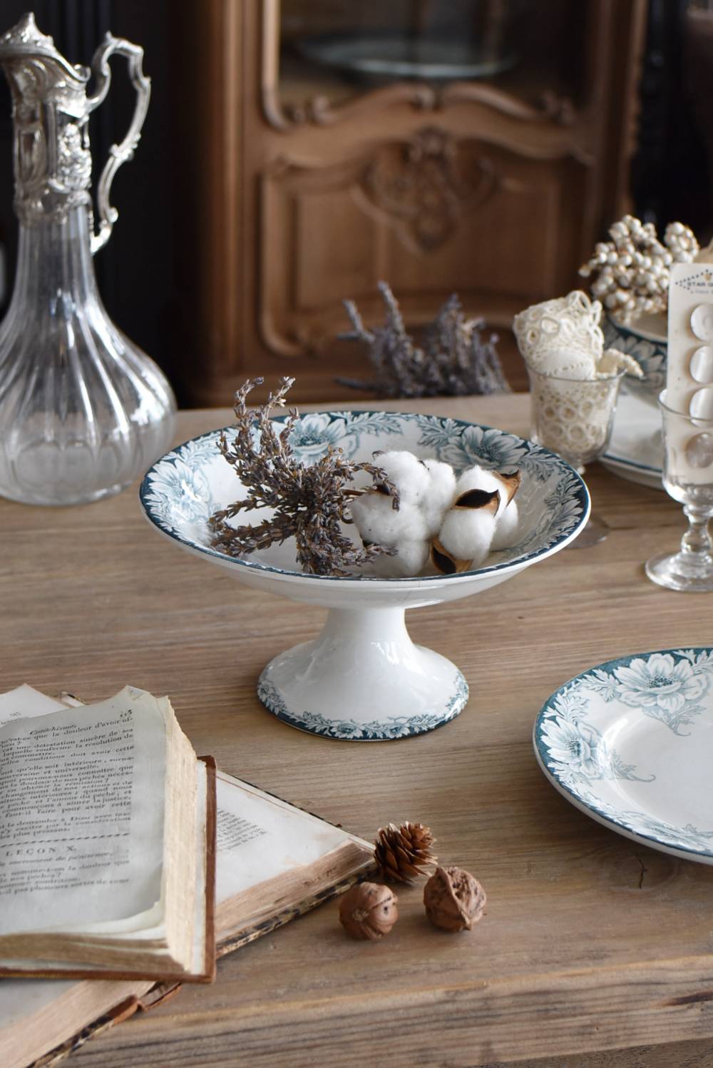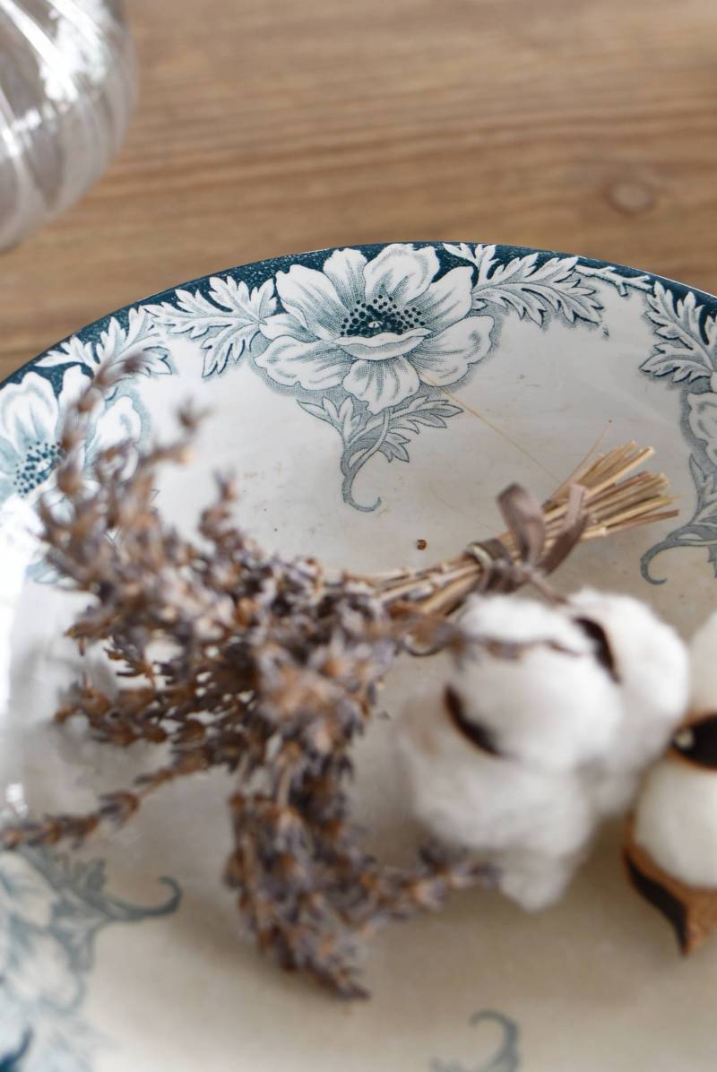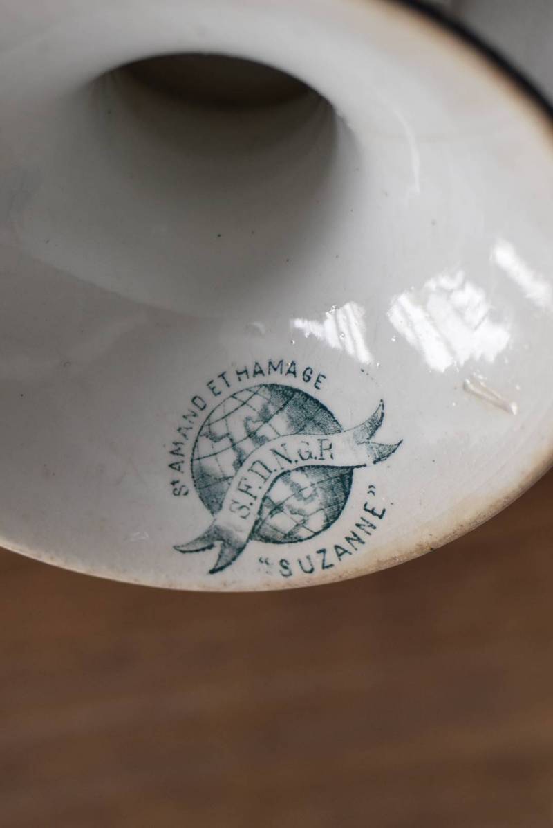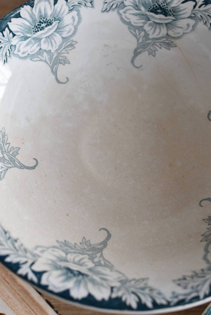 フランス・St.Amandのアンティークコンポート。 大胆にあしらわれた6つのお花模様がバランス良く配置されたSUZANNEシリーズ、外側に向かって広がる姿から端正な美しさが伝わってきます。滑らかな形状となった土台周りにも細やかな模様が施されており、自然モチーフならではの優雅さが漂うデザインです。 それぞれでの販売となりますが、同じシリーズの皿やコンポート、ソーシエールがあります。(SUZANNEシリーズ)深みのあるグリーンがかった深みのある色合いも上品で、甘すぎないシックなディスプレイが楽しめます。 直径 約22.5cm H 約11.5cm 土台直径 約11cm