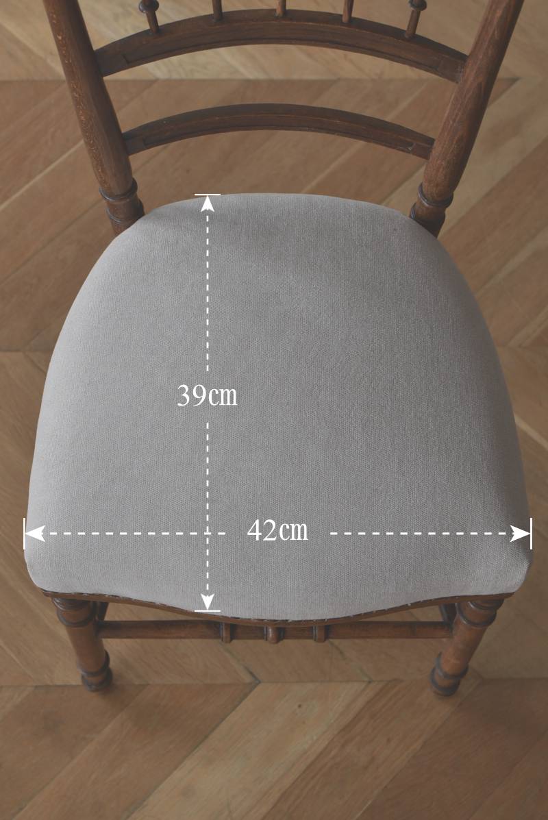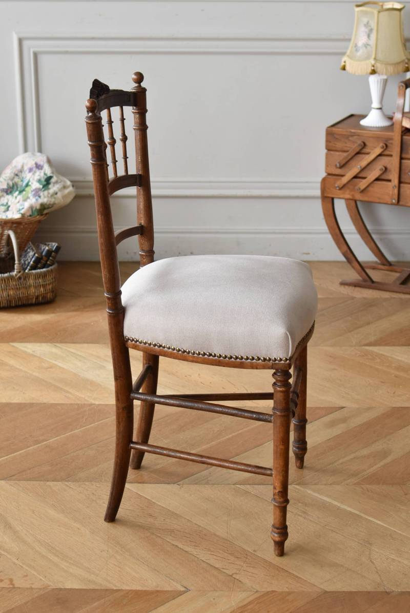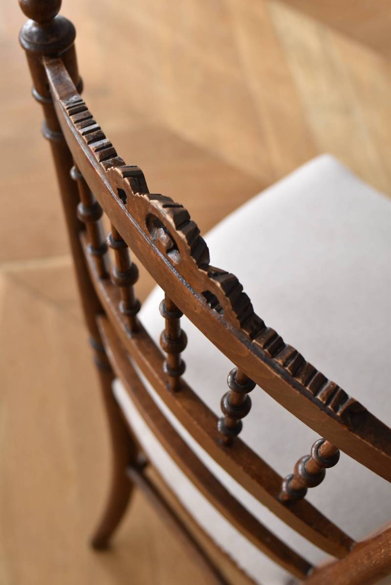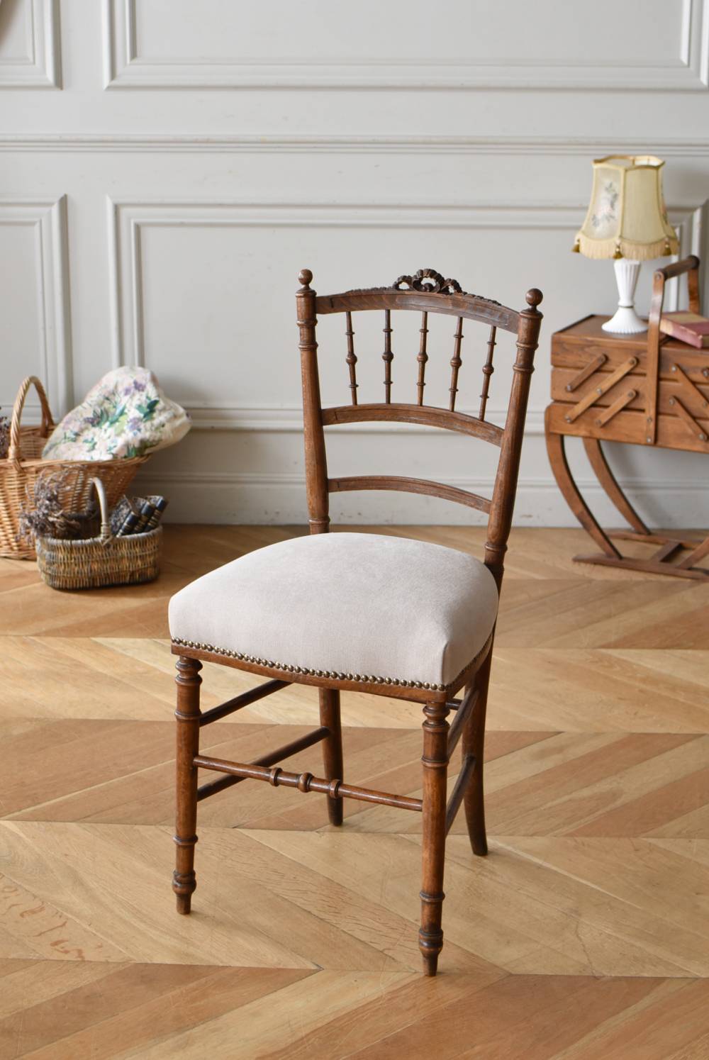 フランスのアンティークチェア。 背もたれトップのリボン装飾と細やかなラインが並んだ中央には球体があしらわれた可憐な佇まい。バンブーをモチーフとしたような洗練された脚によってすっきりと見せながらも品格のあるデザインとなり、スタイリッシュな雰囲気をもたらしてくれます。 華奢ながらも厚みのある木材が使われ、穏やかでナチュラルな空間づくりに活躍してくれそうです。フレームは一度パーツ毎にバラしてから、しっかりと組み直しを行っています。座面内側はウレタンに交換し、ファブリックも新しく張り替えており、沈み込みすぎない座り心地です。 W 約42cm D 約43.5cm H 約89.5cm 座面までH 約51cm