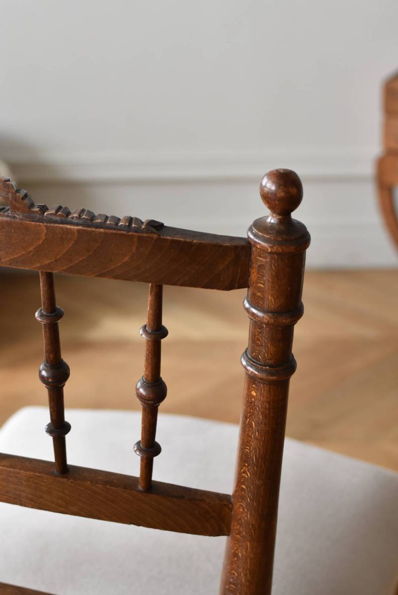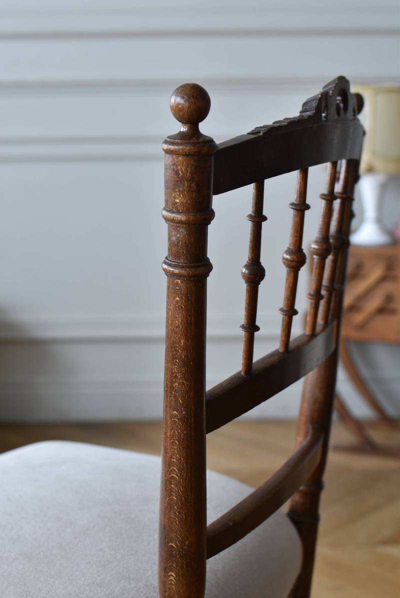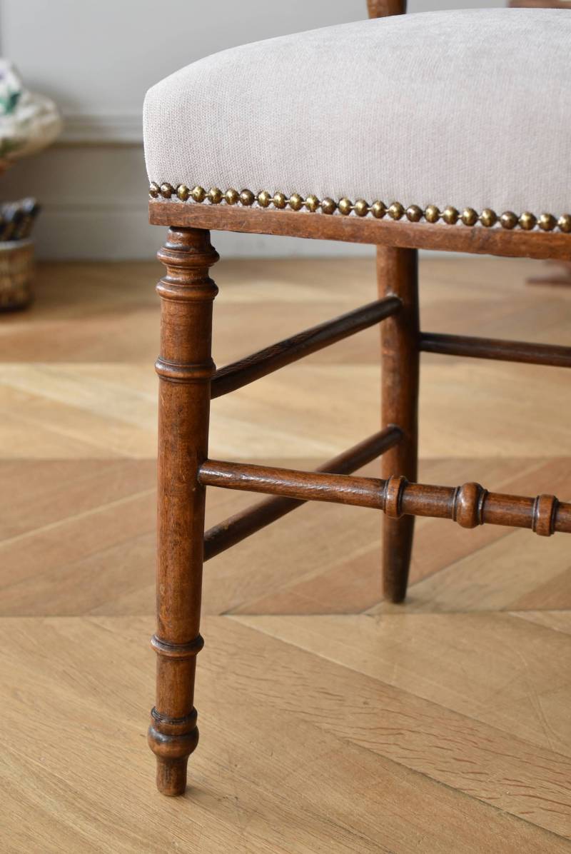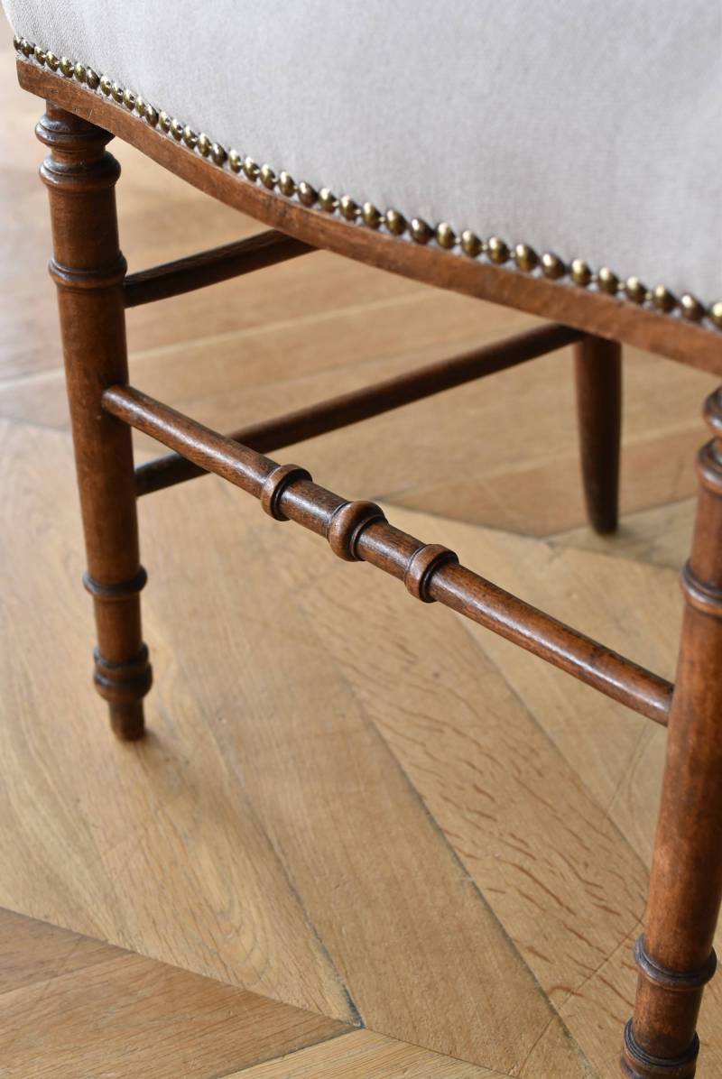 フランスのアンティークチェア。 背もたれトップのリボン装飾と細やかなラインが並んだ中央には球体があしらわれた可憐な佇まい。バンブーをモチーフとしたような洗練された脚によってすっきりと見せながらも品格のあるデザインとなり、スタイリッシュな雰囲気をもたらしてくれます。 華奢ながらも厚みのある木材が使われ、穏やかでナチュラルな空間づくりに活躍してくれそうです。フレームは一度パーツ毎にバラしてから、しっかりと組み直しを行っています。座面内側はウレタンに交換し、ファブリックも新しく張り替えており、沈み込みすぎない座り心地です。 W 約42cm D 約43.5cm H 約89.5cm 座面までH 約51cm