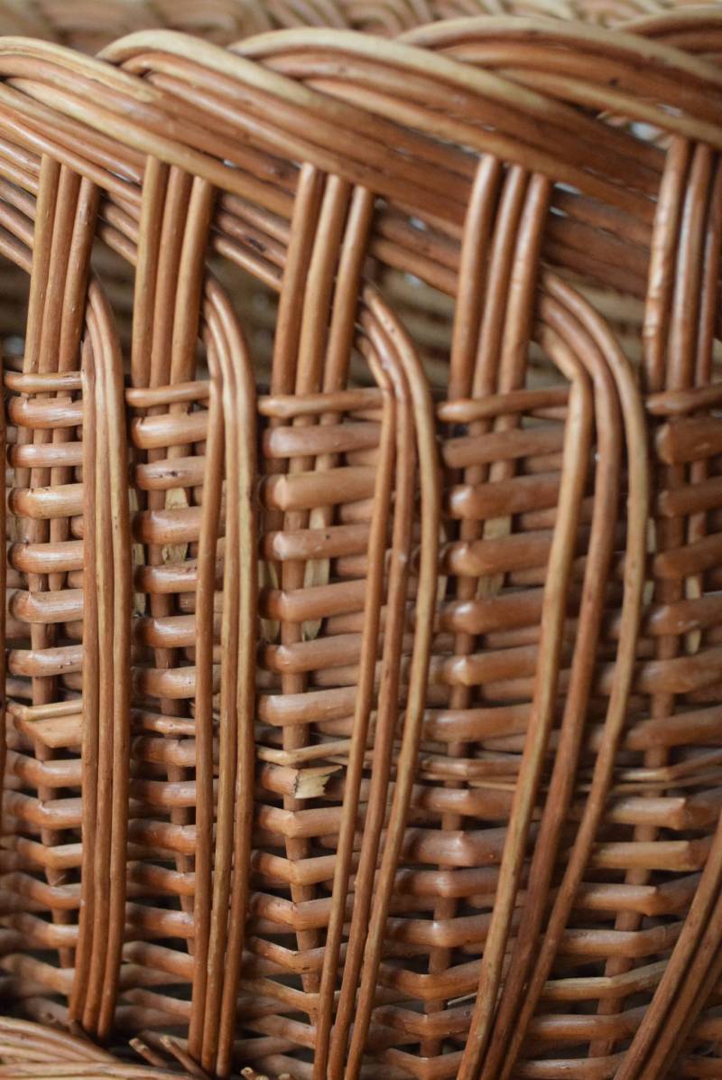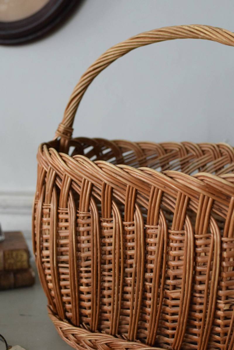 フランスのナチュラルバスケット。 大きなアーチを描いたハンドルが目を引き、様々な編み模様が複雑に組み合わされた手の込んだデザイン。上部には抜け感のある模様も取り入れられ、軽やかで優しげな印象に。 オーバル型で適度な深さがあり、ボトルや雑誌なども収納しやすく、ディスプレイとしても活躍します。 古いものですので多少のダメージは見られますが、使い込まれた自然な風合いをお楽しみください。 W 約42cm D 約24cm H 約41.5cm 深さ 約23cm