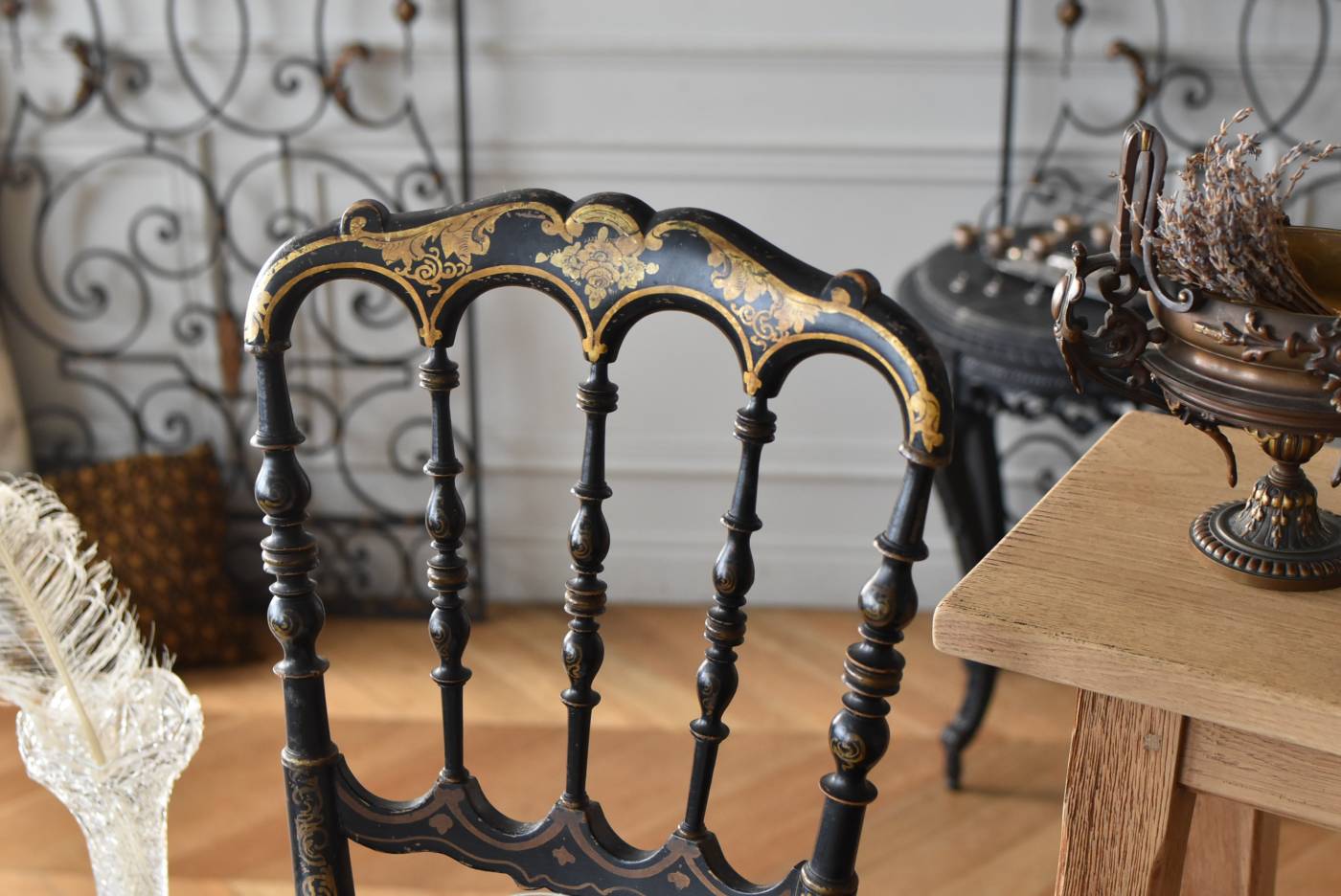 繊細なお花模様などの金彩がしっかりと残っており、ベースのブラックカラーによって凛と引き締まった印象を受けます。くるんとしたアーチを描き、節のある細やかなデザインからも丁寧な細工にうっとりさせられ、ポコポコと丸みのある形状が連なったリズミカルなデザインです。