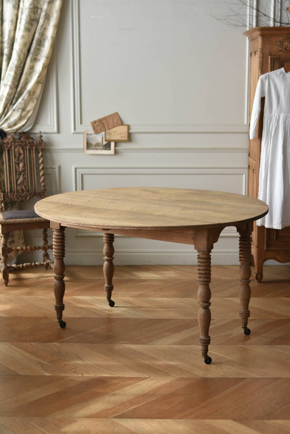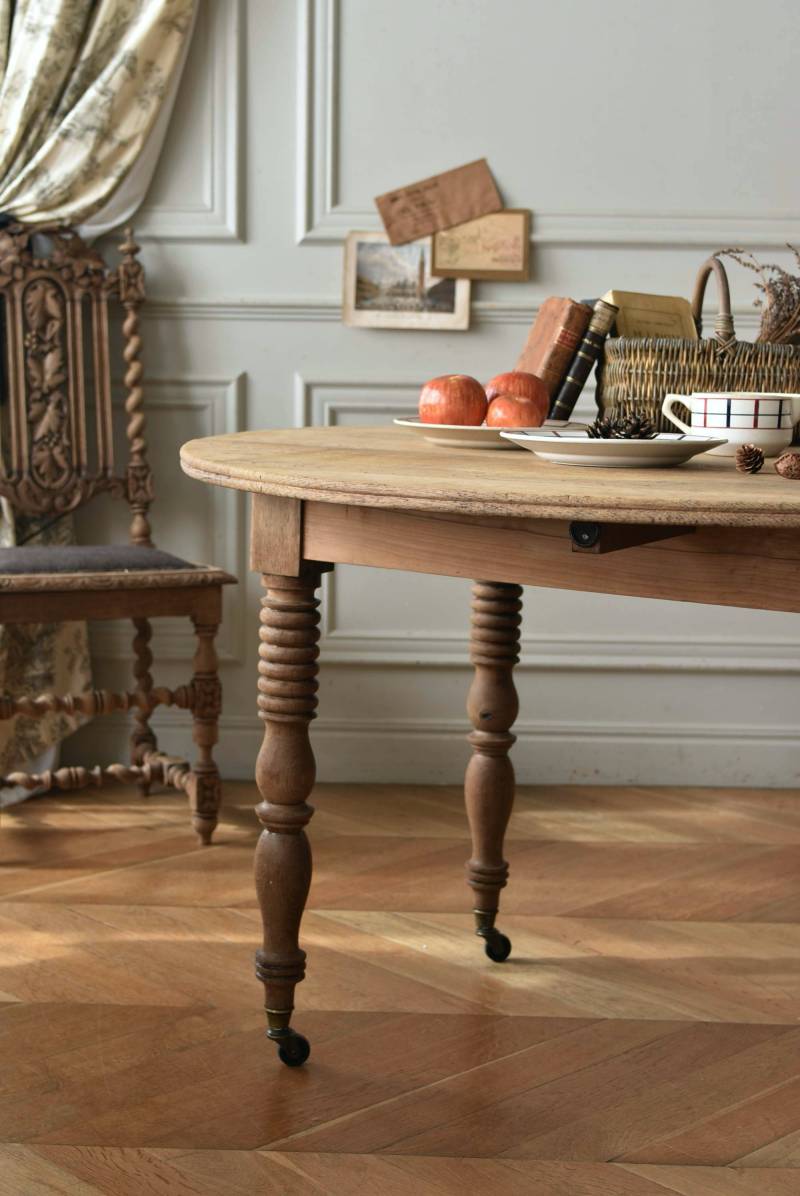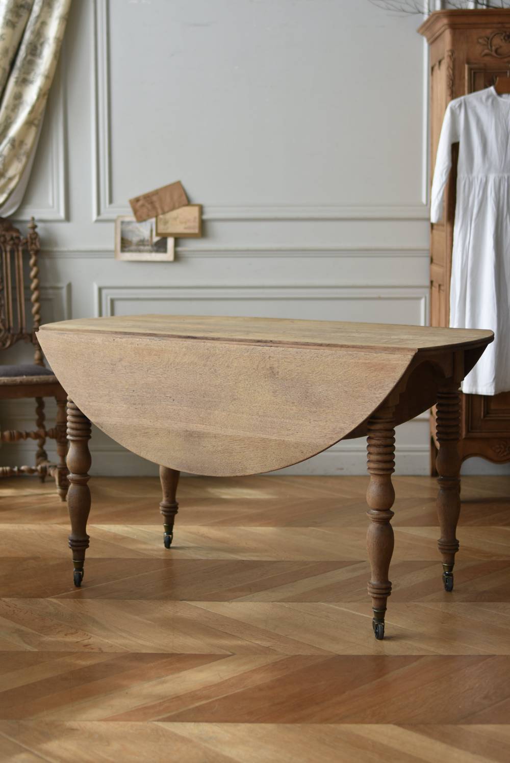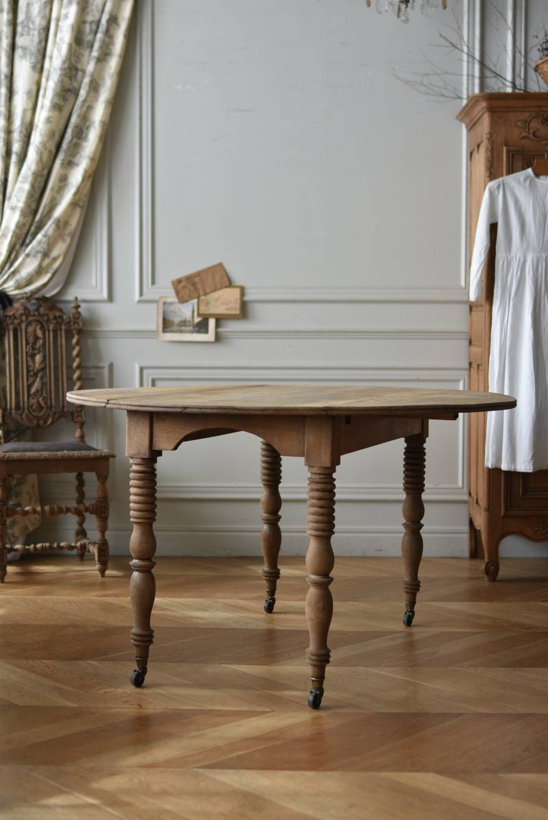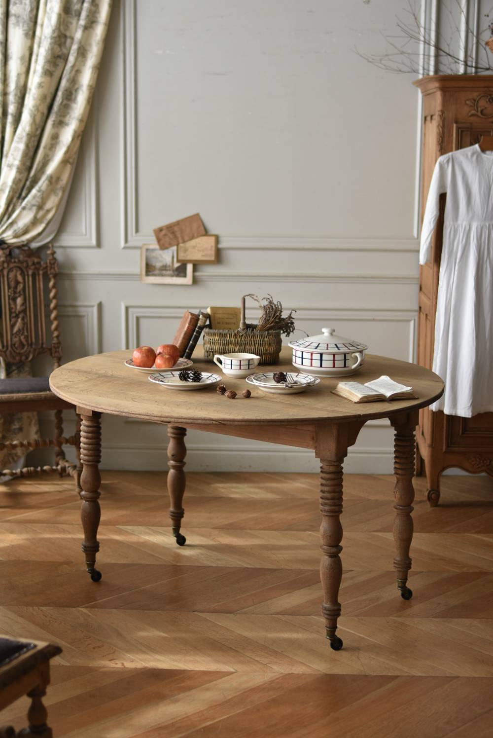 フランスのバタフライテーブル。 木の温もりを感じられる素朴な表情で、ラフすぎない程よい重厚感が魅力的。まあるい天板に凹凸のはっきりとした脚元が目を惹き、独自の存在感を発揮してくれるデザインとなっています。両サイドの天板は蝶々の羽のようにパタンと折り畳む事ができ、シーンに合わせて天板の広さを変えてお楽しみいただける機能的な一面も。脚先にはキャスターが取り付けられており、移動もスムーズに行えます。 ダイニングテーブルとしてはもちろん、片面を折り畳んでコンソールテーブルとしてアレンジするのもおすすめのアイテムです。 W 約129cm D 約127cm(折り畳み時 約61cm) H 約75.5cm 幕板までのH 約62cm 搬入経路について こちらの商品の配送について