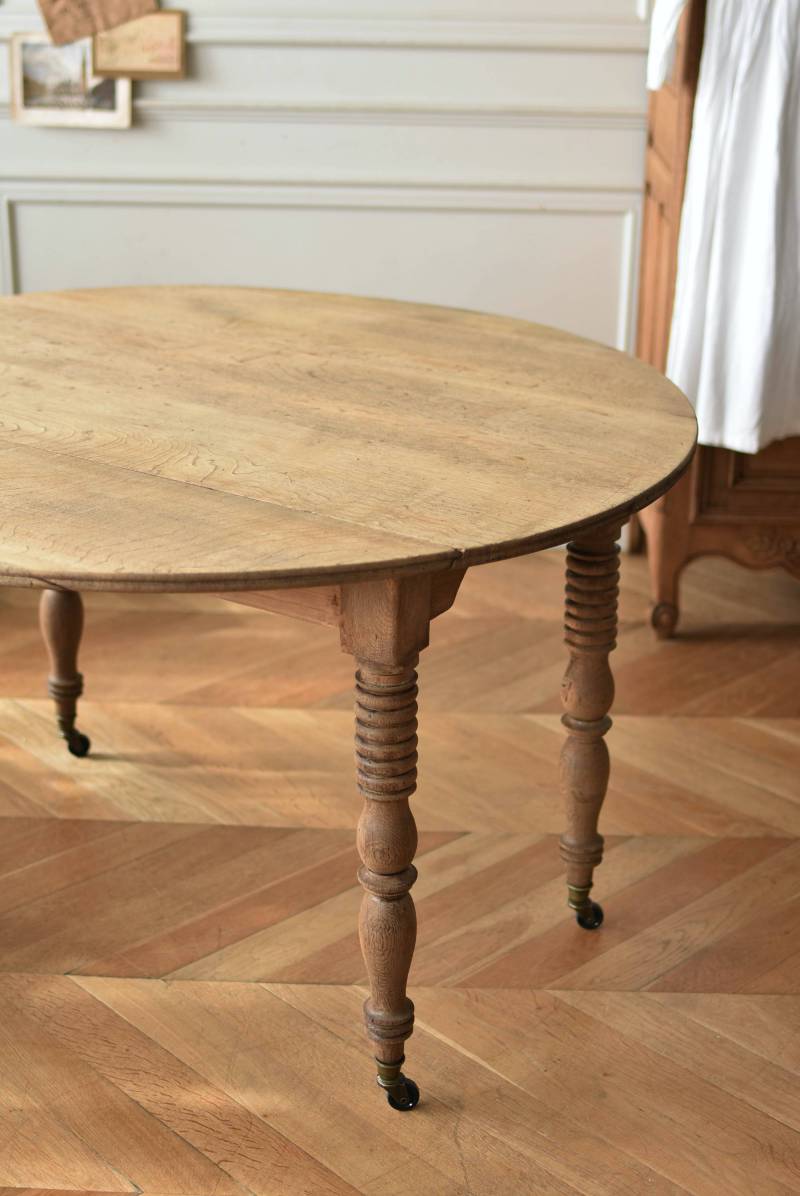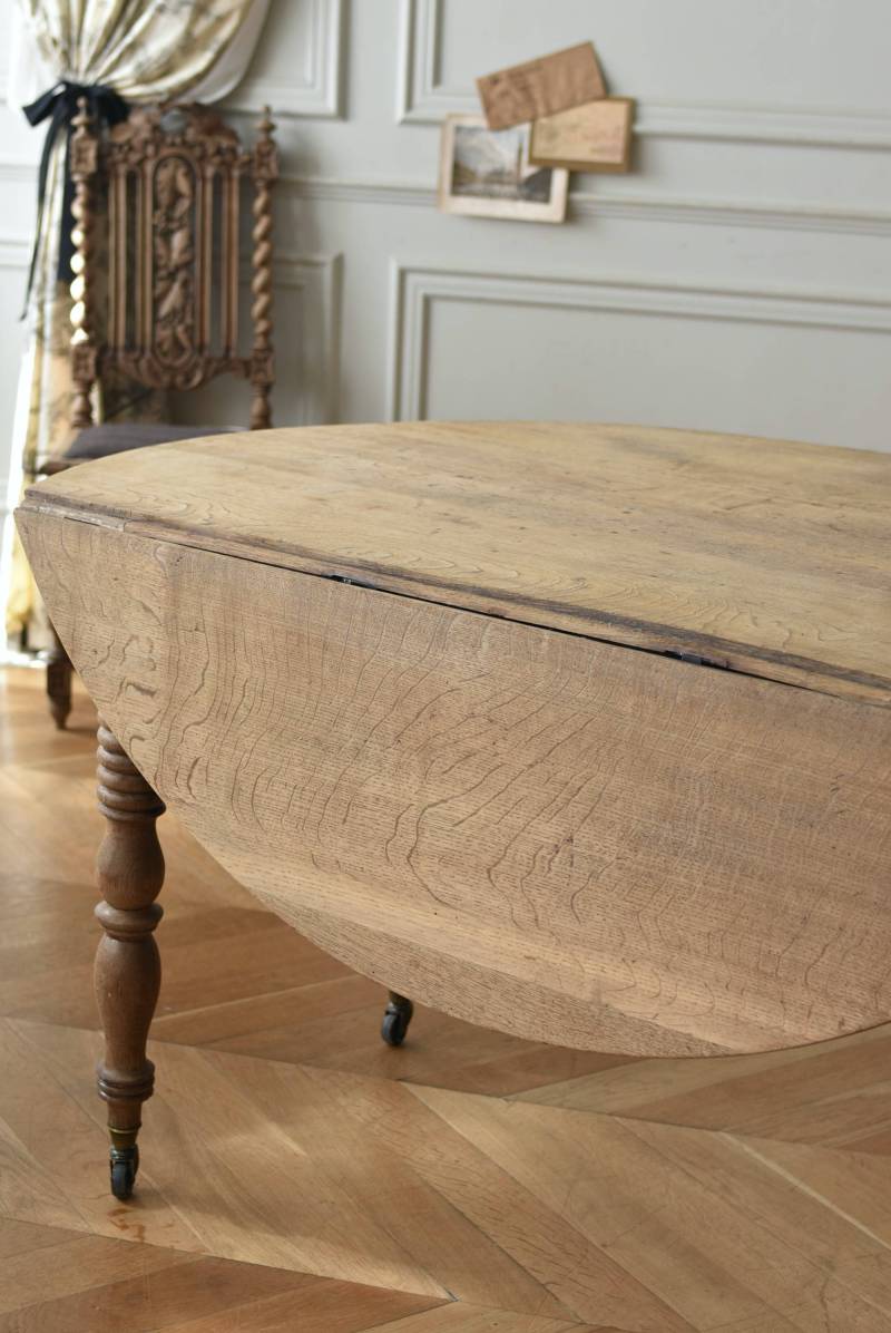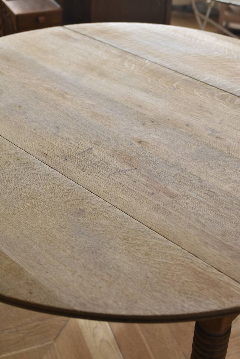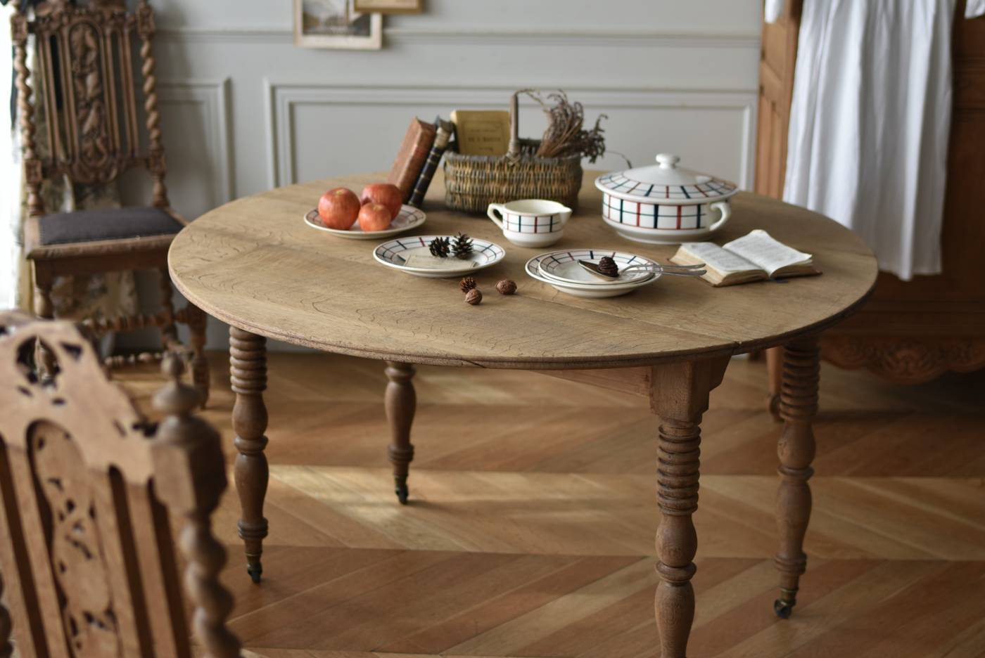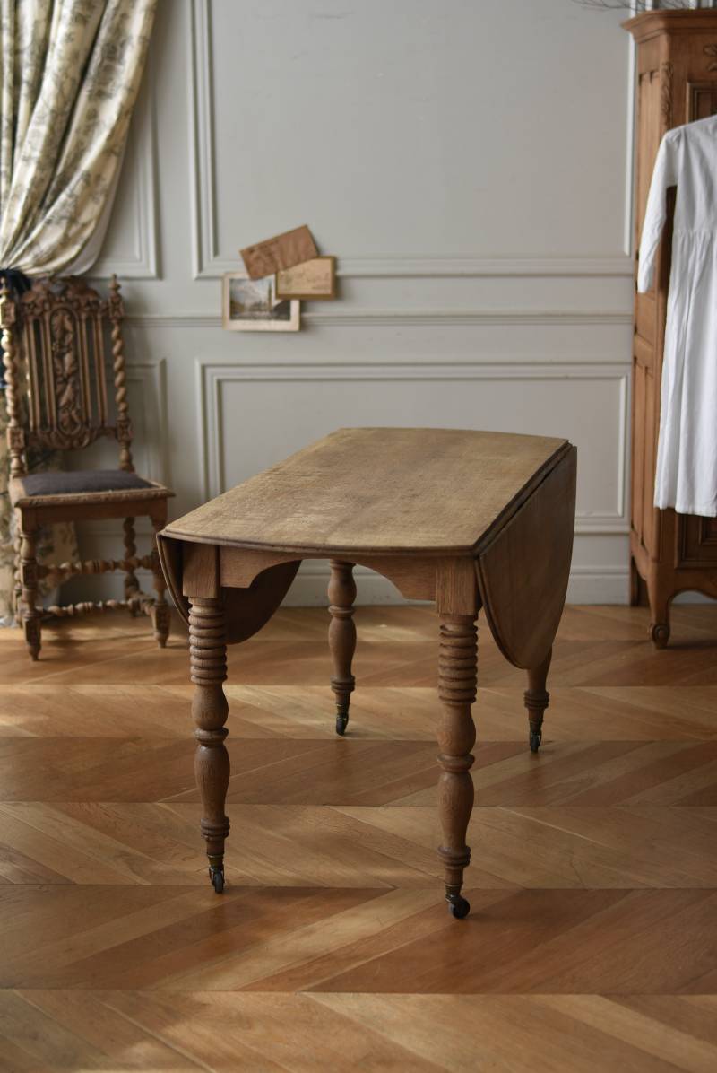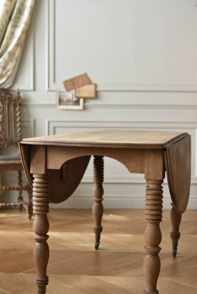 フランスのバタフライテーブル。 木の温もりを感じられる素朴な表情で、ラフすぎない程よい重厚感が魅力的。まあるい天板に凹凸のはっきりとした脚元が目を惹き、独自の存在感を発揮してくれるデザインとなっています。両サイドの天板は蝶々の羽のようにパタンと折り畳む事ができ、シーンに合わせて天板の広さを変えてお楽しみいただける機能的な一面も。脚先にはキャスターが取り付けられており、移動もスムーズに行えます。 ダイニングテーブルとしてはもちろん、片面を折り畳んでコンソールテーブルとしてアレンジするのもおすすめのアイテムです。 W 約129cm D 約127cm(折り畳み時 約61cm) H 約75.5cm 幕板までのH 約62cm 搬入経路について こちらの商品の配送について