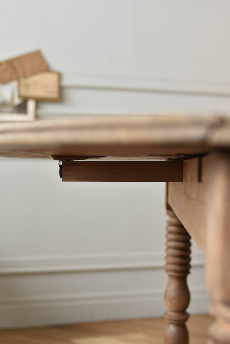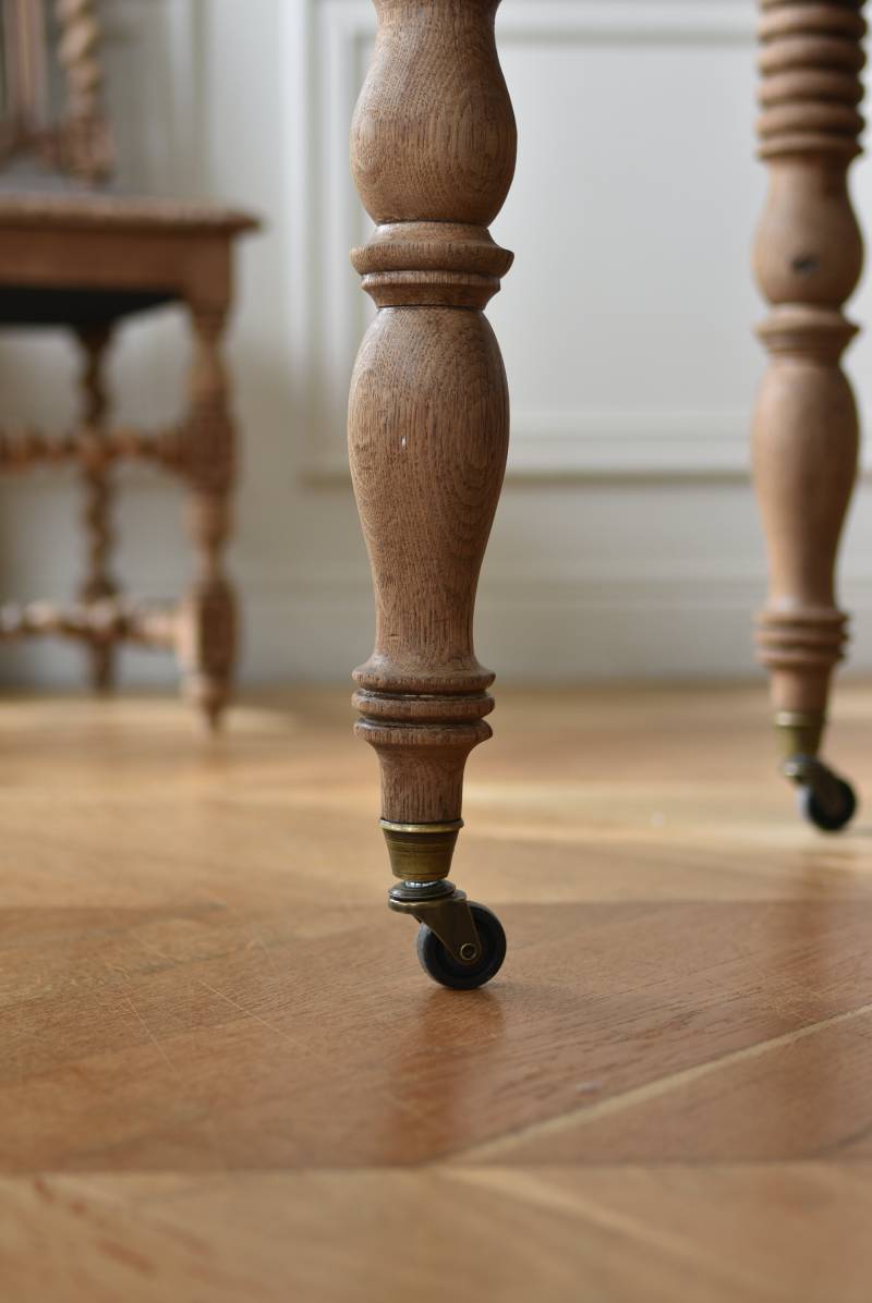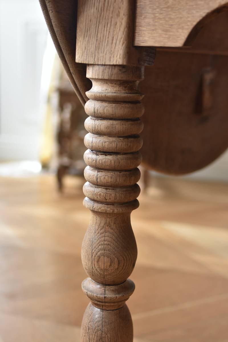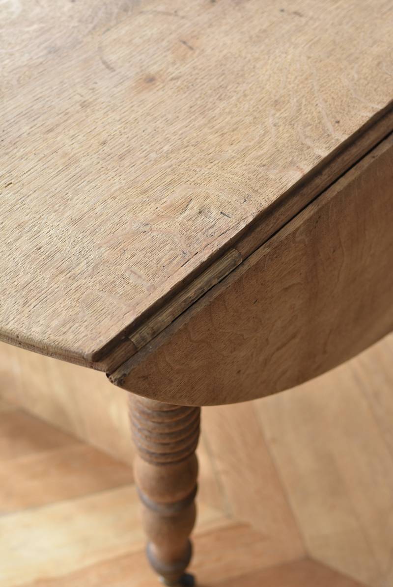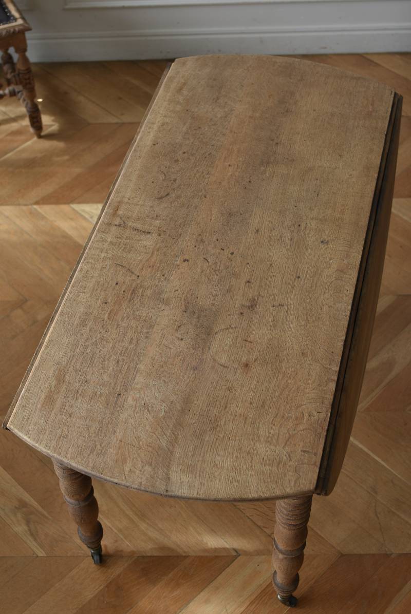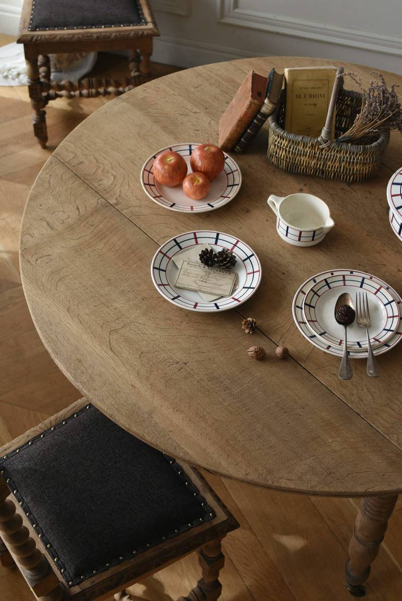 フランスのバタフライテーブル。 木の温もりを感じられる素朴な表情で、ラフすぎない程よい重厚感が魅力的。まあるい天板に凹凸のはっきりとした脚元が目を惹き、独自の存在感を発揮してくれるデザインとなっています。両サイドの天板は蝶々の羽のようにパタンと折り畳む事ができ、シーンに合わせて天板の広さを変えてお楽しみいただける機能的な一面も。脚先にはキャスターが取り付けられており、移動もスムーズに行えます。 ダイニングテーブルとしてはもちろん、片面を折り畳んでコンソールテーブルとしてアレンジするのもおすすめのアイテムです。 W 約129cm D 約127cm(折り畳み時 約61cm) H 約75.5cm 幕板までのH 約62cm 搬入経路について こちらの商品の配送について