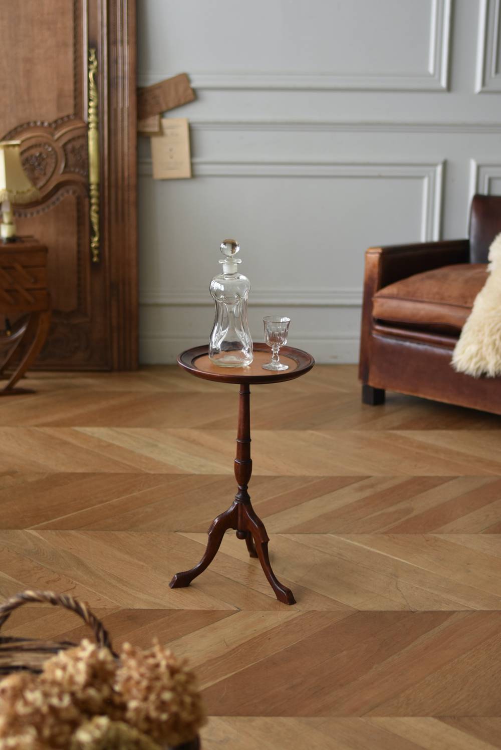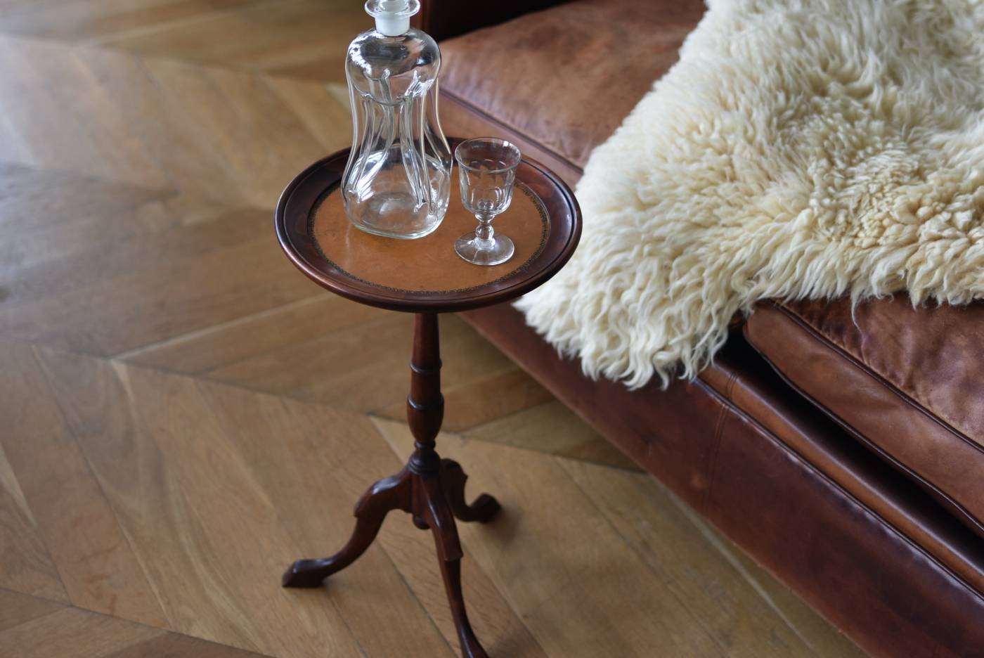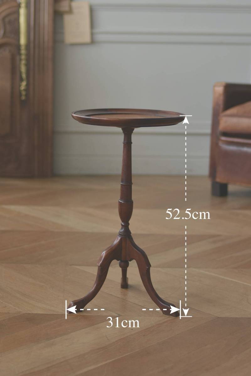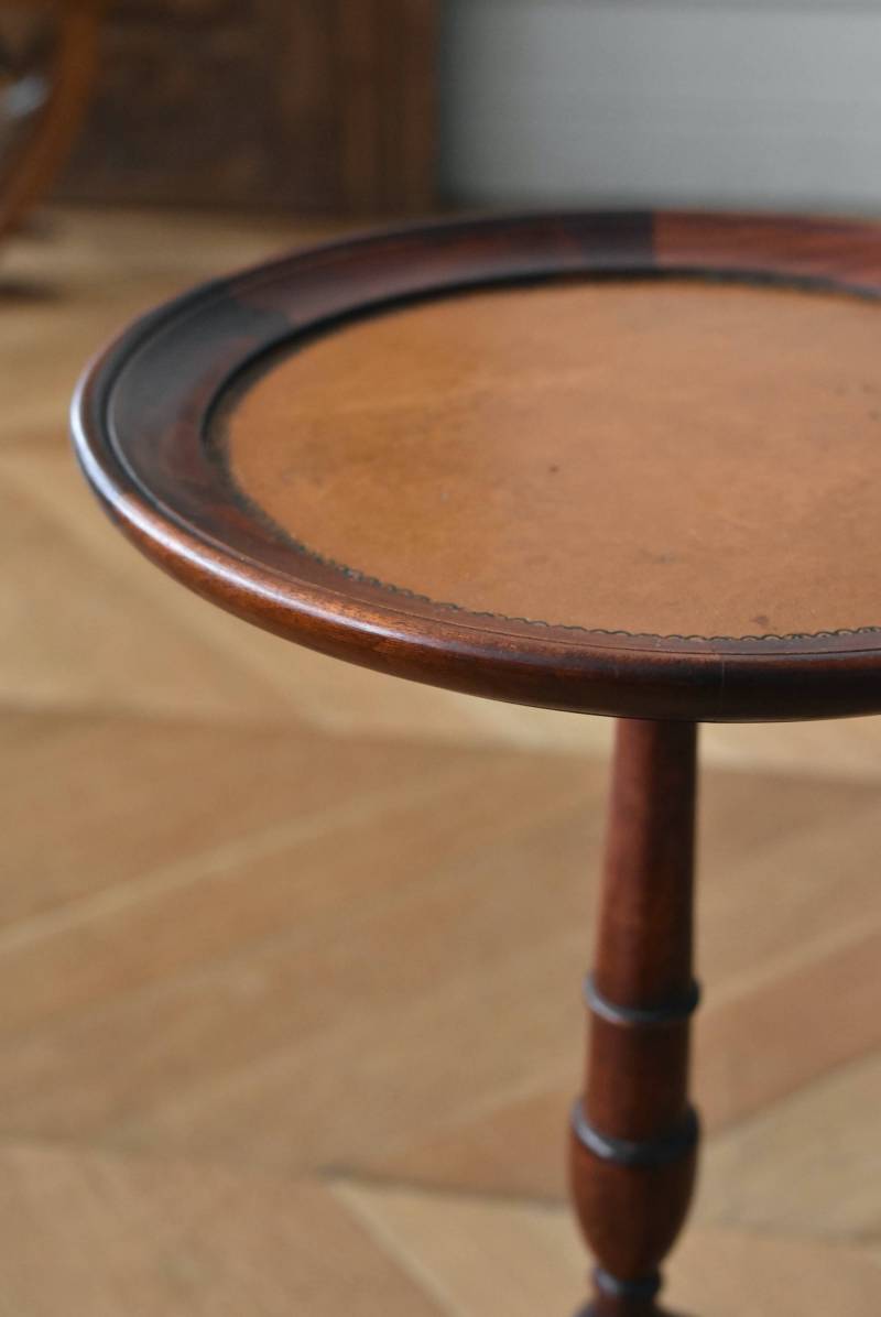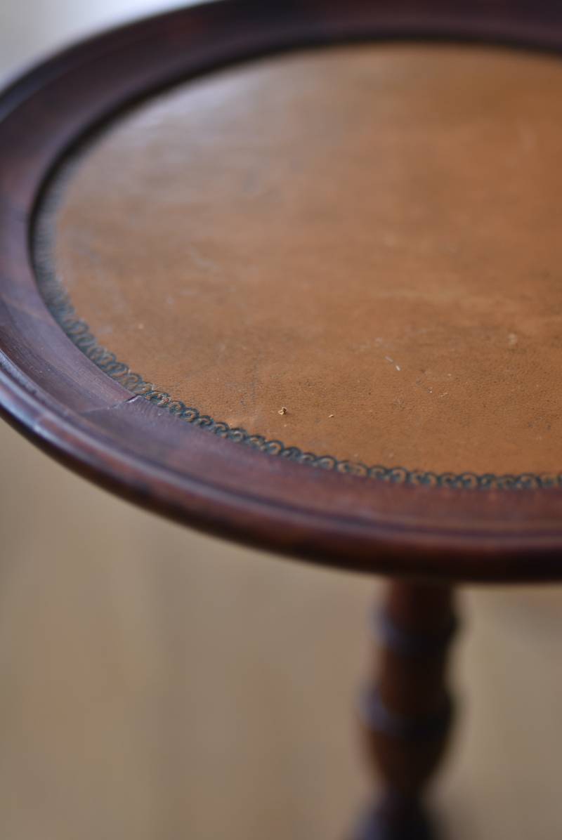 フランスのラウンドサイドテーブル。 上品な艶感のあるレッドブラウンカラーのボディがシックな装いで、伝統的なスタイルを受け継ぐエレガントなフォルムが魅力的。1本の支柱から優雅に広がる3本脚(トライポッド)のデザインは、空間に軽やかさとクラシカルな品格を添えてくれます。天板には薄いレザーが貼られ、縁に型押し模様が施された気品あるデザインに。 コンパクトなサイズ感なのでソファサイドやベッドサイドなど、ちょっとしたスペースにも取り入れることができる使い勝手の良いアイテムです。 天板直径 約30cm 脚元 約30cm×31cm H 約52.5cm