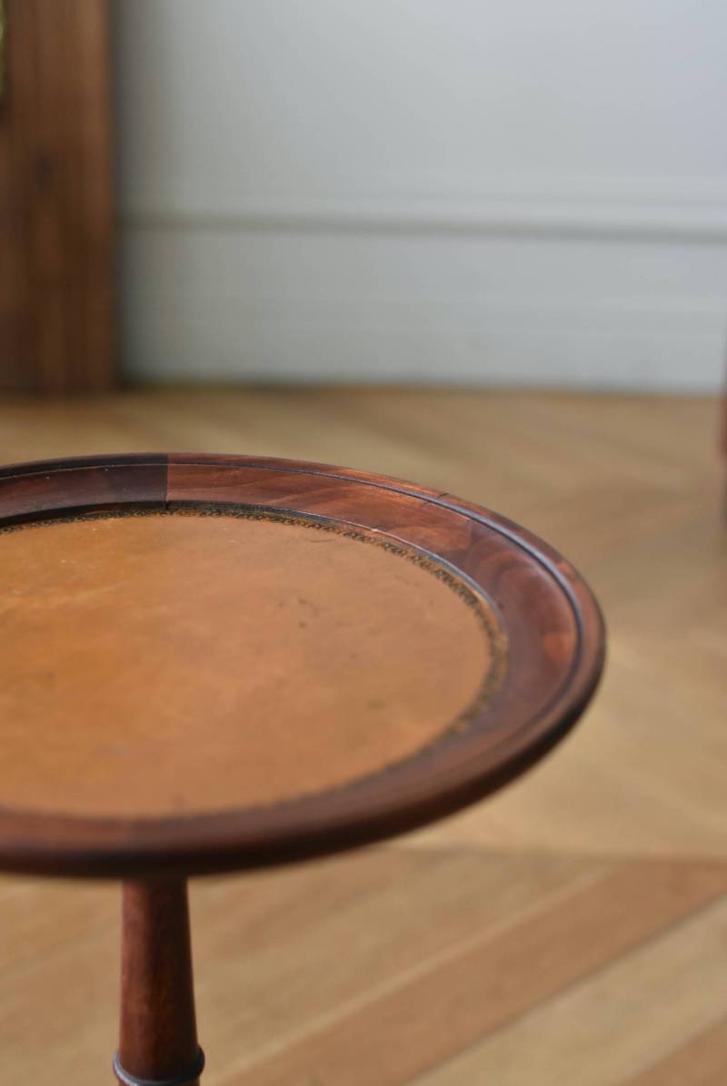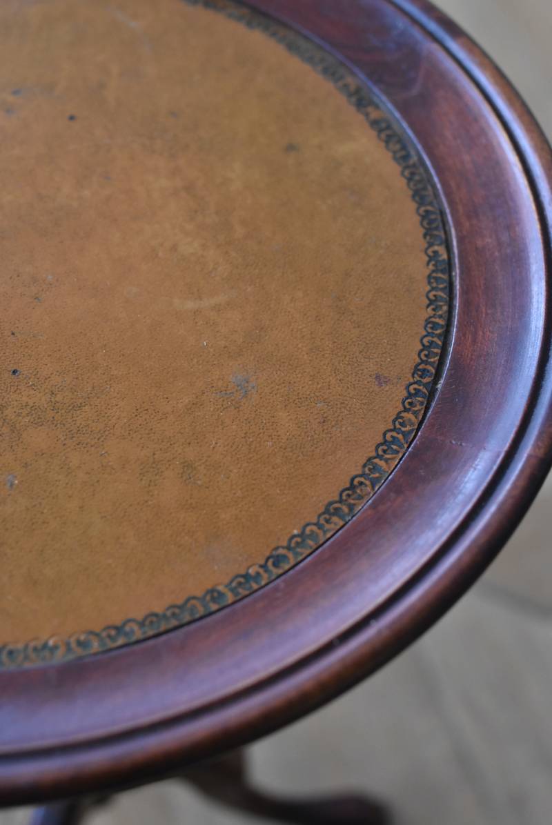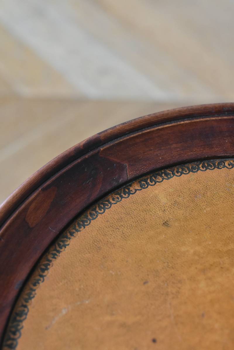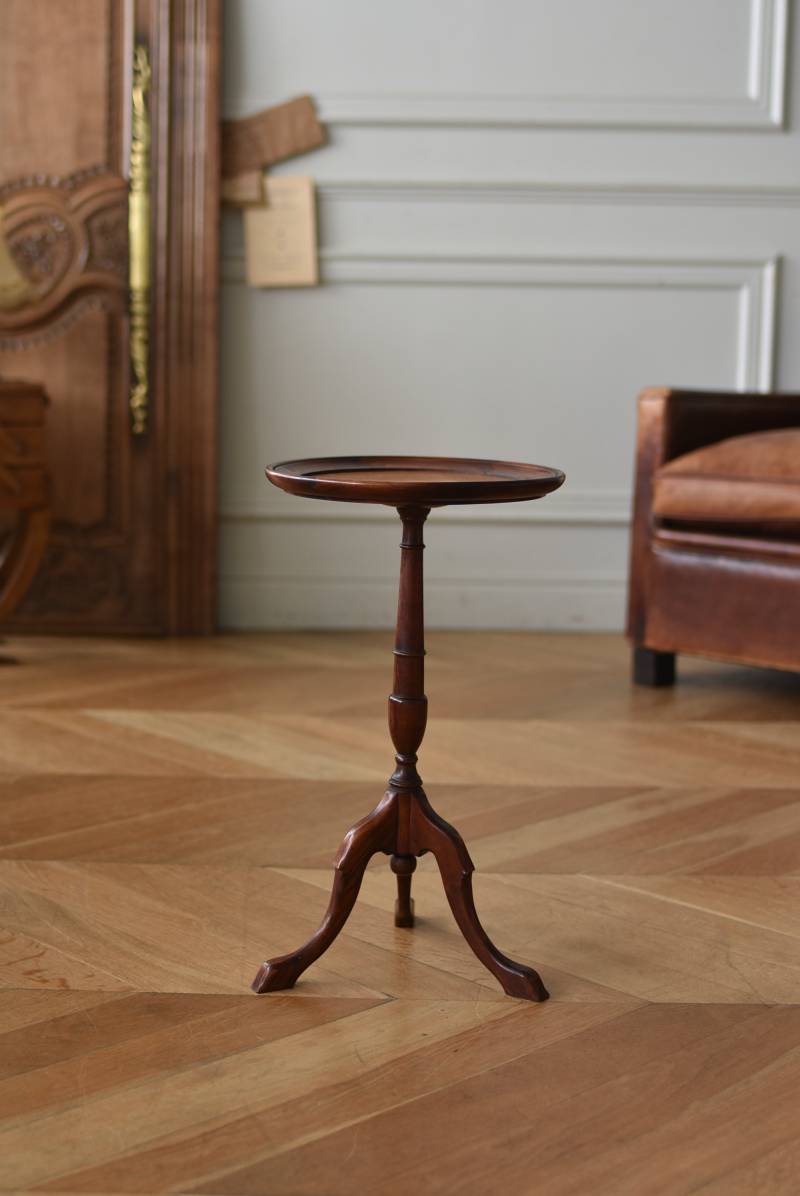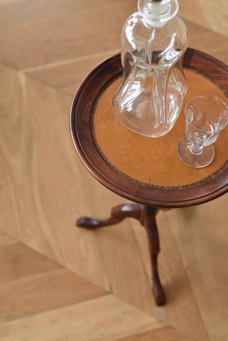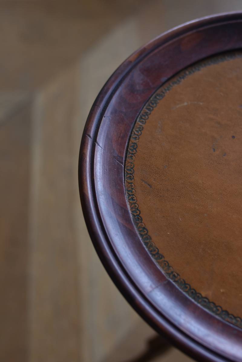 フランスのラウンドサイドテーブル。 上品な艶感のあるレッドブラウンカラーのボディがシックな装いで、伝統的なスタイルを受け継ぐエレガントなフォルムが魅力的。1本の支柱から優雅に広がる3本脚(トライポッド)のデザインは、空間に軽やかさとクラシカルな品格を添えてくれます。天板には薄いレザーが貼られ、縁に型押し模様が施された気品あるデザインに。 コンパクトなサイズ感なのでソファサイドやベッドサイドなど、ちょっとしたスペースにも取り入れることができる使い勝手の良いアイテムです。 天板直径 約30cm 脚元 約30cm×31cm H 約52.5cm