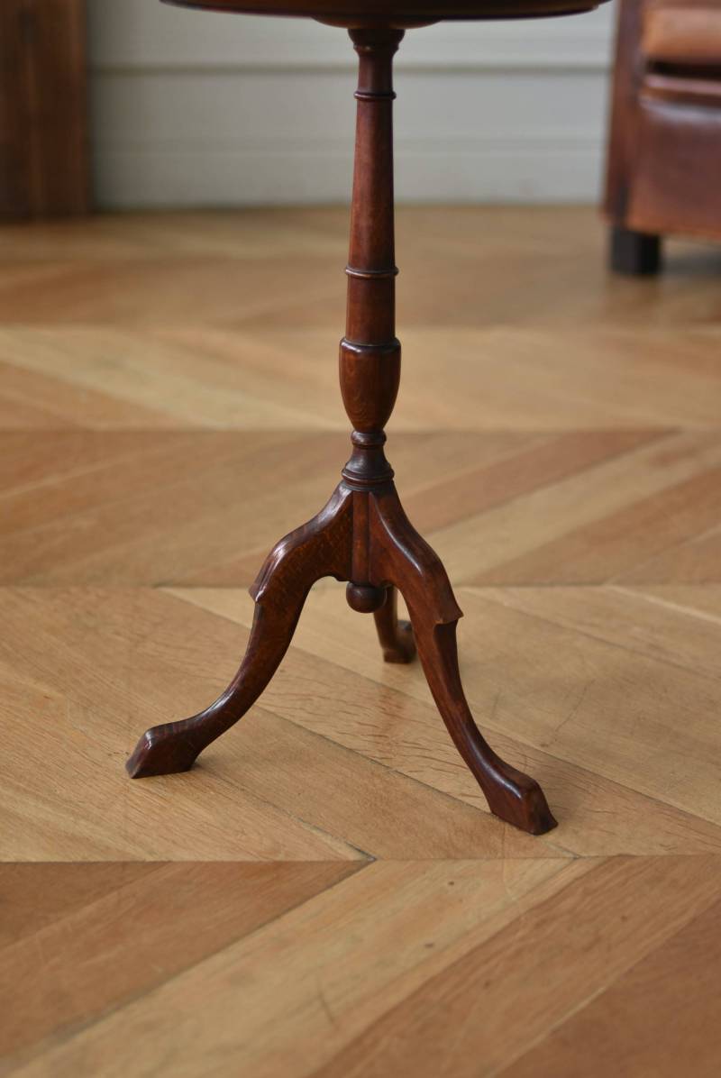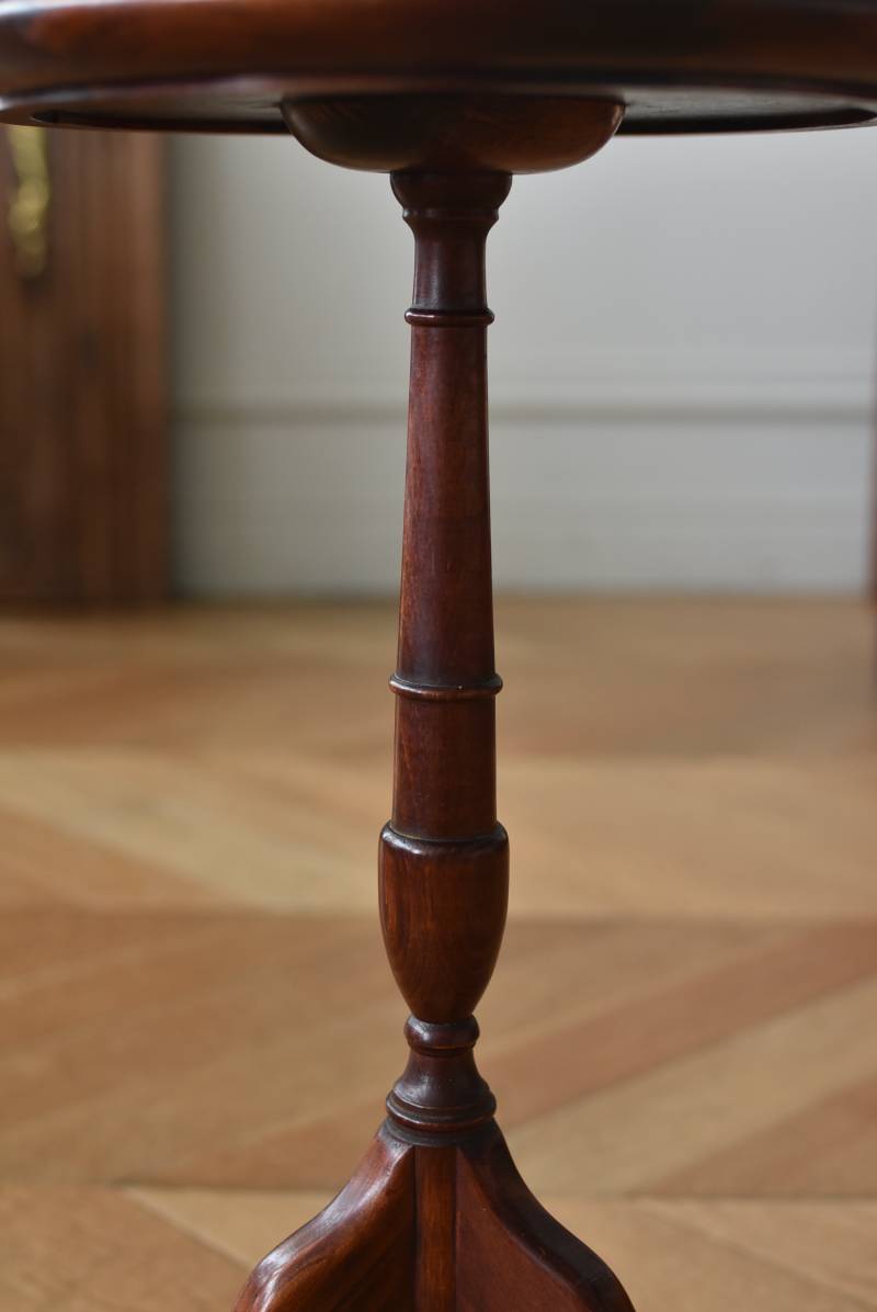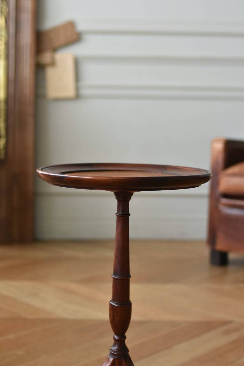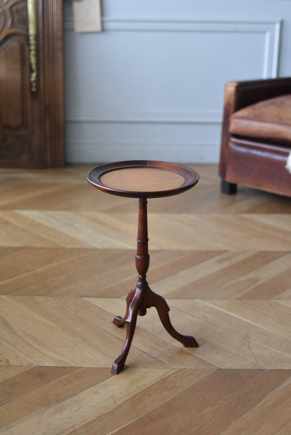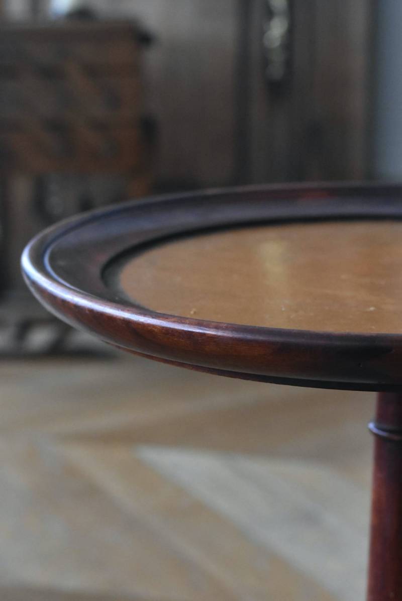 フランスのラウンドサイドテーブル。 上品な艶感のあるレッドブラウンカラーのボディがシックな装いで、伝統的なスタイルを受け継ぐエレガントなフォルムが魅力的。1本の支柱から優雅に広がる3本脚(トライポッド)のデザインは、空間に軽やかさとクラシカルな品格を添えてくれます。天板には薄いレザーが貼られ、縁に型押し模様が施された気品あるデザインに。 コンパクトなサイズ感なのでソファサイドやベッドサイドなど、ちょっとしたスペースにも取り入れることができる使い勝手の良いアイテムです。 天板直径 約30cm 脚元 約30cm×31cm H 約52.5cm