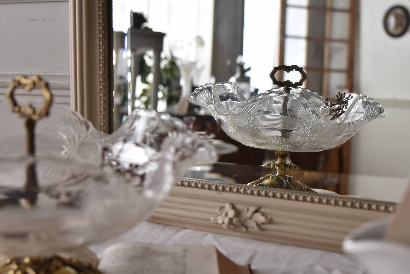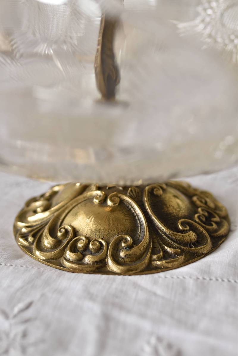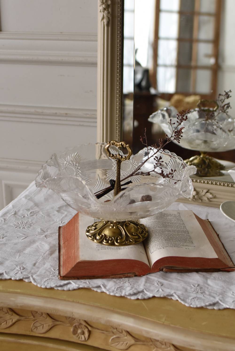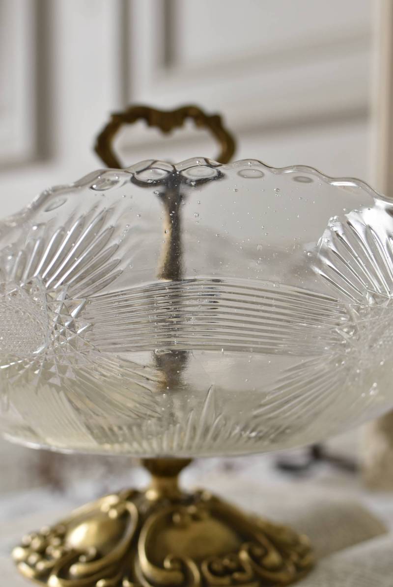 フランスのガラスコンポート。 ふんわりとした緩やかな曲線が描かれたガラス器に、幾何学的模様によってカットデザインが豪華に魅せてくれます。程よいガラスの厚みと細やかな気泡のある表情によって優しげな印象を受け、真鍮製の土台や持ち手には植物モチーフとなった連続模様など優美さを纏ったデザインです。 内側底面に気泡部分の窪みや傷などが見受けられますが、目立つカケはありません。中央の持ち手から大きく広がったシルエットが卓上の雰囲気をグッと高めてくれ、異素材が組み合わさった独特な存在感を放ってくれます。 直径 約29cm H 約17.5cm 土台直径 約11cm 深さ 約7cm