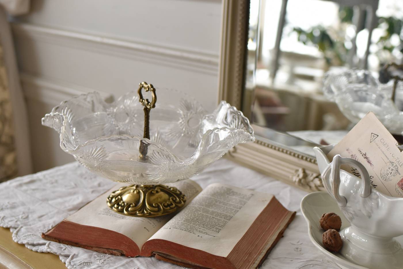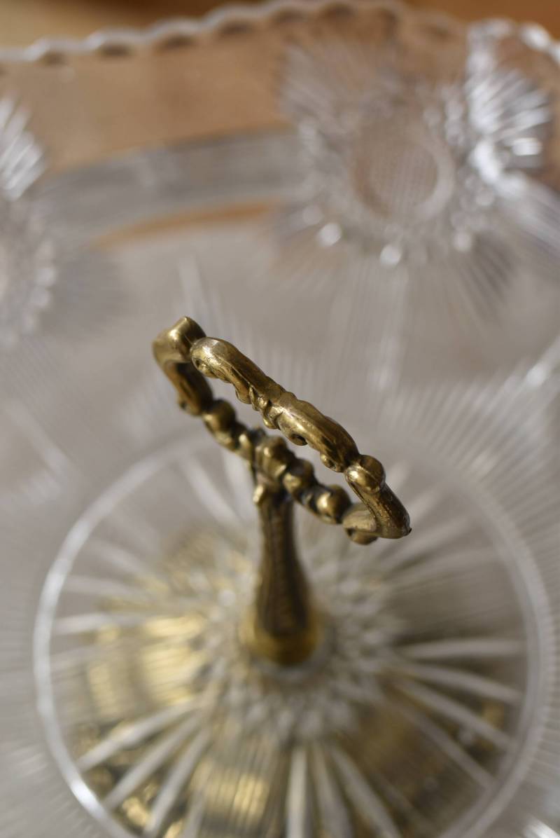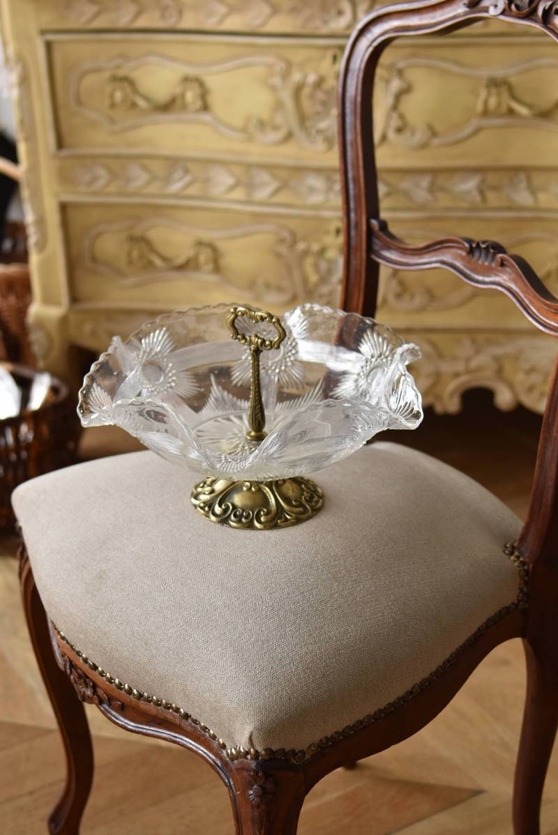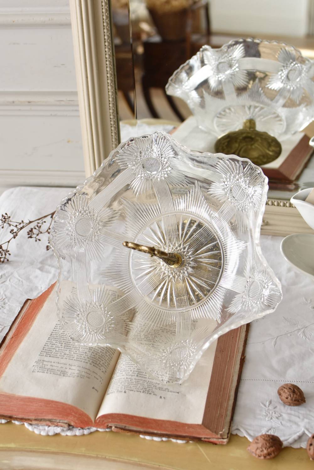 フランスのガラスコンポート。 ふんわりとした緩やかな曲線が描かれたガラス器に、幾何学的模様によってカットデザインが豪華に魅せてくれます。程よいガラスの厚みと細やかな気泡のある表情によって優しげな印象を受け、真鍮製の土台や持ち手には植物モチーフとなった連続模様など優美さを纏ったデザインです。 内側底面に気泡部分の窪みや傷などが見受けられますが、目立つカケはありません。中央の持ち手から大きく広がったシルエットが卓上の雰囲気をグッと高めてくれ、異素材が組み合わさった独特な存在感を放ってくれます。 直径 約29cm H 約17.5cm 土台直径 約11cm 深さ 約7cm