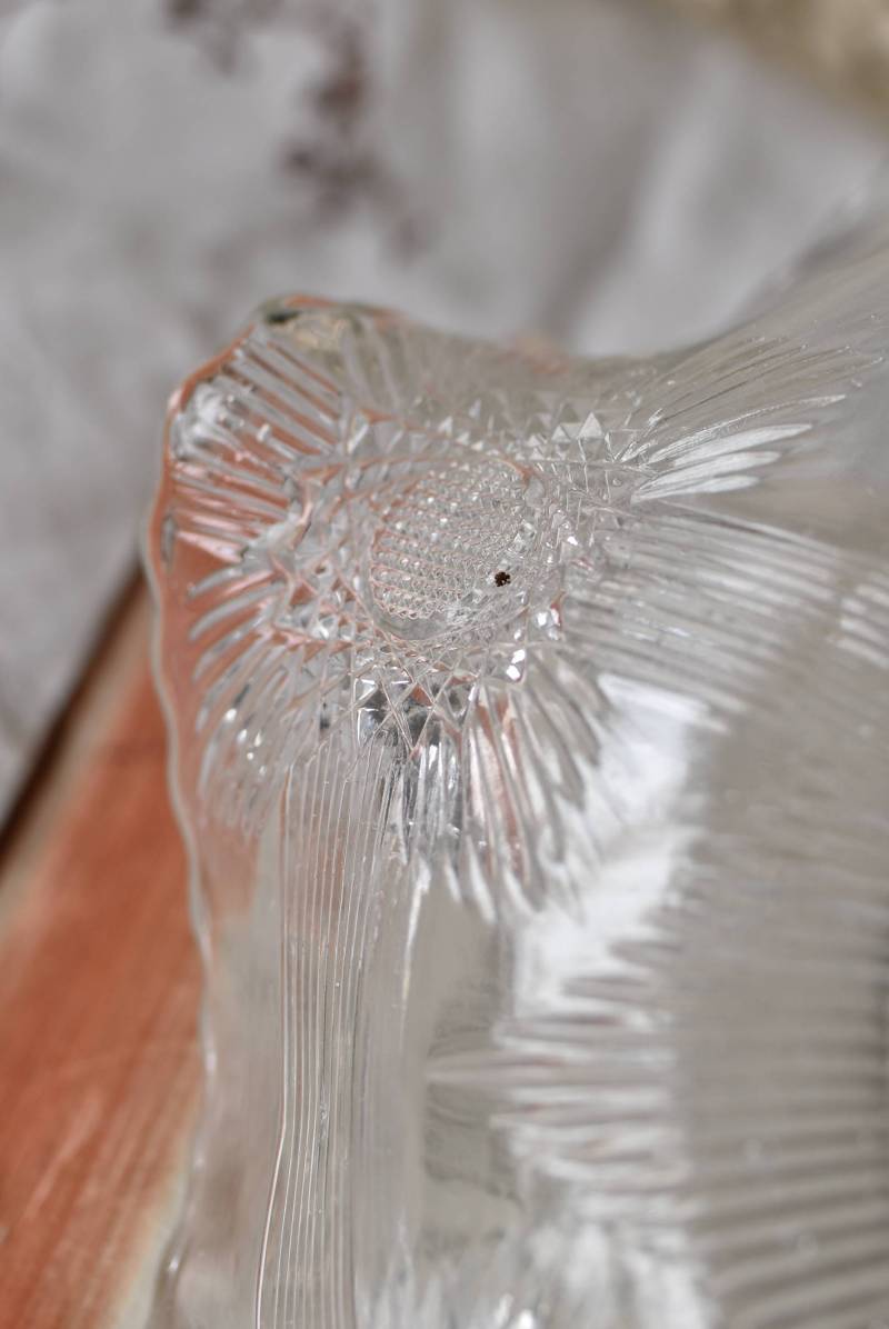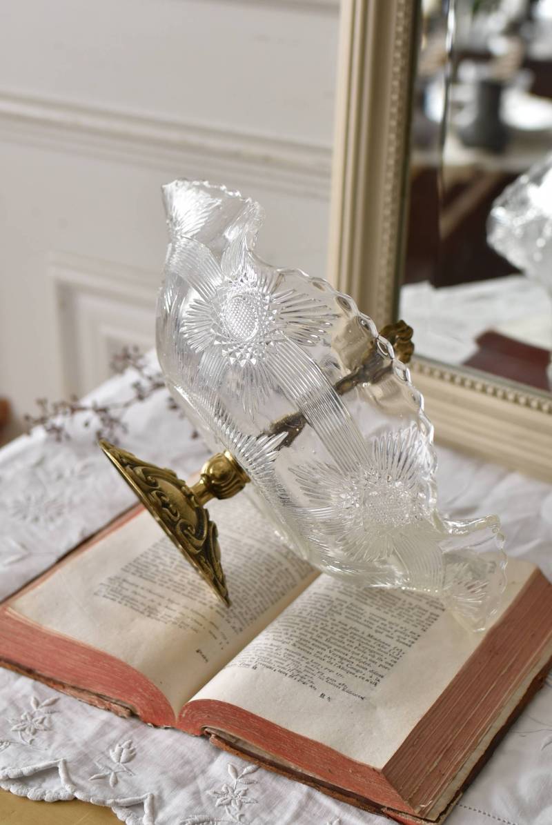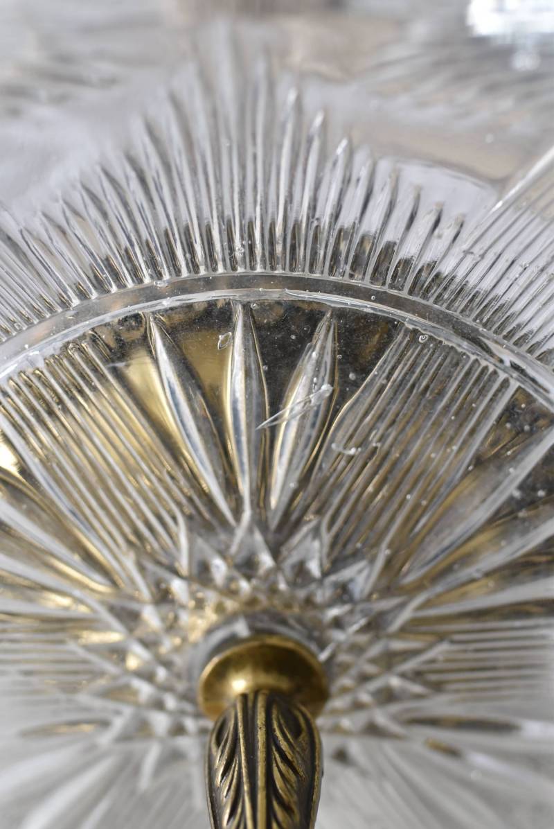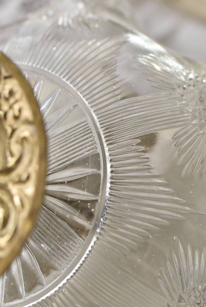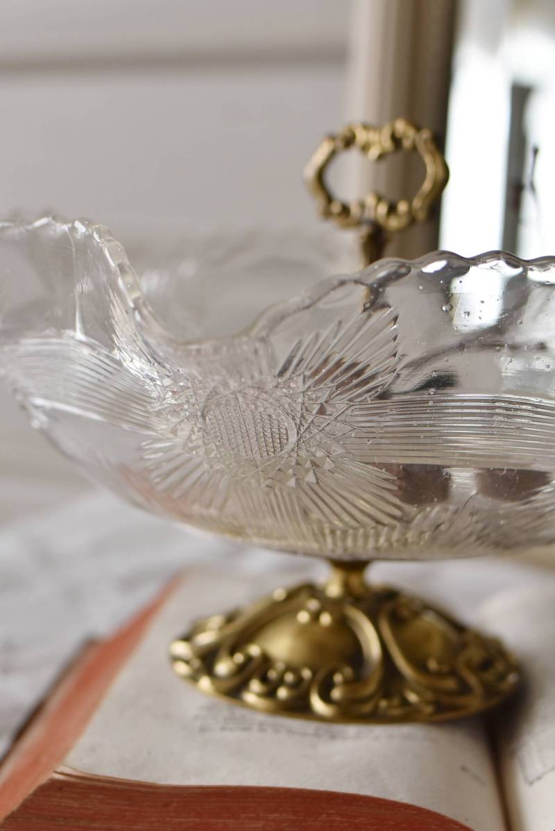 フランスのガラスコンポート。 ふんわりとした緩やかな曲線が描かれたガラス器に、幾何学的模様によってカットデザインが豪華に魅せてくれます。程よいガラスの厚みと細やかな気泡のある表情によって優しげな印象を受け、真鍮製の土台や持ち手には植物モチーフとなった連続模様など優美さを纏ったデザインです。 内側底面に気泡部分の窪みや傷などが見受けられますが、目立つカケはありません。中央の持ち手から大きく広がったシルエットが卓上の雰囲気をグッと高めてくれ、異素材が組み合わさった独特な存在感を放ってくれます。 直径 約29cm H 約17.5cm 土台直径 約11cm 深さ 約7cm