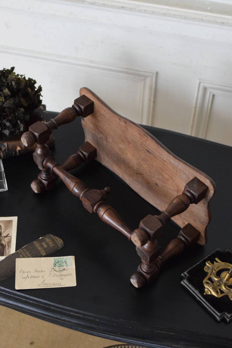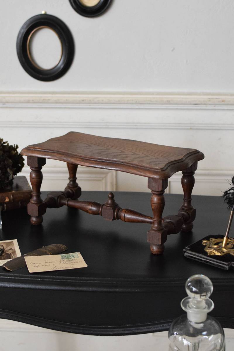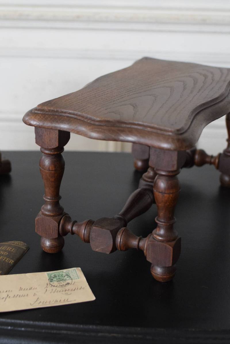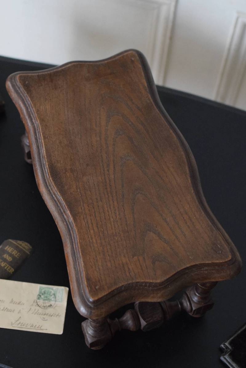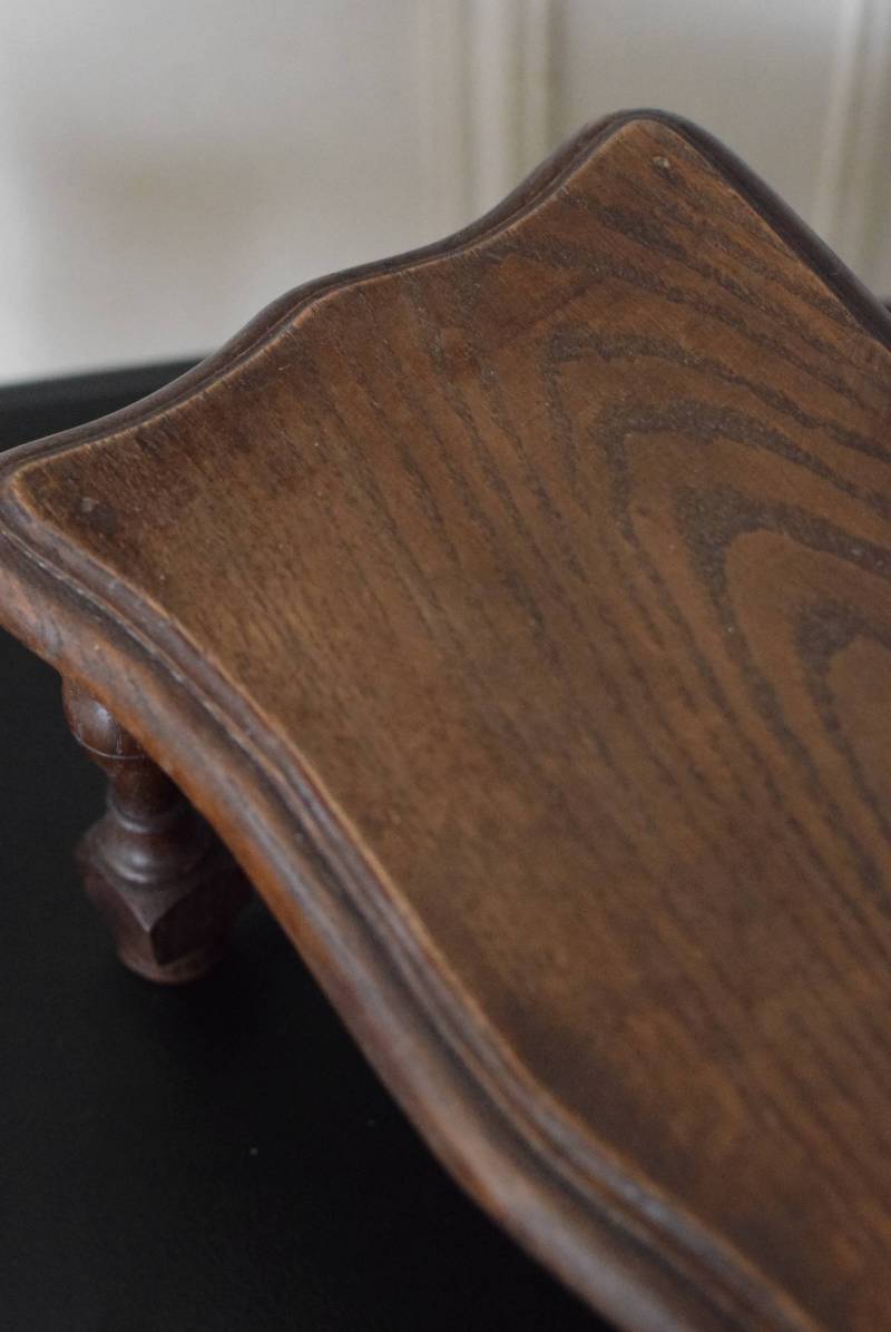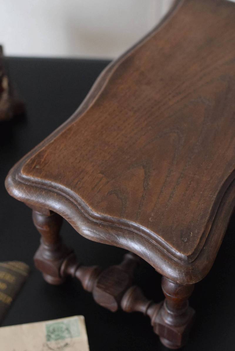 フランスのディスプレイスタンド。 クラシカルな脚元のデザインが印象的で、堂々とした風格のある姿。緩やかに縁取りされた天板に雑貨などを乗せ、ディスプレイを楽しんでいただけます。飾ったものを引き立てる懐の深さも備えつつ、かっちりとした厳格な雰囲気で、スタンドそのものも絵になる佇まいです。 同じデザインのものがもう一点ありますが(ディスプレイスタンド.33B)木の風合いや色合いなどが異なります。こちらはややダークカラーではっきりとした木目の表情が魅力的です。 W 約32.5cm D 約18cm H 約16.3cm 天板面積 約29.5× 約14.7cm