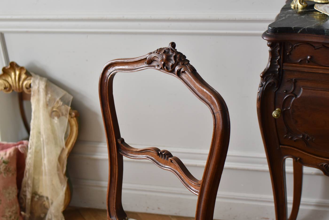 フランスのアンティークチェア。 背もたれトップのロカイユモチーフとなったレリーフが有機的な雰囲気を纏い、太すぎないたおやかなラインで構成された、優しげで親しみやすい雰囲気が漂います。ほんのり艶のあるチョコレートのような落ち着いた色合いによって凛と引き締まり、脚元の角や中央のお花デザインからも繊細さが窺えるデザインです。 フレームはパーツ毎に一度バラして組み直しを行っています。座面のファブリックは新しく張り直し、中もウレタンに交換しており、弾力のある柔らかな座り心地です。 W 約45cm D 約46cm H 約90cm 座面までH 約46cm