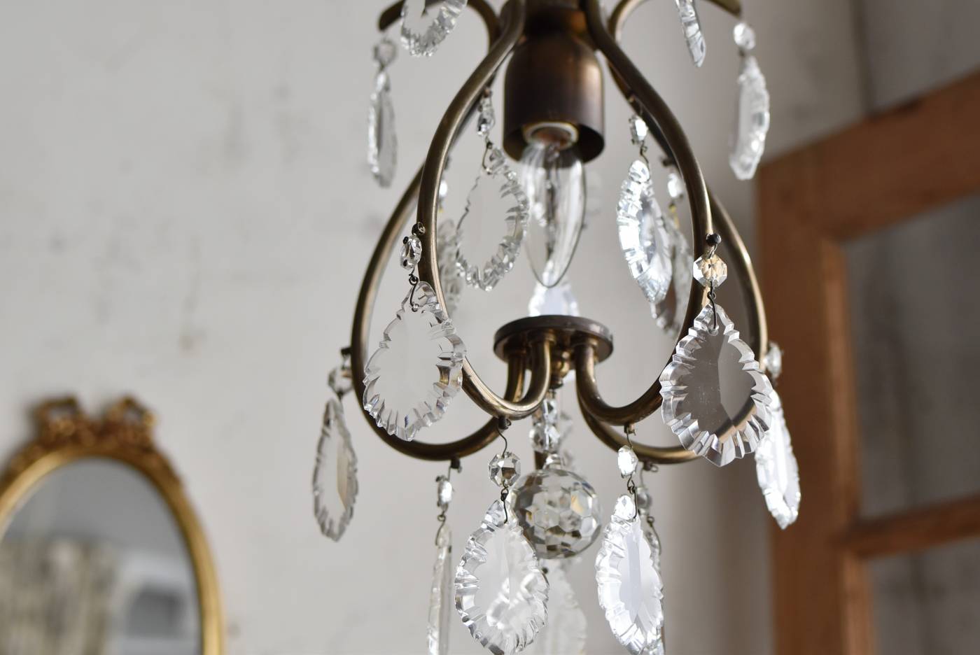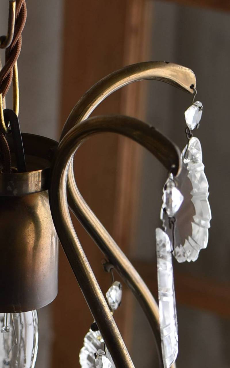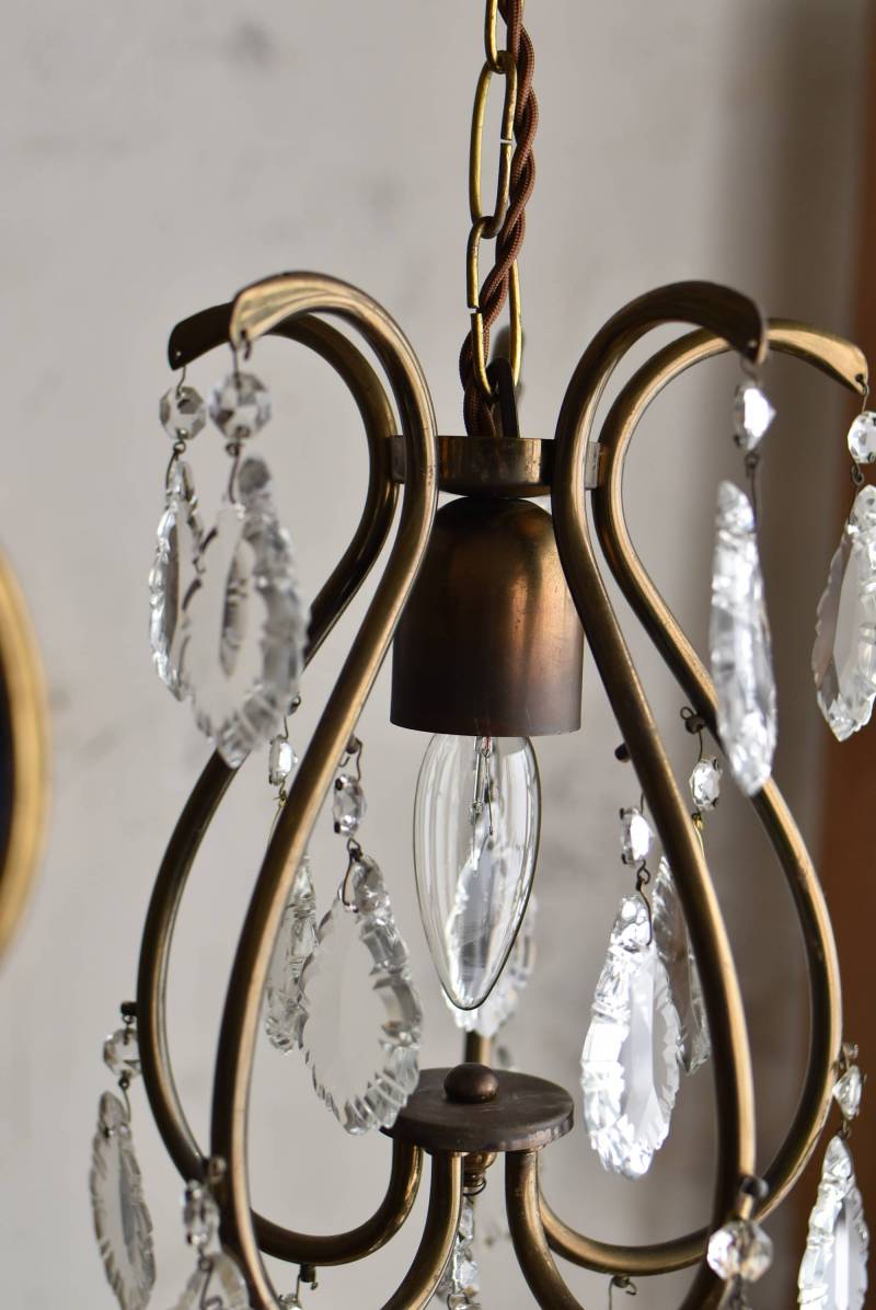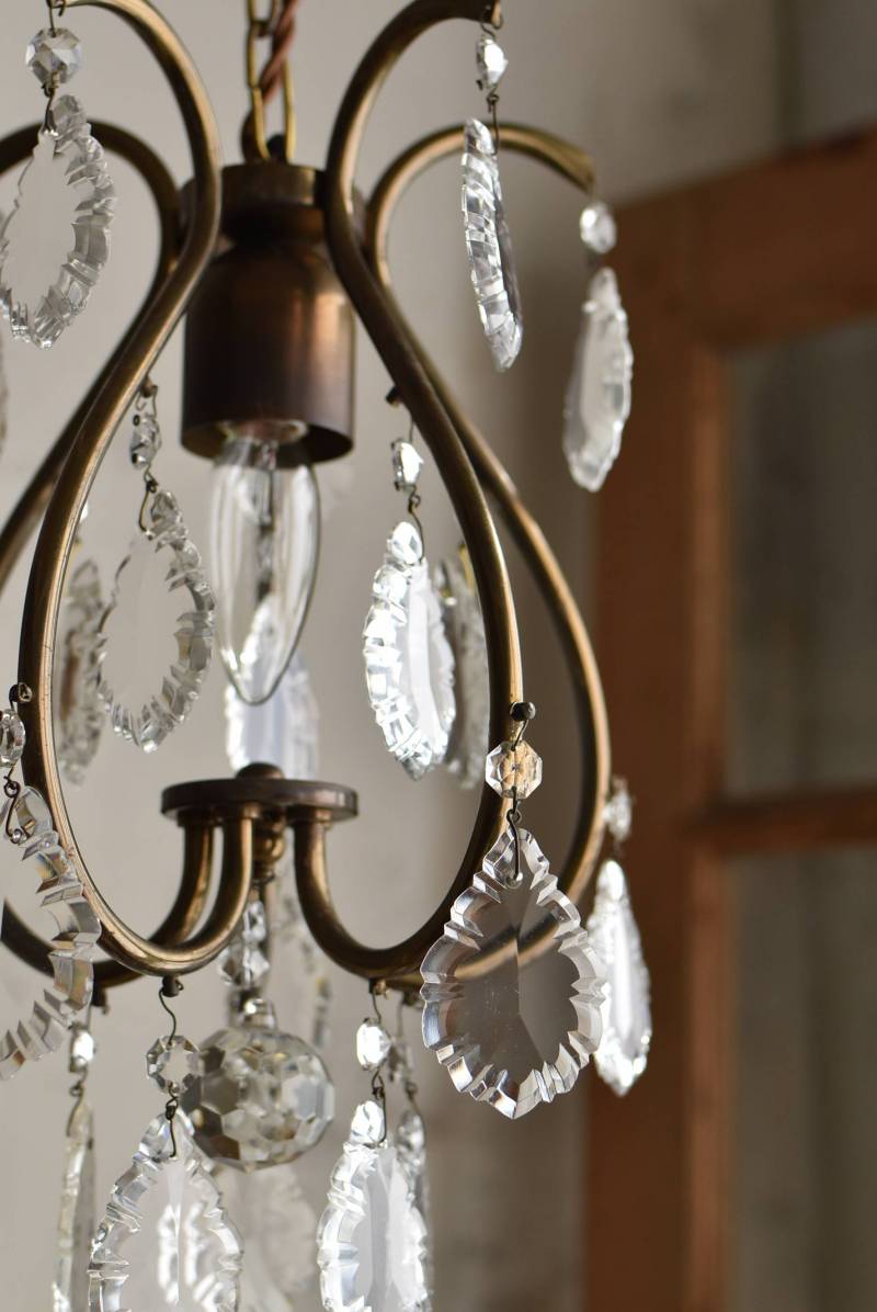フランスの1灯ペンダントランプ。 花の蕾のようにふっくらとしたシルエットとなり、5本の真鍮ラインによってそっと包み込まれた優美さを纏っています。葉っぱを連想させるガラスパーツが贅沢なほどにたくさん垂れ下がり、澄んだ煌めきのある表情も幻想的です。 古いものですのでガラスパーツにカケなどが見受けられます。コード・ソケットは新しいものに交換済みです。こちらの商品は条件を満たしているので引掛シーリングをご使用いただけます。元は直付けで使われていた物で天井カバーが浅い為、天井との間に隙間ができます。天井との隙間が気になられる方は直付け工事をおすすめします。 電球は付属しません。 それぞれでの販売となり色味が異なりますが、同じデザインの ペンダントランプ.Bがあります。 直径 約19cm H 約34.5cm コード含む全長 約71cm 重量 約1.4kg 電球口径 E17 *60W以下をご使用下さい。
