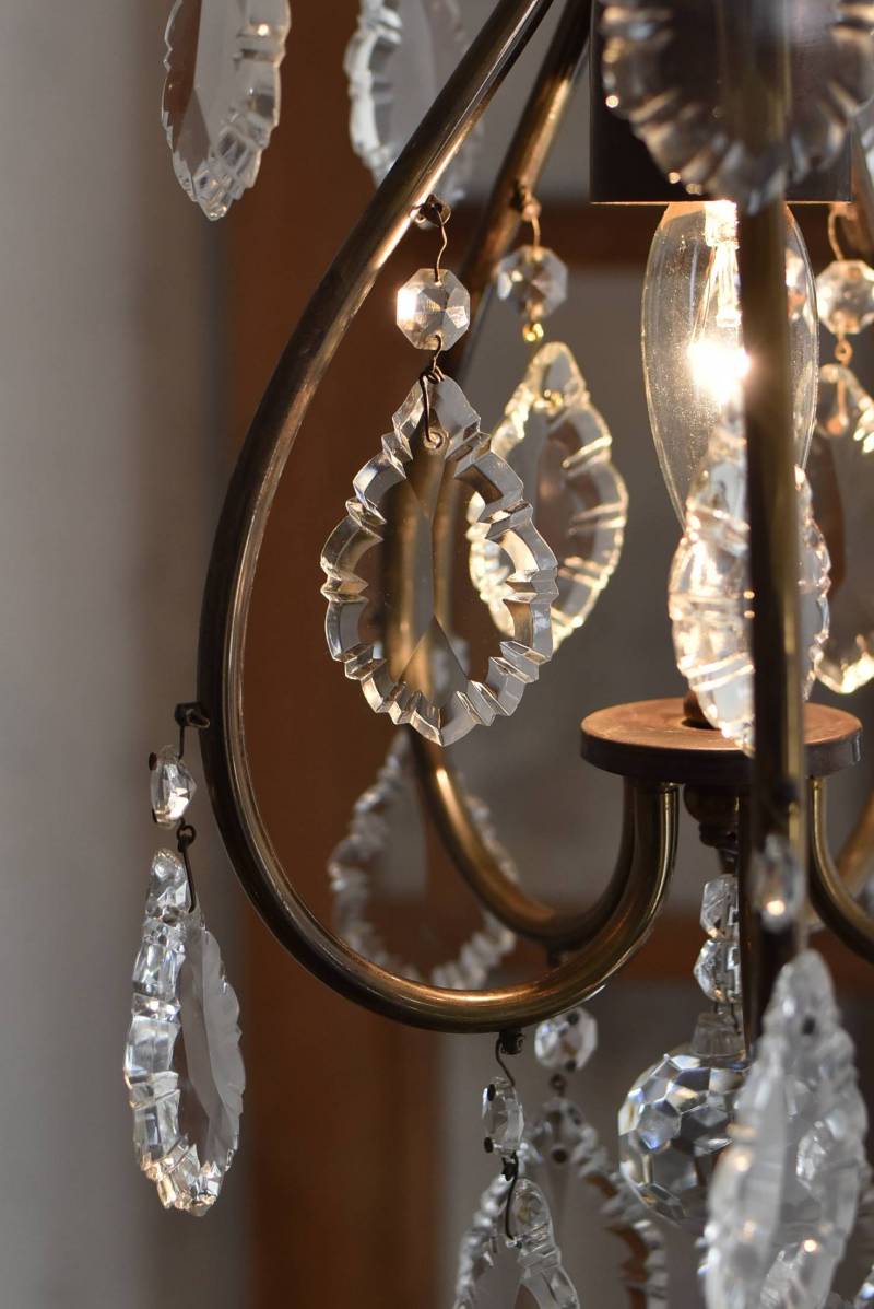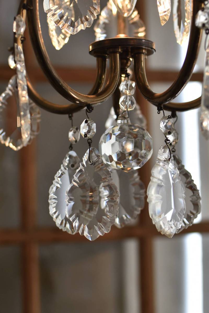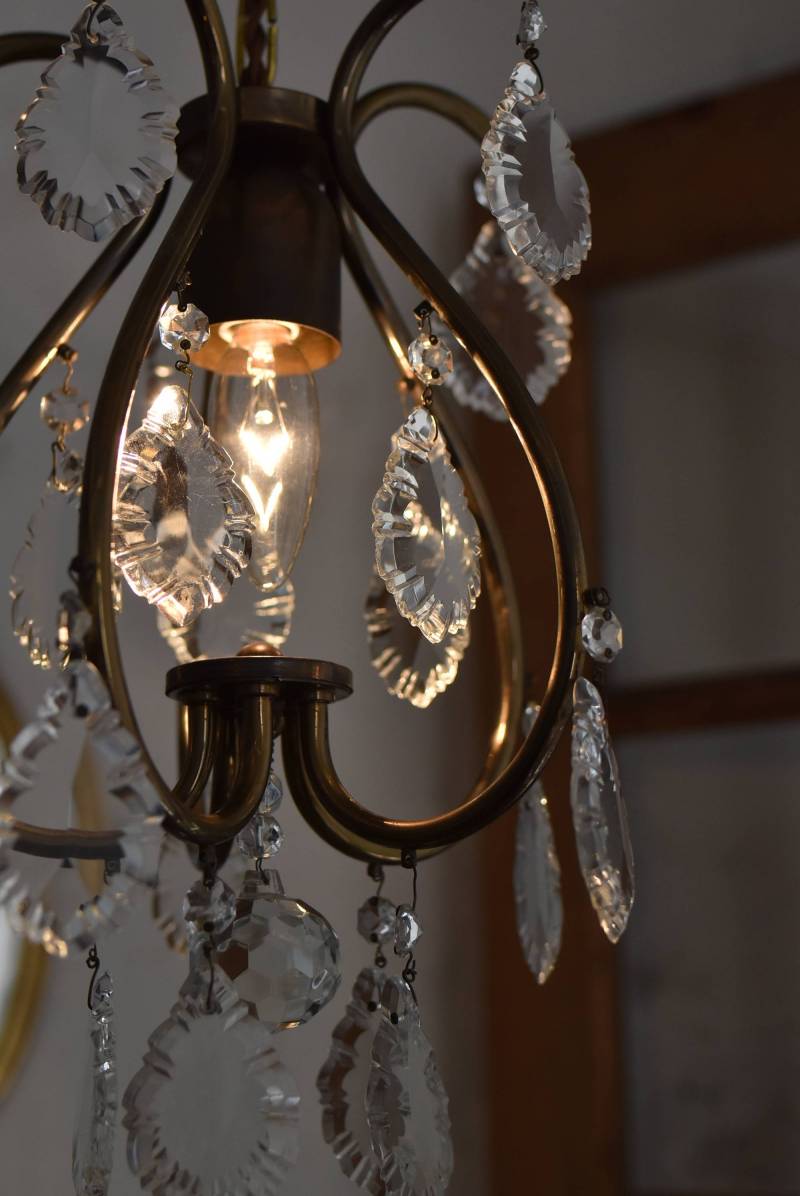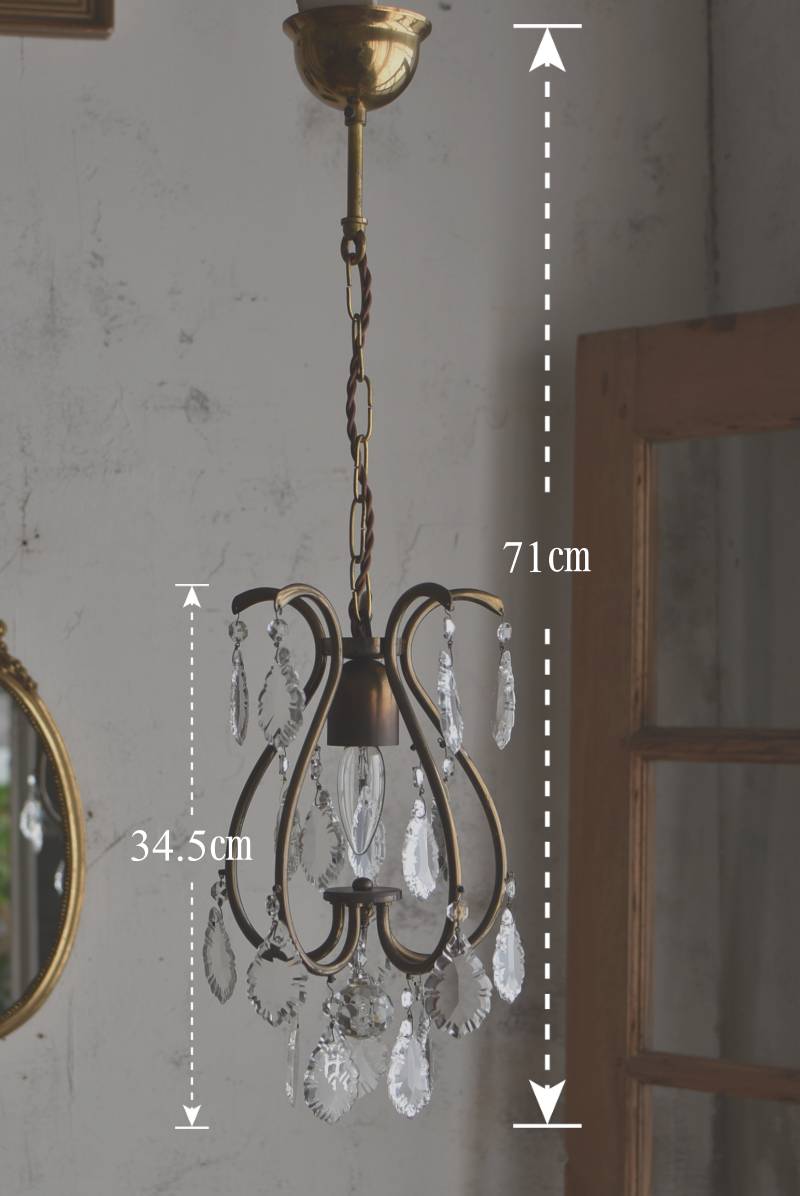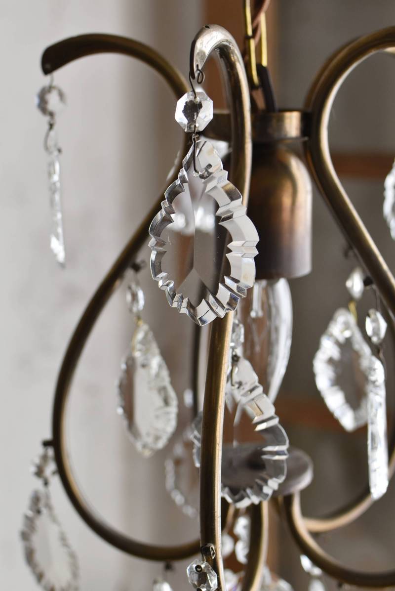 フランスの1灯ペンダントランプ。 花の蕾のようにふっくらとしたシルエットとなり、5本の真鍮ラインによってそっと包み込まれた優美さを纏っています。葉っぱを連想させるガラスパーツが贅沢なほどにたくさん垂れ下がり、澄んだ煌めきのある表情も幻想的です。 古いものですのでガラスパーツにカケなどが見受けられます。コード・ソケットは新しいものに交換済みです。こちらの商品は条件を満たしているので引掛シーリングをご使用いただけます。元は直付けで使われていた物で天井カバーが浅い為、天井との間に隙間ができます。天井との隙間が気になられる方は直付け工事をおすすめします。 電球は付属しません。 それぞれでの販売となり色味が異なりますが、同じデザインの ペンダントランプ.Bがあります。 直径 約19cm H 約34.5cm コード含む全長 約71cm 重量 約1.4kg 電球口径 E17 *60W以下をご使用下さい。