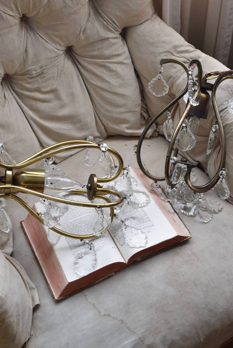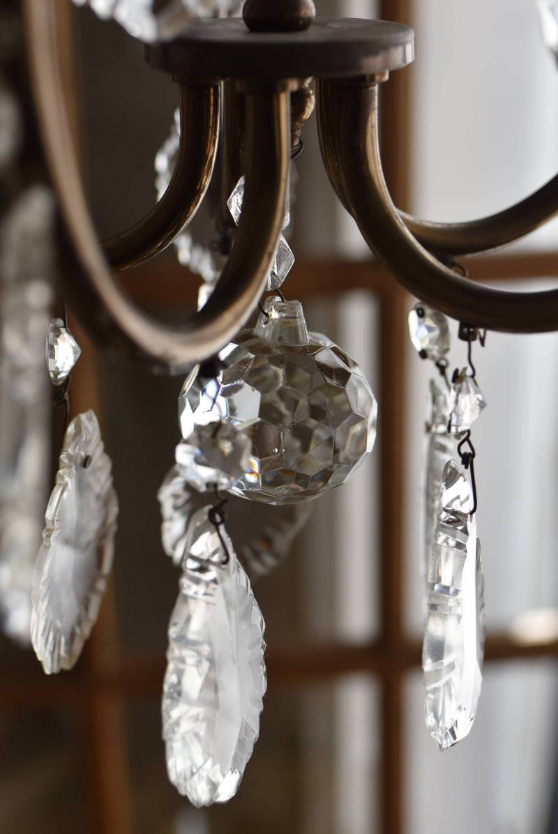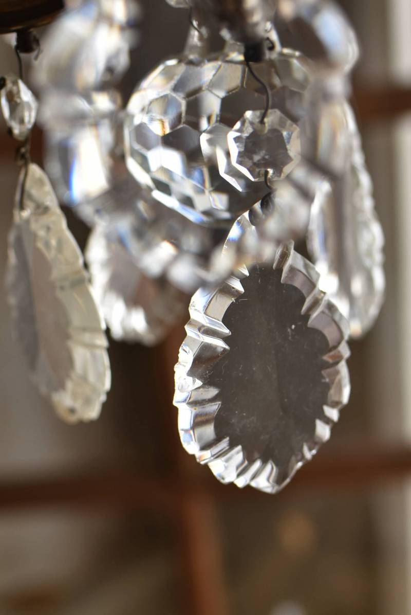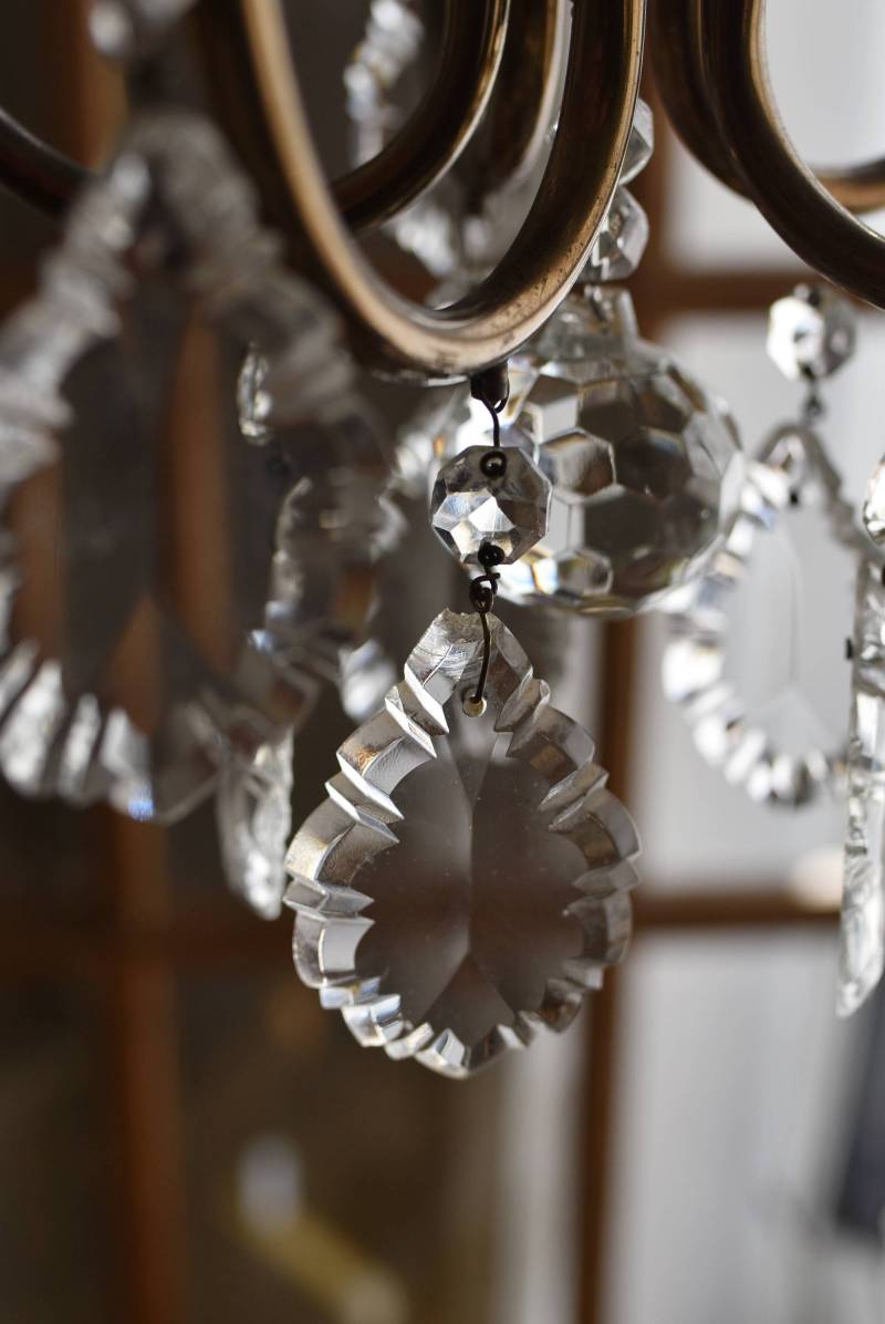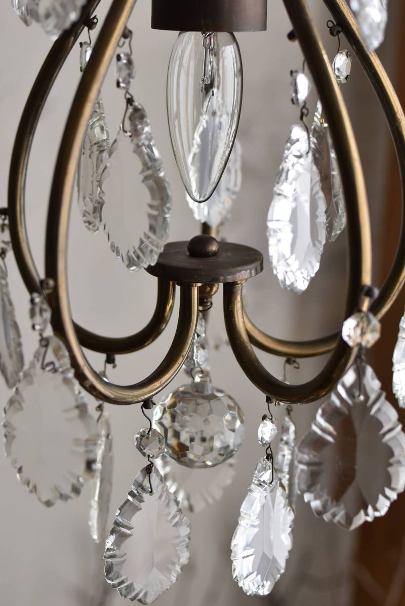 フランスの1灯ペンダントランプ。 花の蕾のようにふっくらとしたシルエットとなり、5本の真鍮ラインによってそっと包み込まれた優美さを纏っています。葉っぱを連想させるガラスパーツが贅沢なほどにたくさん垂れ下がり、澄んだ煌めきのある表情も幻想的です。 古いものですのでガラスパーツにカケなどが見受けられます。コード・ソケットは新しいものに交換済みです。こちらの商品は条件を満たしているので引掛シーリングをご使用いただけます。元は直付けで使われていた物で天井カバーが浅い為、天井との間に隙間ができます。天井との隙間が気になられる方は直付け工事をおすすめします。 電球は付属しません。 それぞれでの販売となり色味が異なりますが、同じデザインの ペンダントランプ.Bがあります。 直径 約19cm H 約34.5cm コード含む全長 約71cm 重量 約1.4kg 電球口径 E17 *60W以下をご使用下さい。