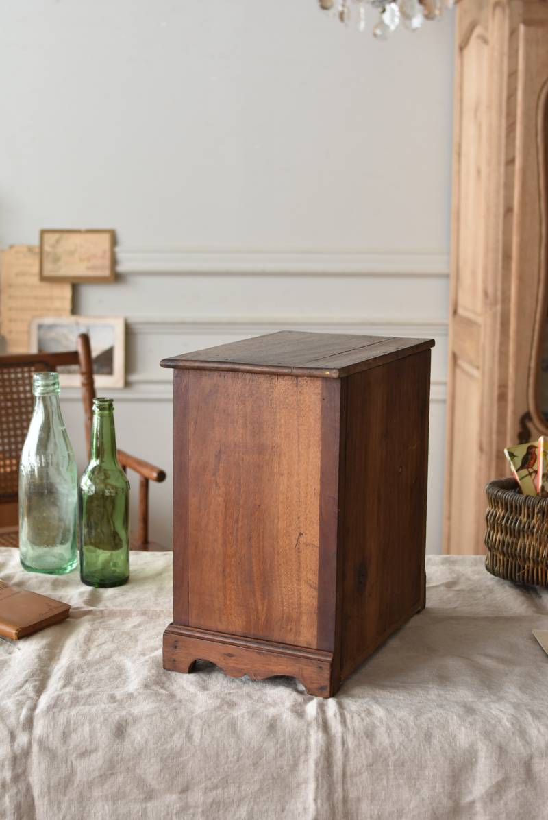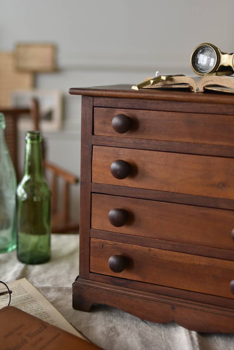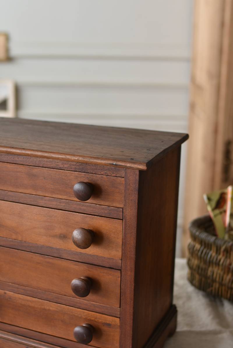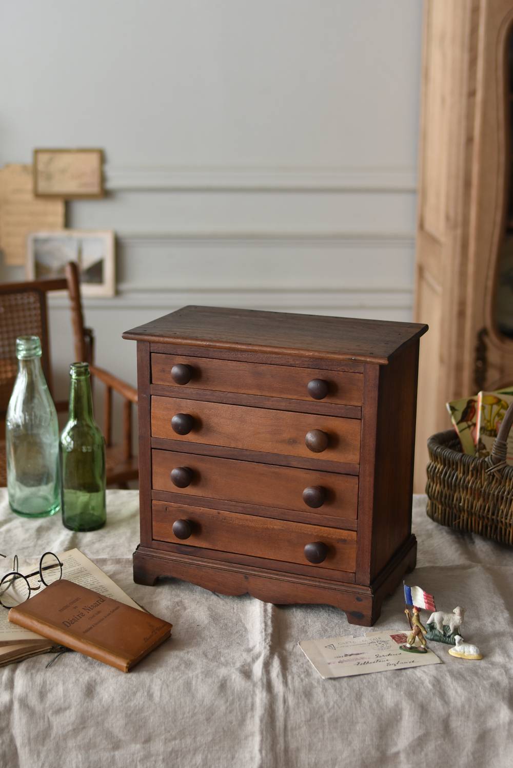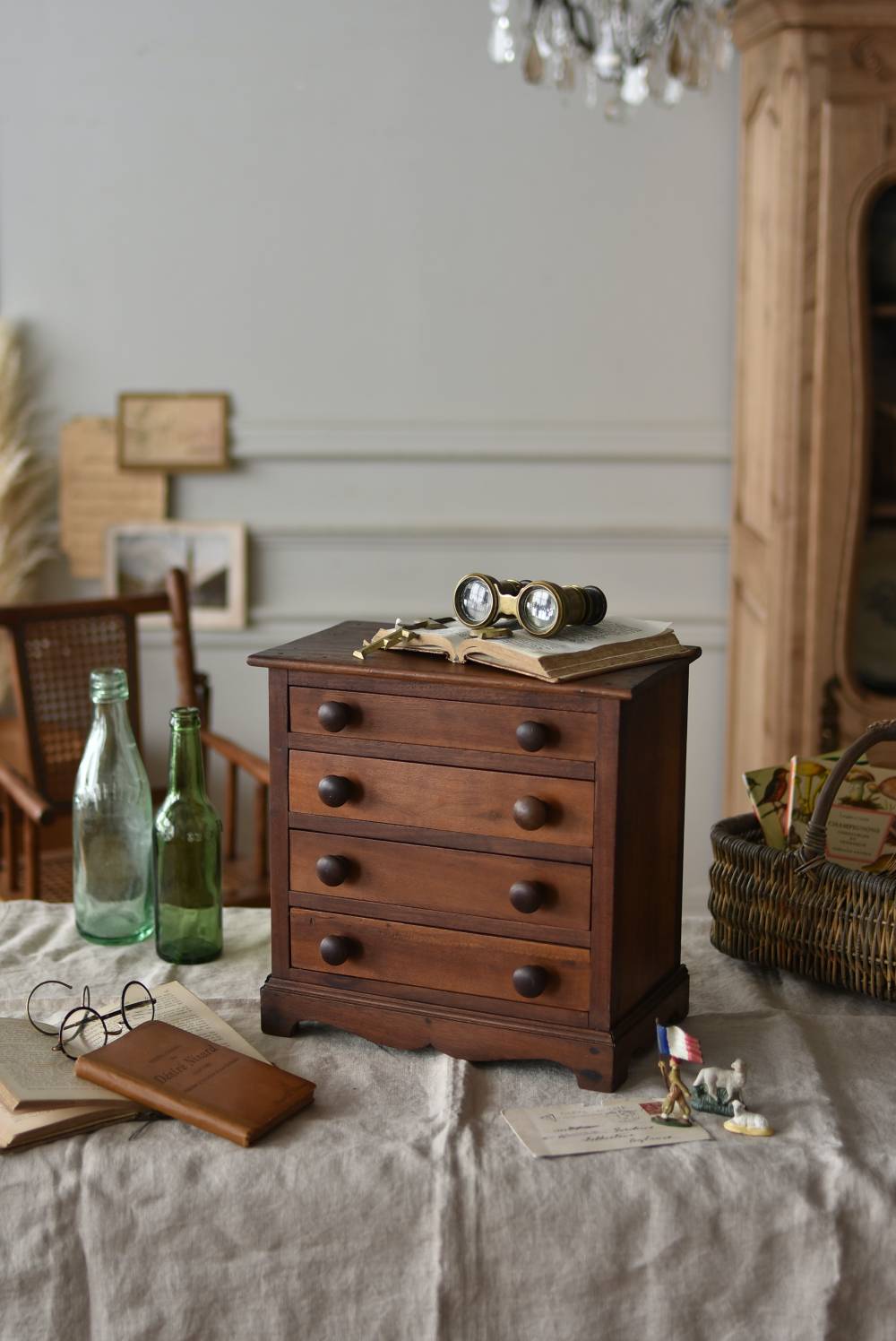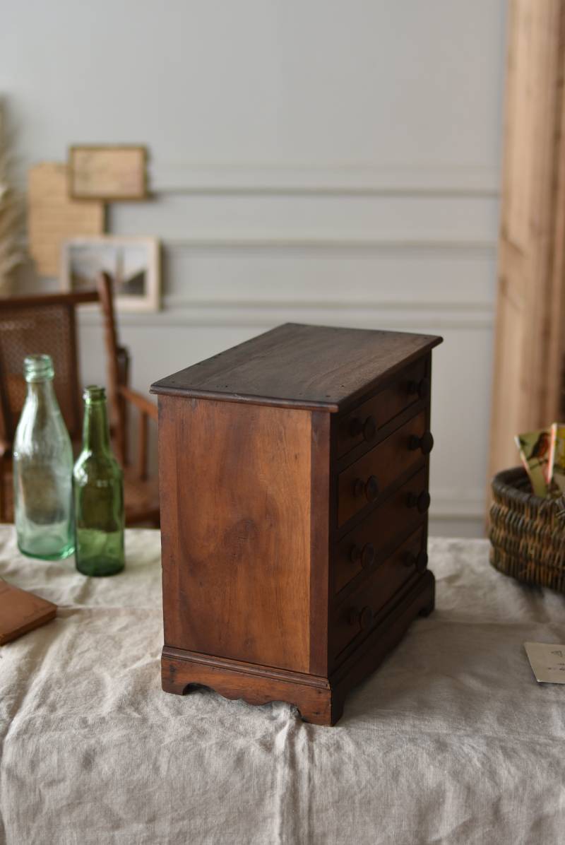 フランスの4段ミニチェスト。 こっくりとした深みのあるチョコレートブラウンカラーのボディが落ち着いた印象を漂わせてくれる佇まい。ころんとした丸い木製のツマミは手に馴染み、デザインのアクセントとして可愛らしいイメージをもたらしてくれます。小ぶりなサイズ感ですが引き出しは4つ設けられており、細かなものをしっかりと仕分けて収納できる機能性にも優れた逸品に。 脚元の優雅な曲線ラインがさりげなく、卓上の雰囲気をグッと高めてくれるクラシカルな雰囲気のアイテムです。 W 約32.5cm D 約19.5cm H 約32cm 引き出し内寸(1段目) W約23.8cm×D約13.5cm×H約2.5cm 引き出し内寸(2.3.4段目) W約23.8cm×D約13.5cm×H約4cm