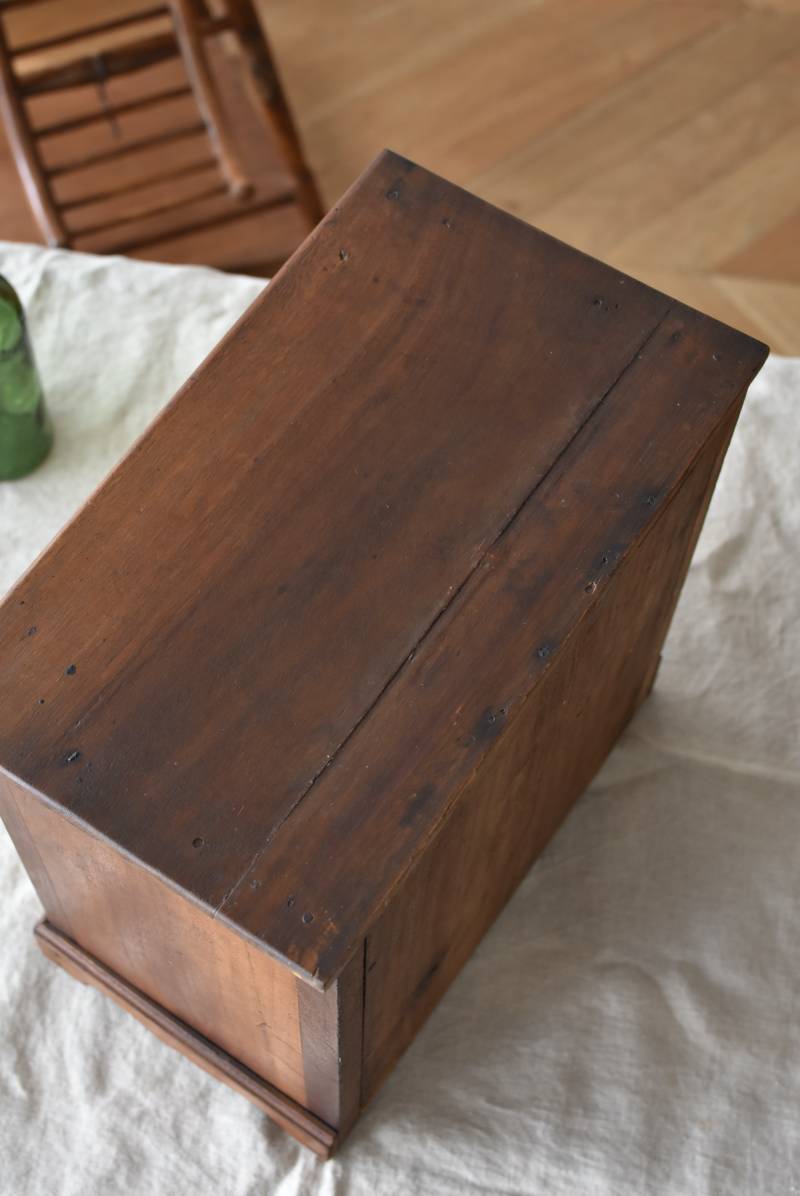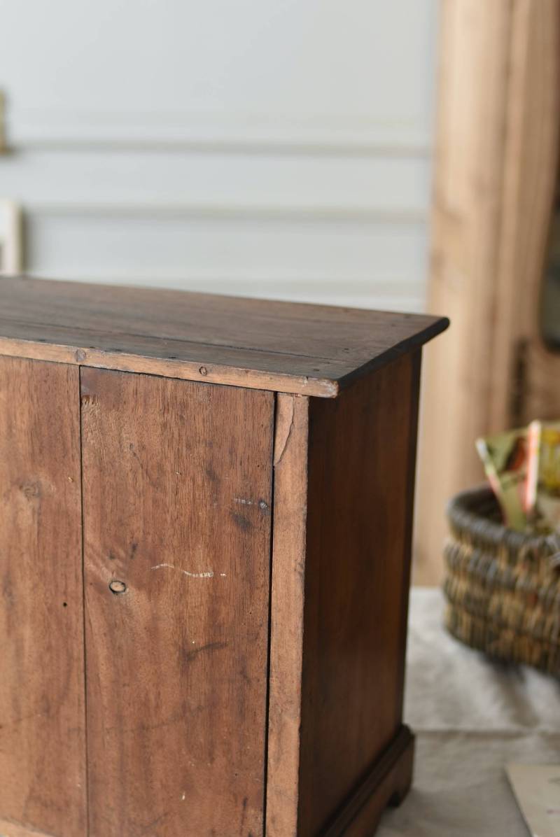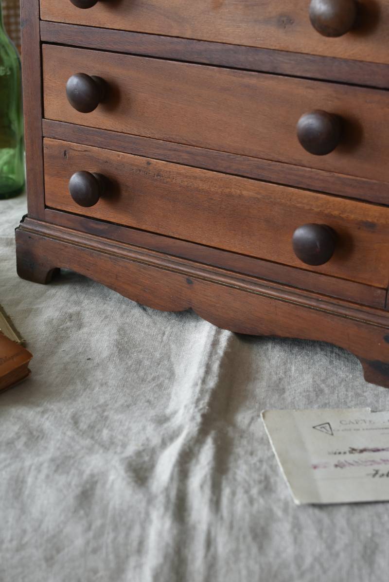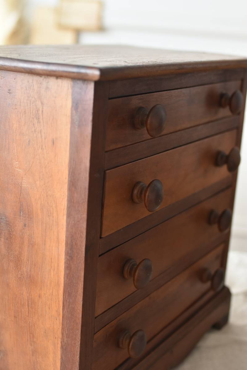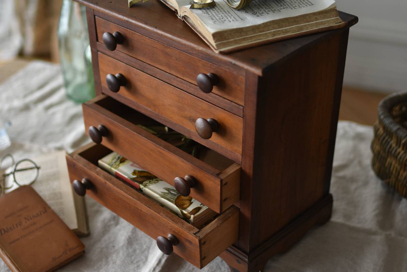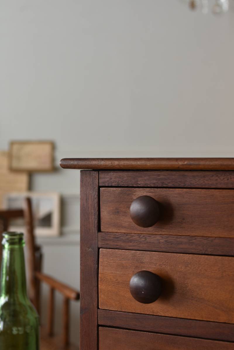 フランスの4段ミニチェスト。 こっくりとした深みのあるチョコレートブラウンカラーのボディが落ち着いた印象を漂わせてくれる佇まい。ころんとした丸い木製のツマミは手に馴染み、デザインのアクセントとして可愛らしいイメージをもたらしてくれます。小ぶりなサイズ感ですが引き出しは4つ設けられており、細かなものをしっかりと仕分けて収納できる機能性にも優れた逸品に。 脚元の優雅な曲線ラインがさりげなく、卓上の雰囲気をグッと高めてくれるクラシカルな雰囲気のアイテムです。 W 約32.5cm D 約19.5cm H 約32cm 引き出し内寸(1段目) W約23.8cm×D約13.5cm×H約2.5cm 引き出し内寸(2.3.4段目) W約23.8cm×D約13.5cm×H約4cm