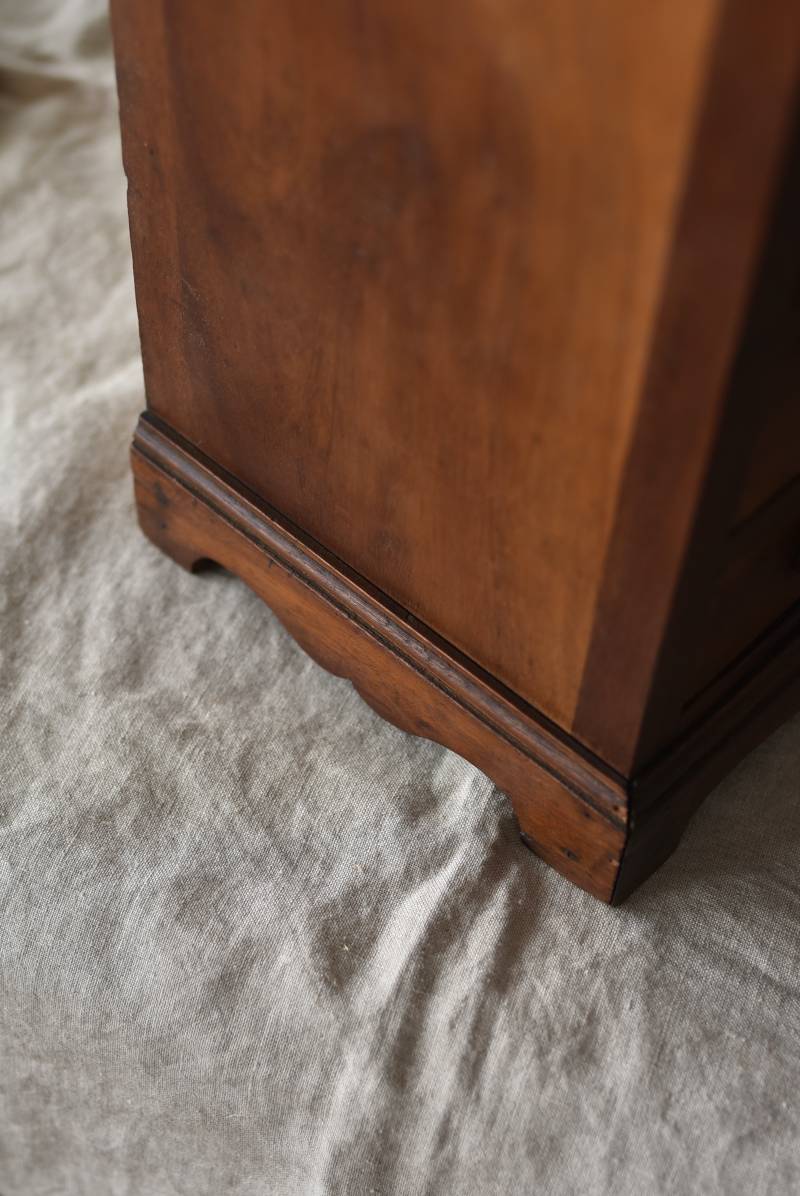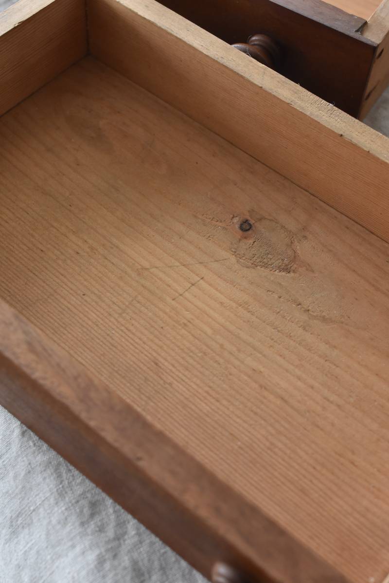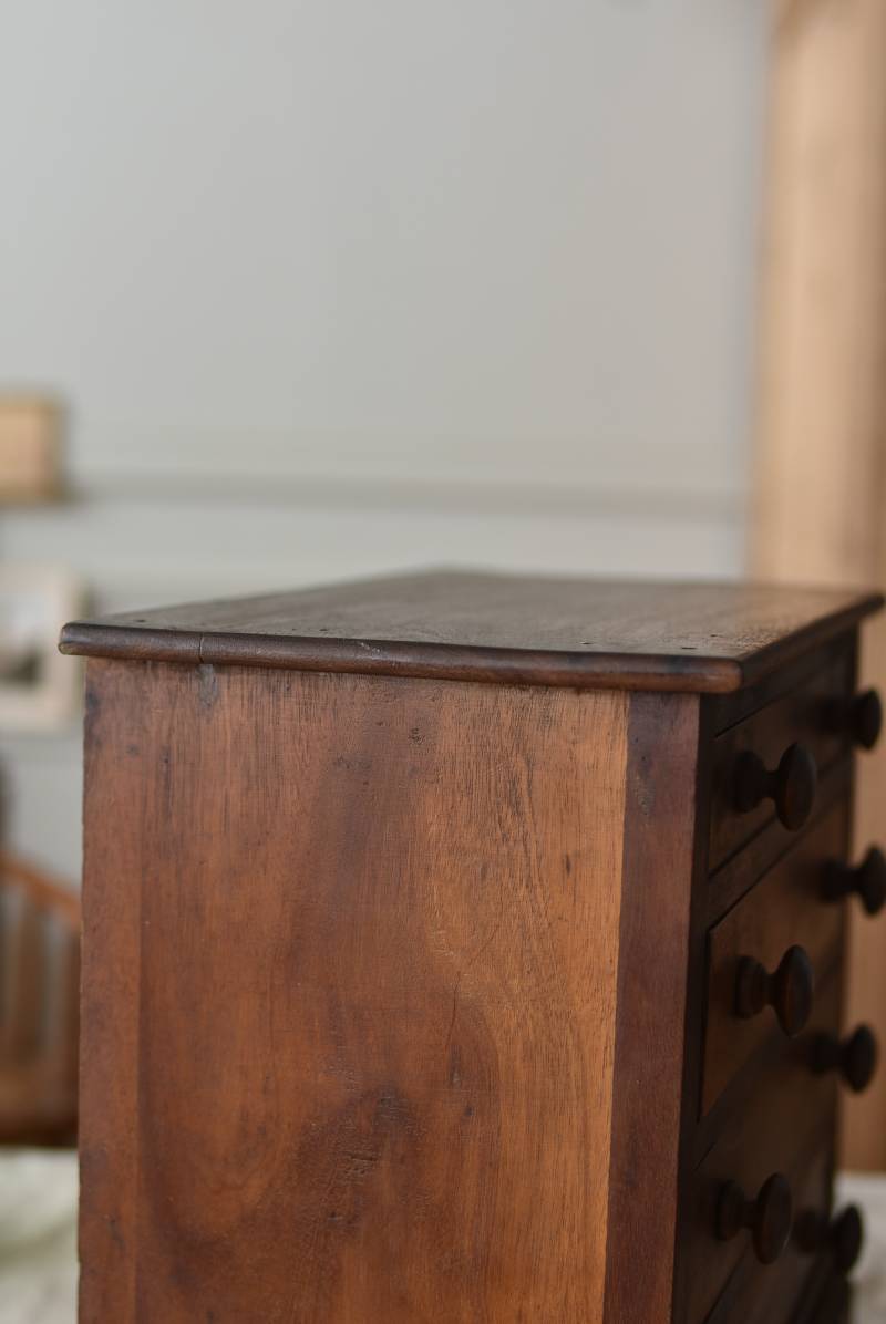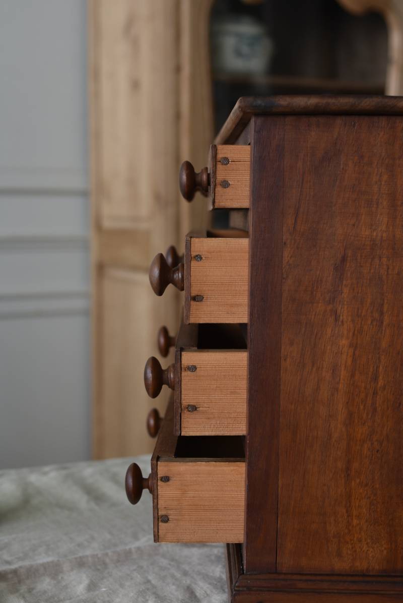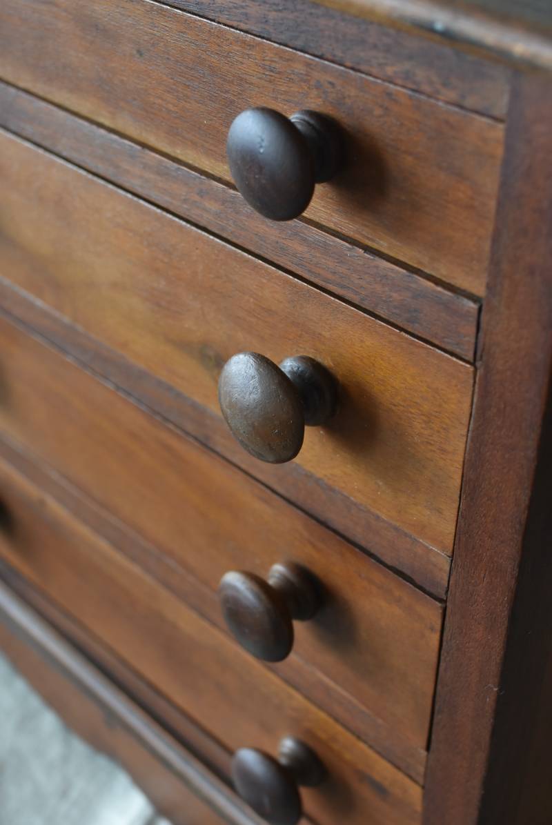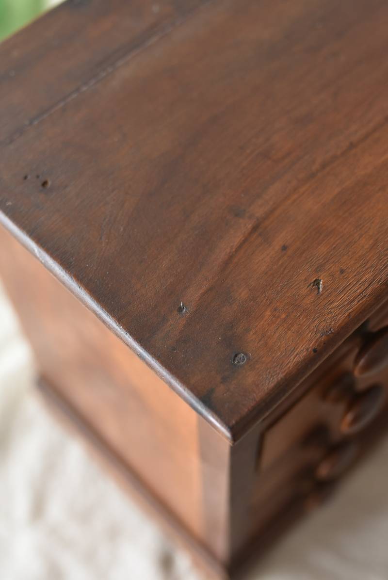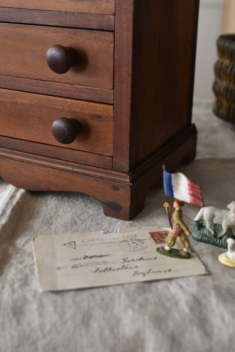 フランスの4段ミニチェスト。 こっくりとした深みのあるチョコレートブラウンカラーのボディが落ち着いた印象を漂わせてくれる佇まい。ころんとした丸い木製のツマミは手に馴染み、デザインのアクセントとして可愛らしいイメージをもたらしてくれます。小ぶりなサイズ感ですが引き出しは4つ設けられており、細かなものをしっかりと仕分けて収納できる機能性にも優れた逸品に。 脚元の優雅な曲線ラインがさりげなく、卓上の雰囲気をグッと高めてくれるクラシカルな雰囲気のアイテムです。 W 約32.5cm D 約19.5cm H 約32cm 引き出し内寸(1段目) W約23.8cm×D約13.5cm×H約2.5cm 引き出し内寸(2.3.4段目) W約23.8cm×D約13.5cm×H約4cm
