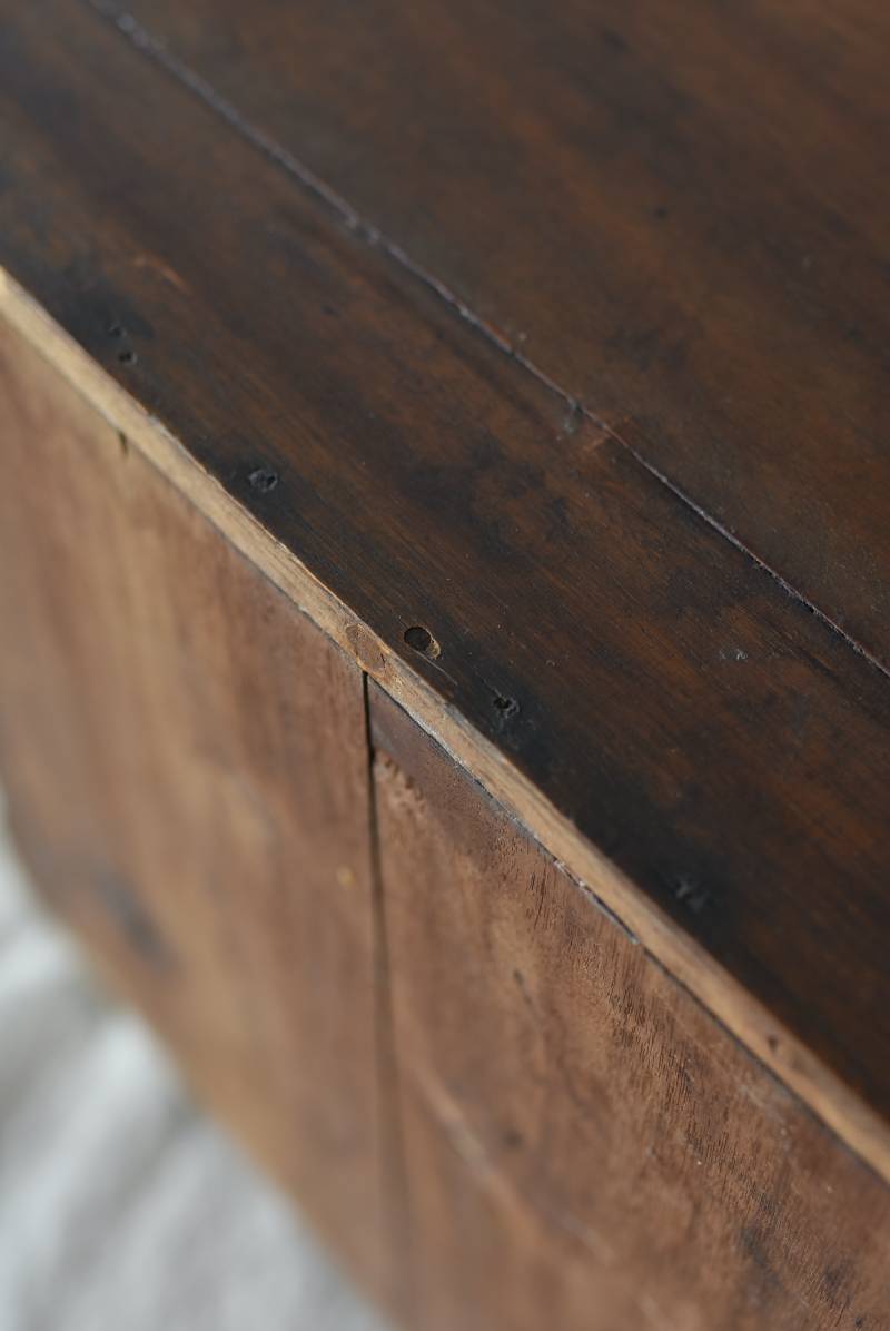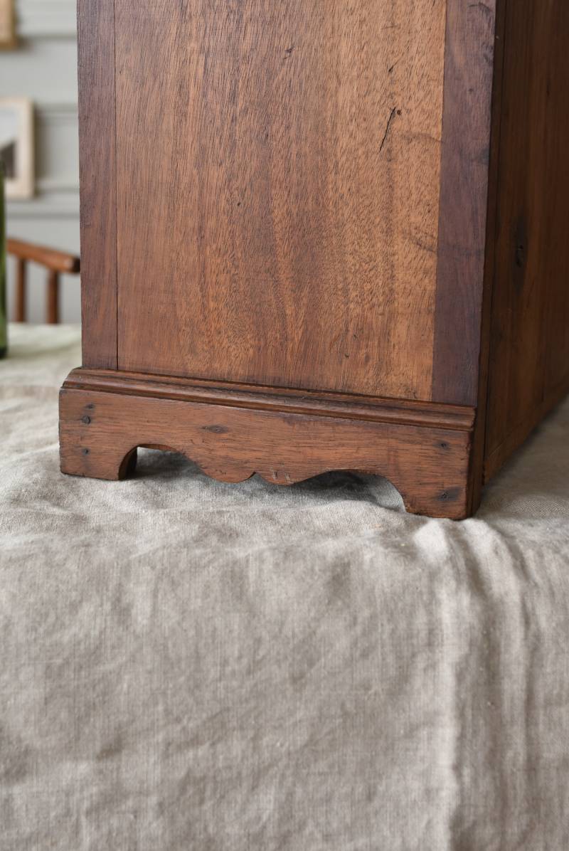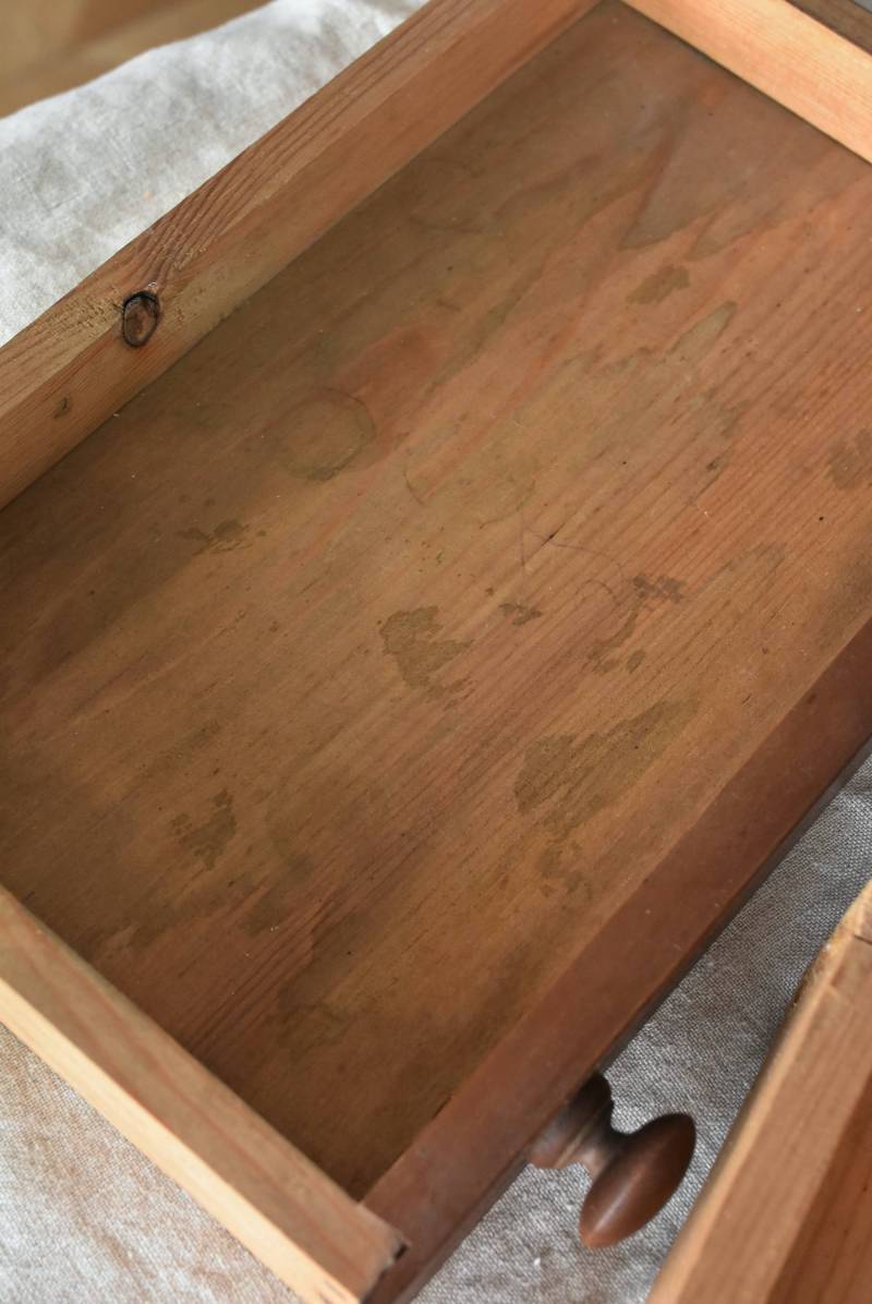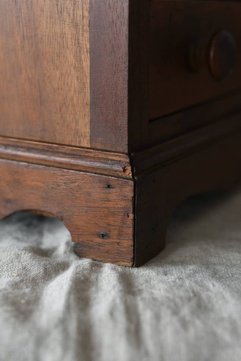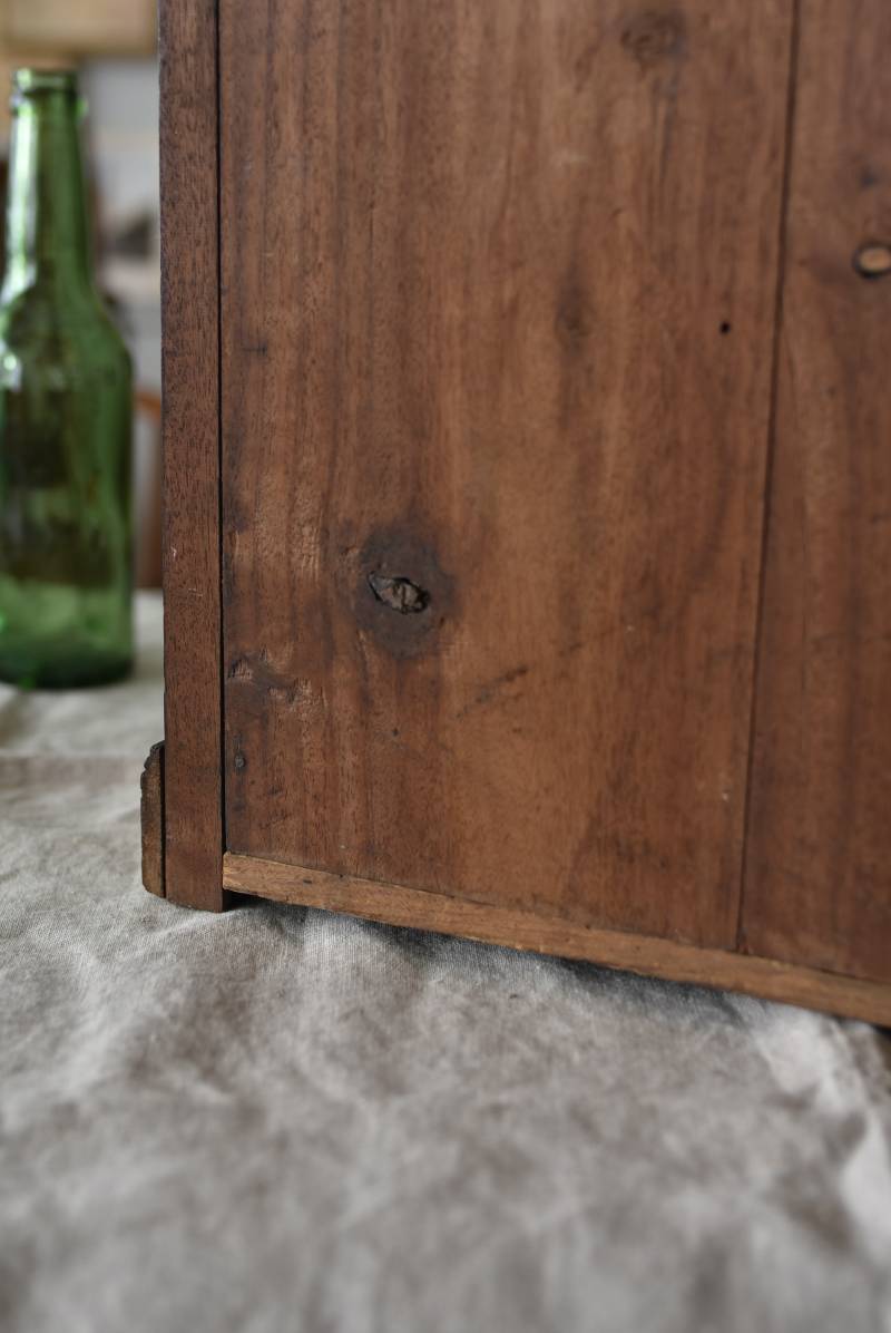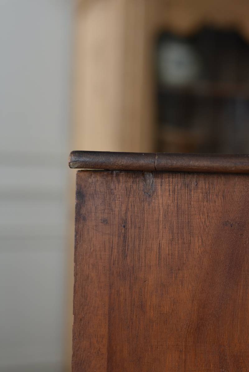 フランスの4段ミニチェスト。 こっくりとした深みのあるチョコレートブラウンカラーのボディが落ち着いた印象を漂わせてくれる佇まい。ころんとした丸い木製のツマミは手に馴染み、デザインのアクセントとして可愛らしいイメージをもたらしてくれます。小ぶりなサイズ感ですが引き出しは4つ設けられており、細かなものをしっかりと仕分けて収納できる機能性にも優れた逸品に。 脚元の優雅な曲線ラインがさりげなく、卓上の雰囲気をグッと高めてくれるクラシカルな雰囲気のアイテムです。 W 約32.5cm D 約19.5cm H 約32cm 引き出し内寸(1段目) W約23.8cm×D約13.5cm×H約2.5cm 引き出し内寸(2.3.4段目) W約23.8cm×D約13.5cm×H約4cm