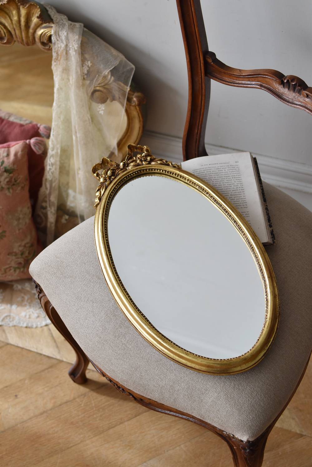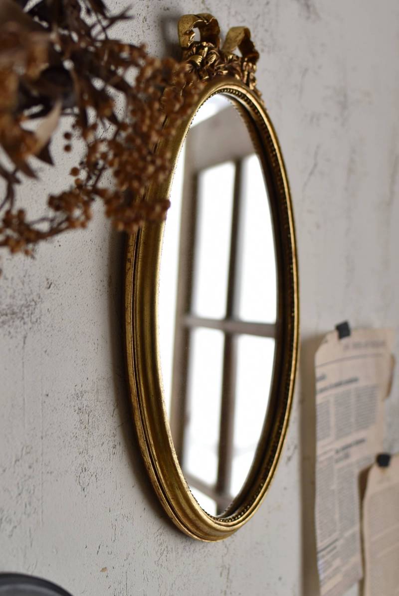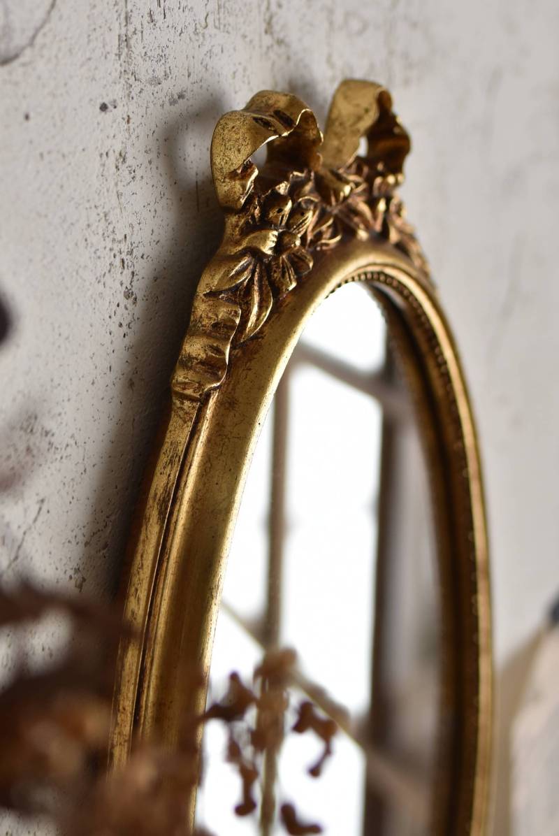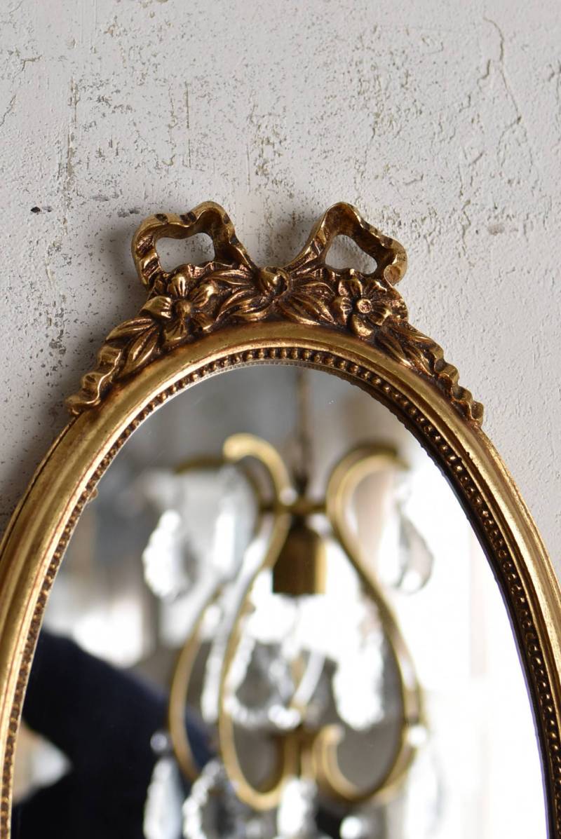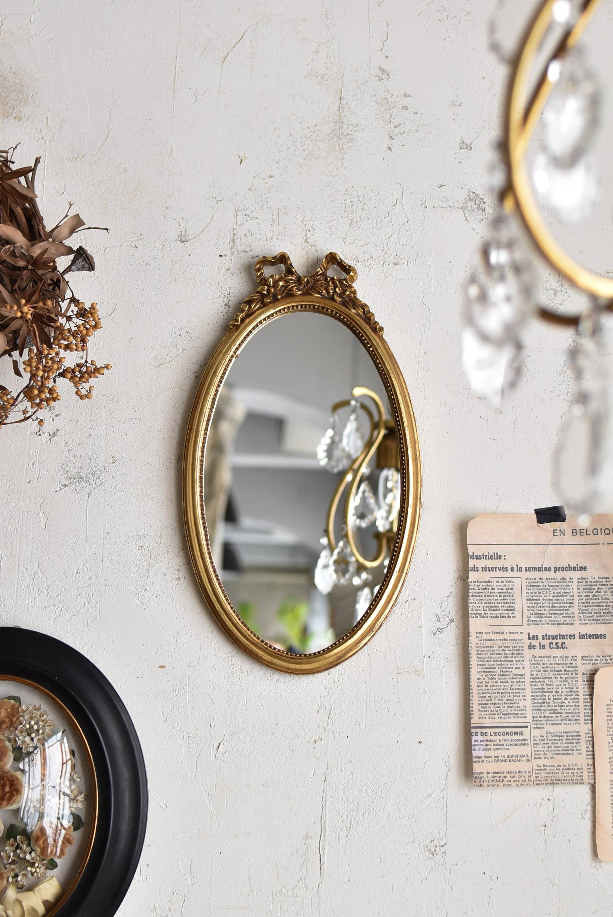 縦長シルエットになったフランスのオーバルミラー。 お花とリボンが合わさった装飾が施されており、波打つような華奢な姿から楚々とした美しさのある姿です。深みのあるゴールドカラーによって壁面を優雅に彩ってくれ、すっきりとした丸みのあるフォルムが派手すぎずに取り入れていただけます。 鏡面には細やかなシミなどが見受けられますが、歪みなどはなく比較的綺麗な状態かと思います。細やかなパール装飾で縁取られたデザインによってミラーが引き立ち、小ぶりながらもしっかりと計算された丁寧な作りです。 W 約22.5cm D 約3cm H 約40cm 鏡面積 W約18cm×H約32cm 重量 約0.9kg