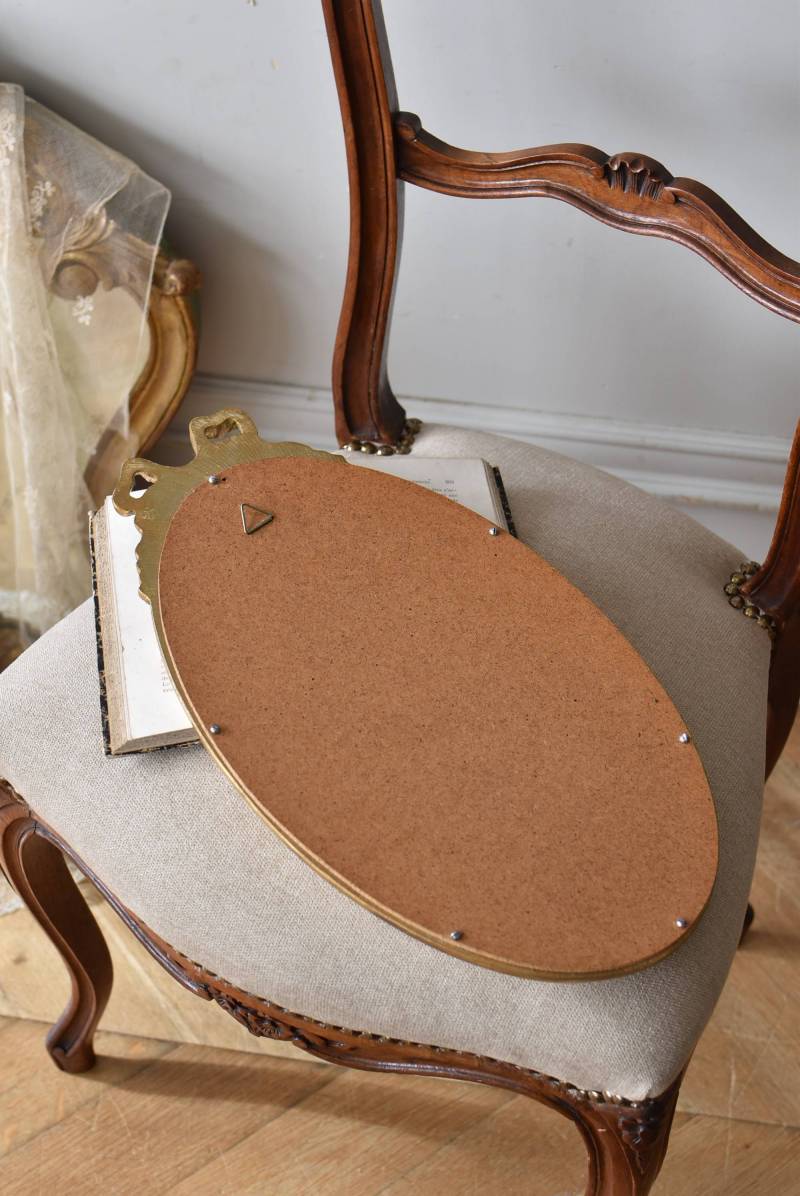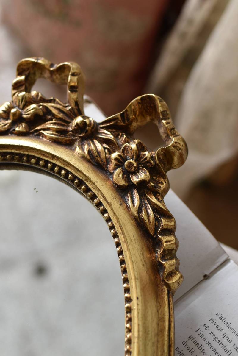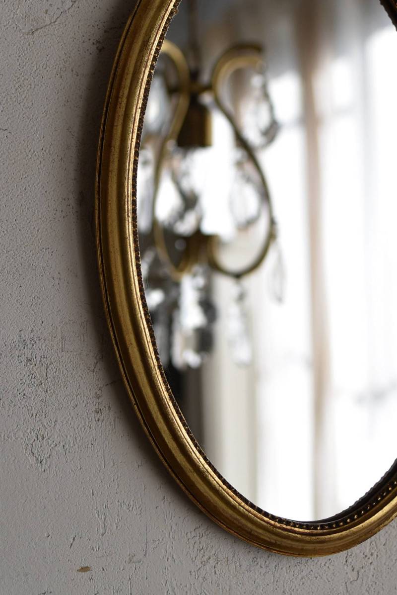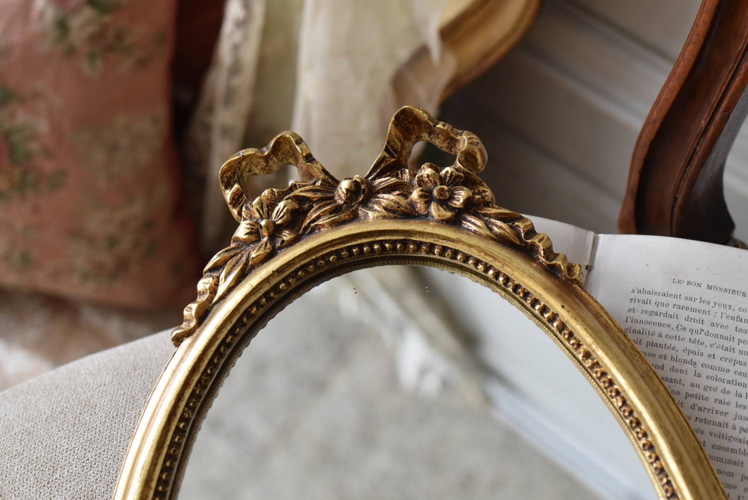 縦長シルエットになったフランスのオーバルミラー。 お花とリボンが合わさった装飾が施されており、波打つような華奢な姿から楚々とした美しさのある姿です。深みのあるゴールドカラーによって壁面を優雅に彩ってくれ、すっきりとした丸みのあるフォルムが派手すぎずに取り入れていただけます。 鏡面には細やかなシミなどが見受けられますが、歪みなどはなく比較的綺麗な状態かと思います。細やかなパール装飾で縁取られたデザインによってミラーが引き立ち、小ぶりながらもしっかりと計算された丁寧な作りです。 W 約22.5cm D 約3cm H 約40cm 鏡面積 W約18cm×H約32cm 重量 約0.9kg