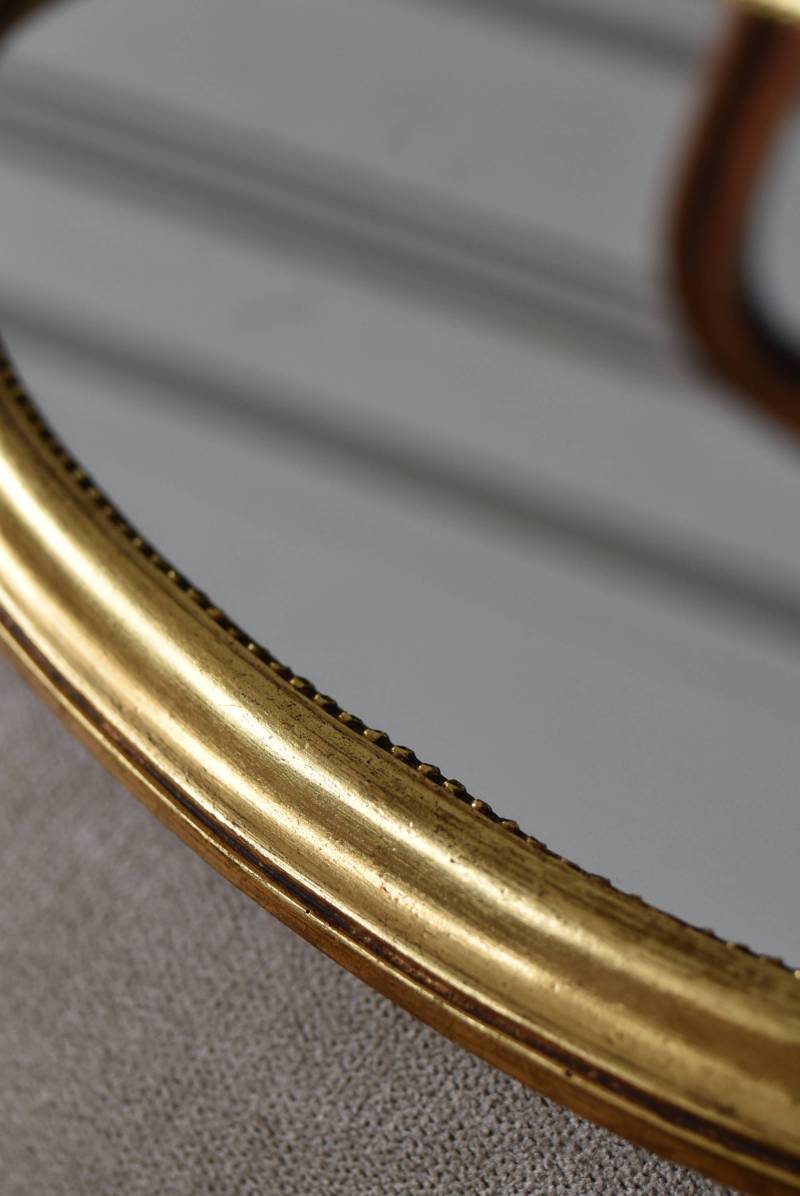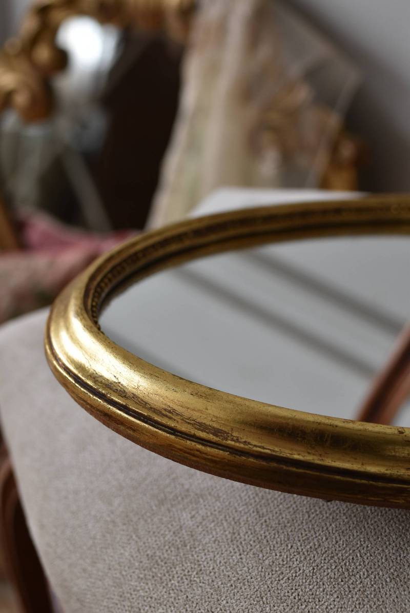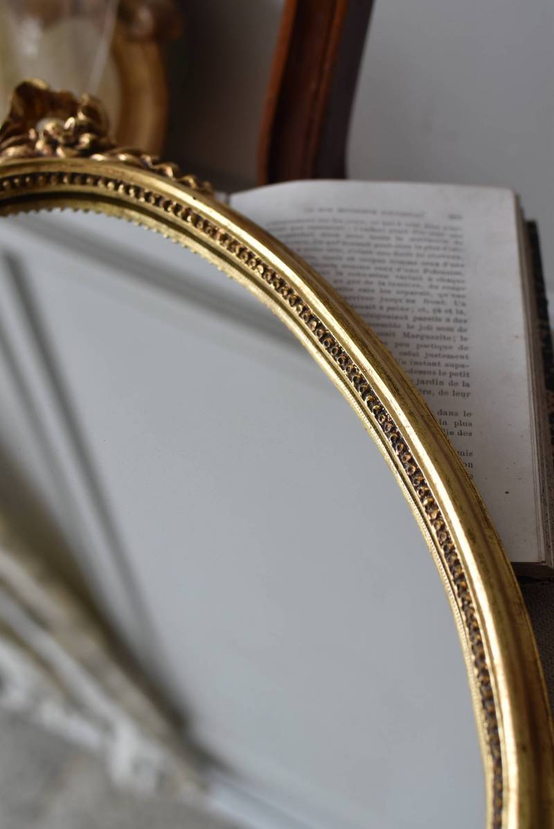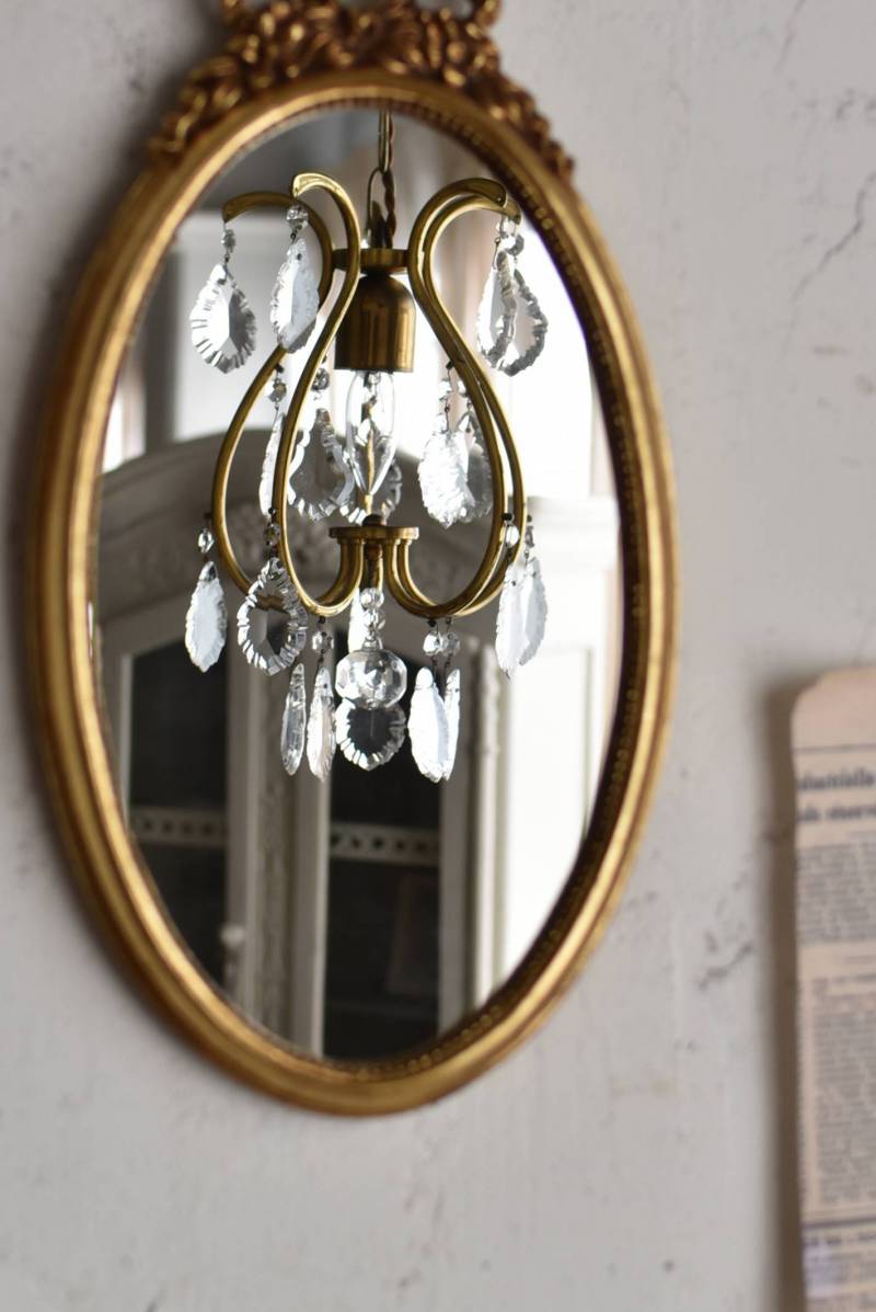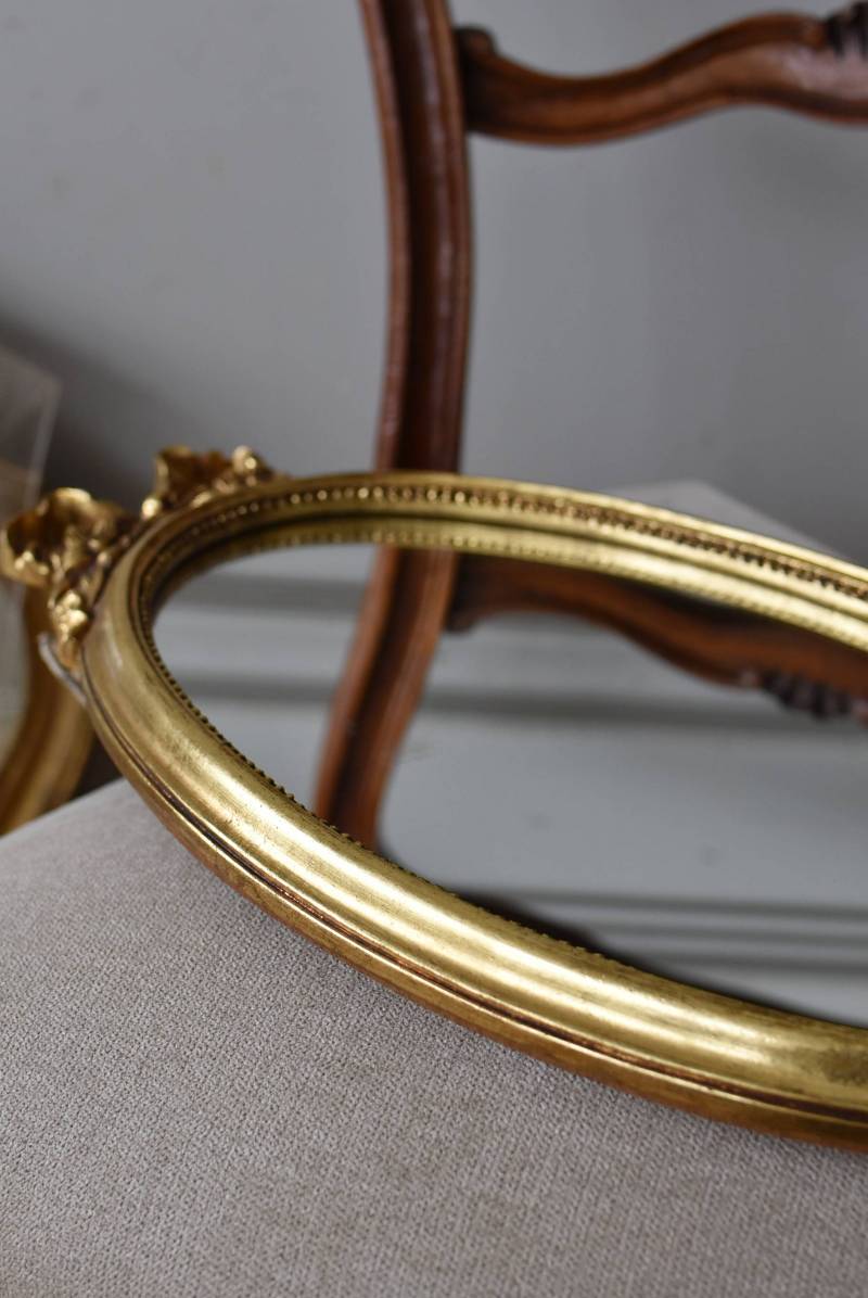 縦長シルエットになったフランスのオーバルミラー。 お花とリボンが合わさった装飾が施されており、波打つような華奢な姿から楚々とした美しさのある姿です。深みのあるゴールドカラーによって壁面を優雅に彩ってくれ、すっきりとした丸みのあるフォルムが派手すぎずに取り入れていただけます。 鏡面には細やかなシミなどが見受けられますが、歪みなどはなく比較的綺麗な状態かと思います。細やかなパール装飾で縁取られたデザインによってミラーが引き立ち、小ぶりながらもしっかりと計算された丁寧な作りです。 W 約22.5cm D 約3cm H 約40cm 鏡面積 W約18cm×H約32cm 重量 約0.9kg