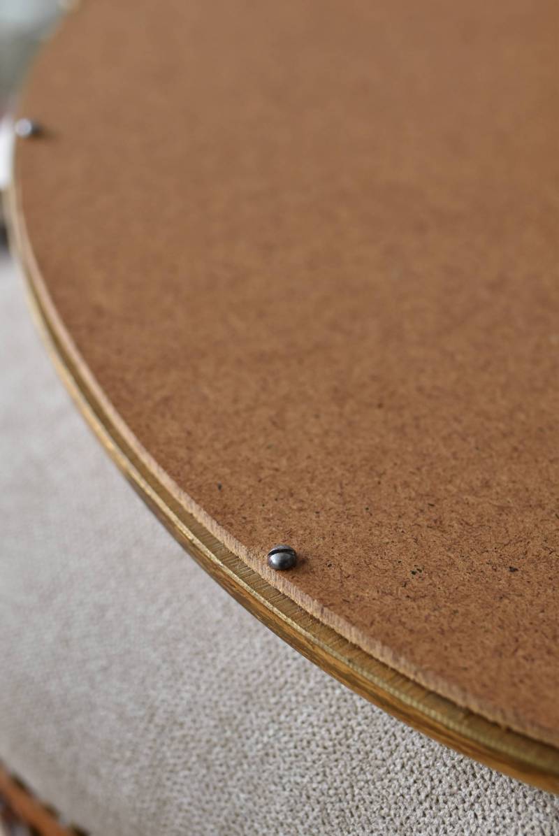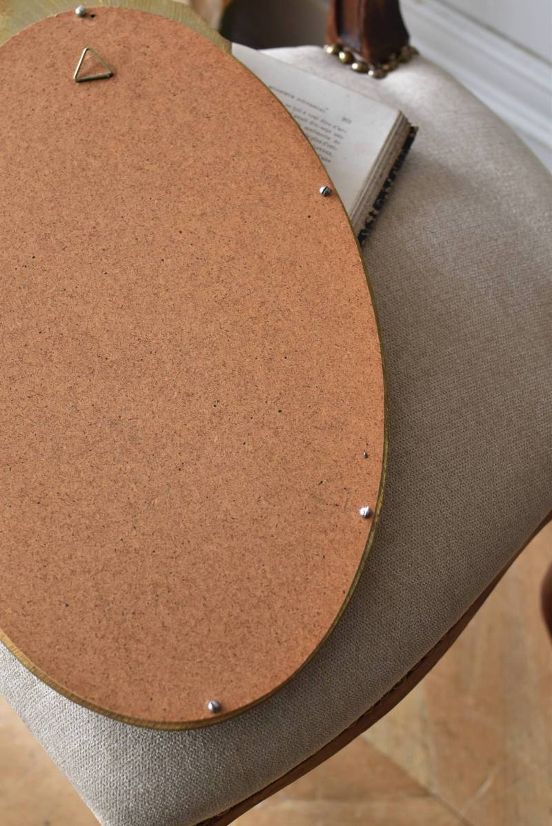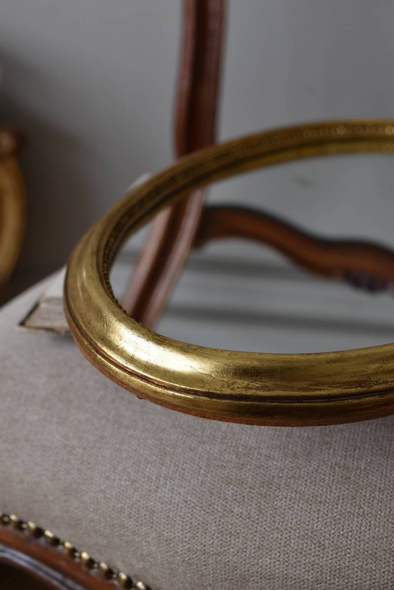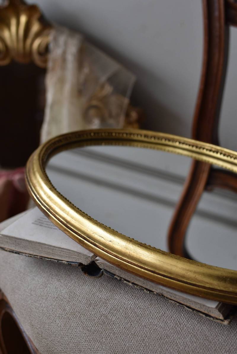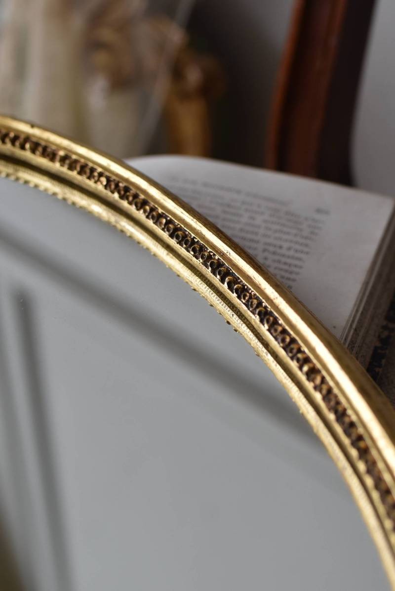 縦長シルエットになったフランスのオーバルミラー。 お花とリボンが合わさった装飾が施されており、波打つような華奢な姿から楚々とした美しさのある姿です。深みのあるゴールドカラーによって壁面を優雅に彩ってくれ、すっきりとした丸みのあるフォルムが派手すぎずに取り入れていただけます。 鏡面には細やかなシミなどが見受けられますが、歪みなどはなく比較的綺麗な状態かと思います。細やかなパール装飾で縁取られたデザインによってミラーが引き立ち、小ぶりながらもしっかりと計算された丁寧な作りです。 W 約22.5cm D 約3cm H 約40cm 鏡面積 W約18cm×H約32cm 重量 約0.9kg